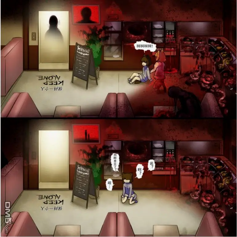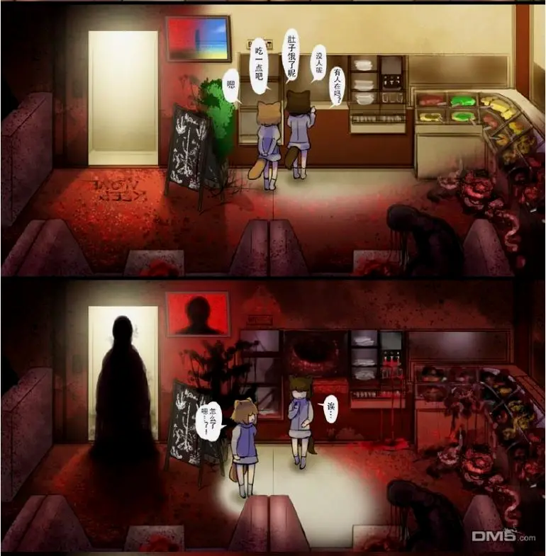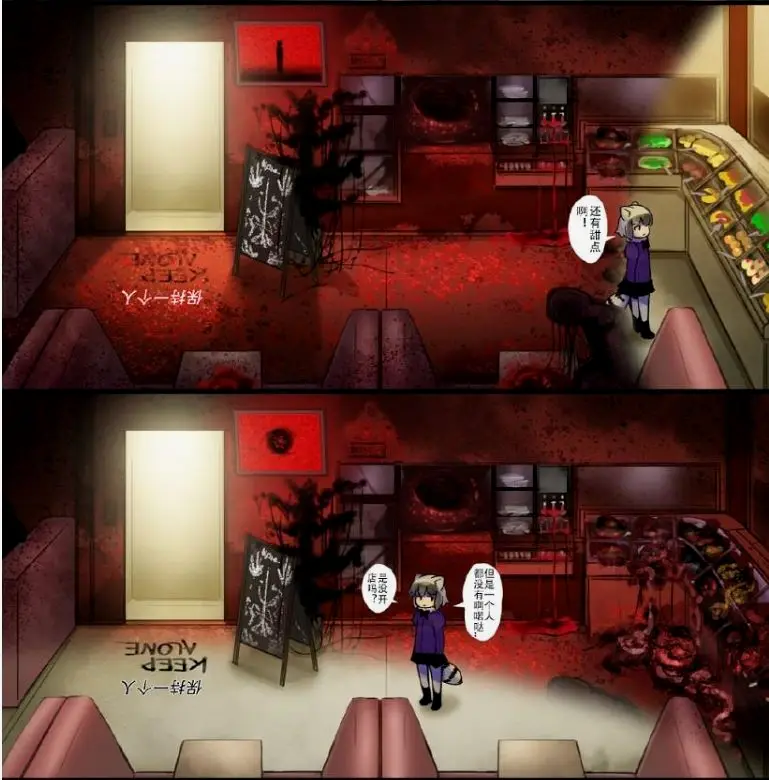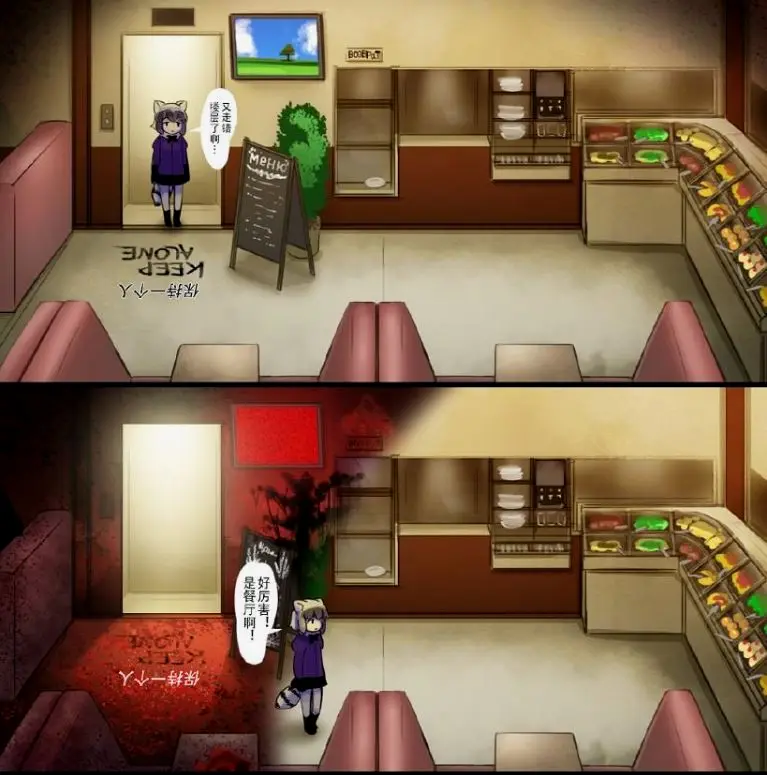 问题是谁会消失?这和地板上“保持一个人”的警告有什么联系?仔细观察最后一张图,发现消失的人在消失前曾进入了“不正常餐厅”的范围,也就是另一个人的视野盲区。这是否意味着只有进入餐厅的人的视野内才是安全区域?当两个人一直保持在彼此的视野范围内能否安全进入餐厅?当大量人同时涌入餐厅导致餐厅内每一个角落被多个人同时观测,这一现象是否会导致餐厅内机制失效?不正常餐厅内风景画的变化是否有着某种暗示?