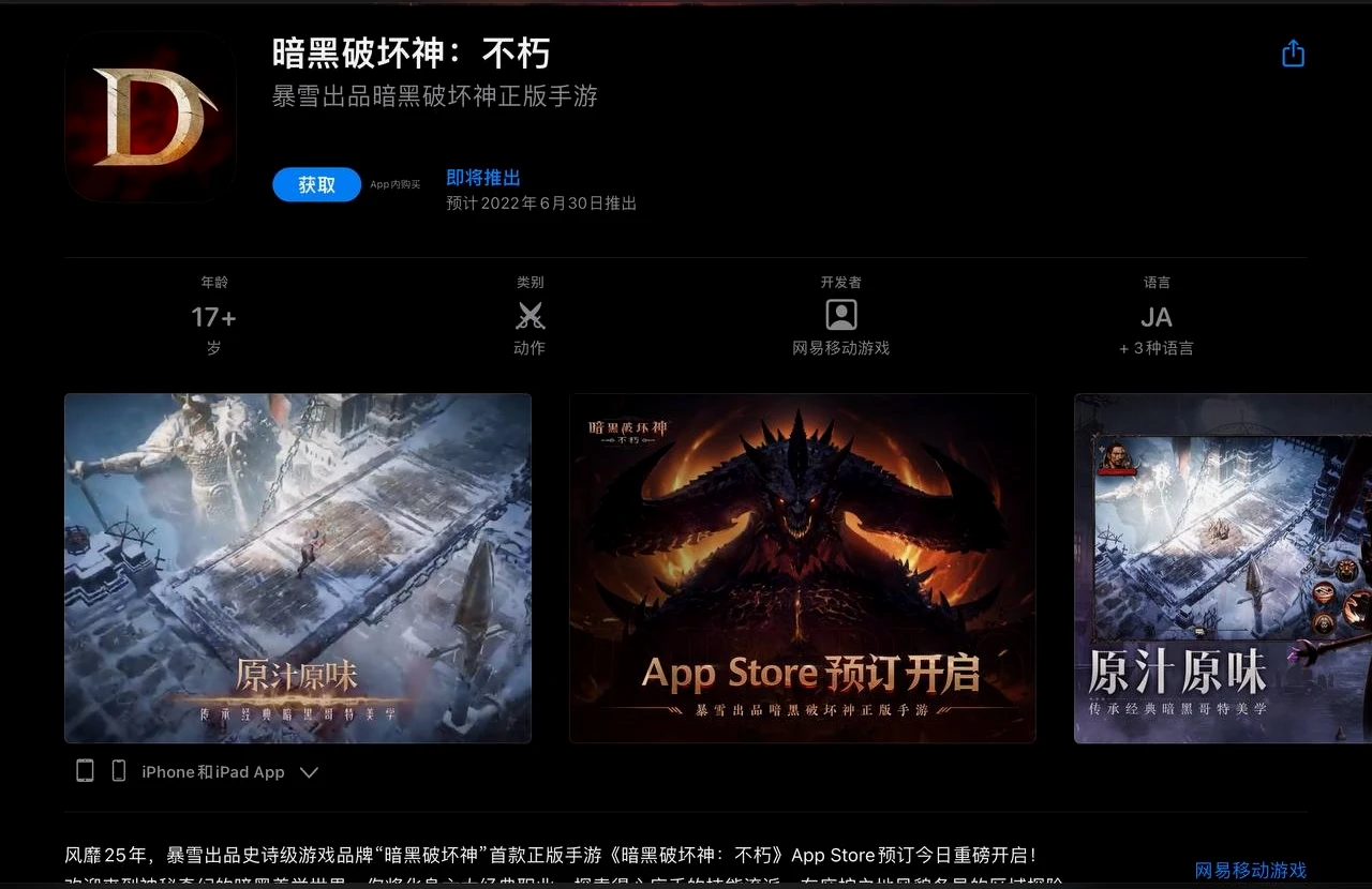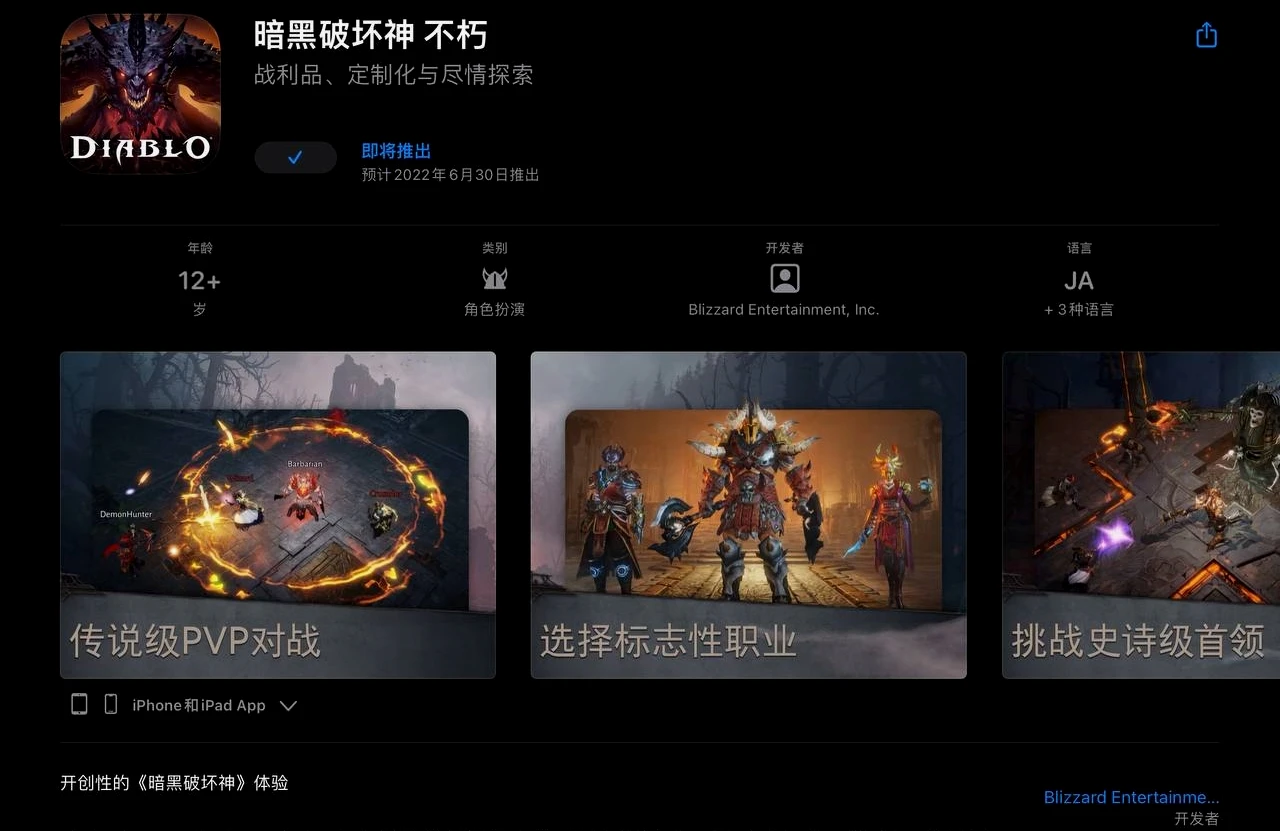 暴雪在美服和国服的 App Store 上架了《暗黑破坏神:不朽》,同时开启了预定活动。
