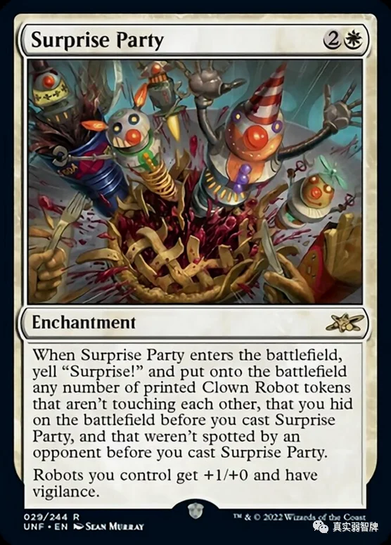 8.提前打印好一堆小小的小丑机器人衍生物。这样会比较好藏起来。建议带上你最大号的牌盒、不透明水壶、记血本。在你对手来之前,把这些小小的衍生物压在牌盒、水壶等物件下面。一旦你释放Surprise Party,你就可以说“Surprise motherfxxker!” 然后展示这些你早就藏好的小 token 下回合直接击毙对手!