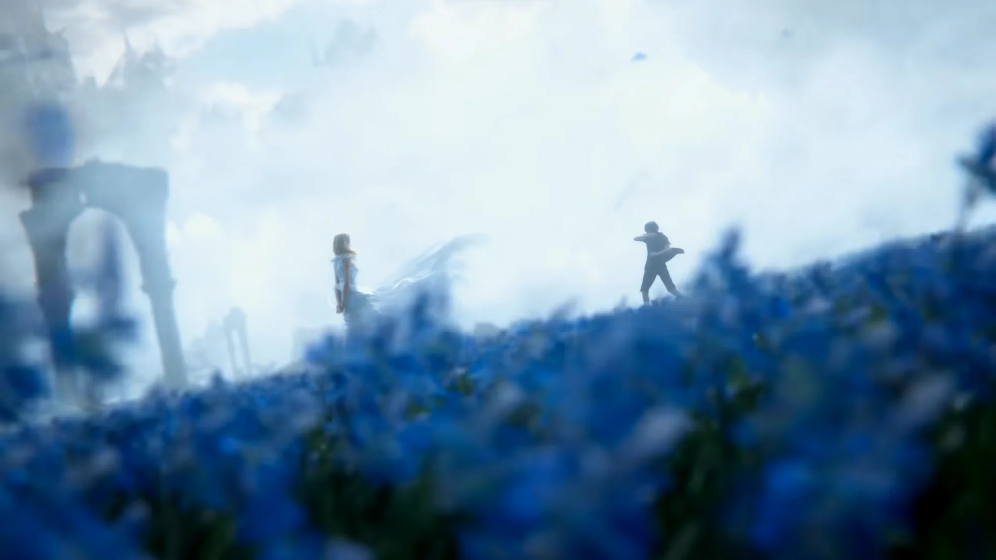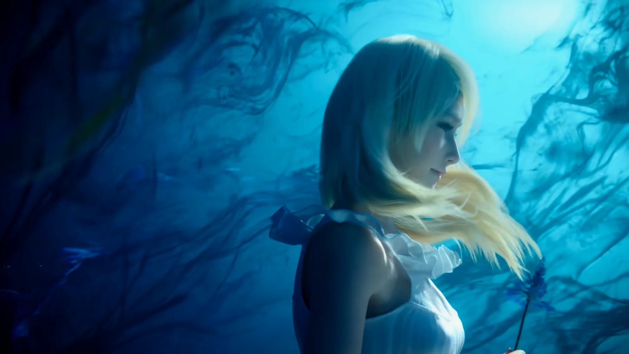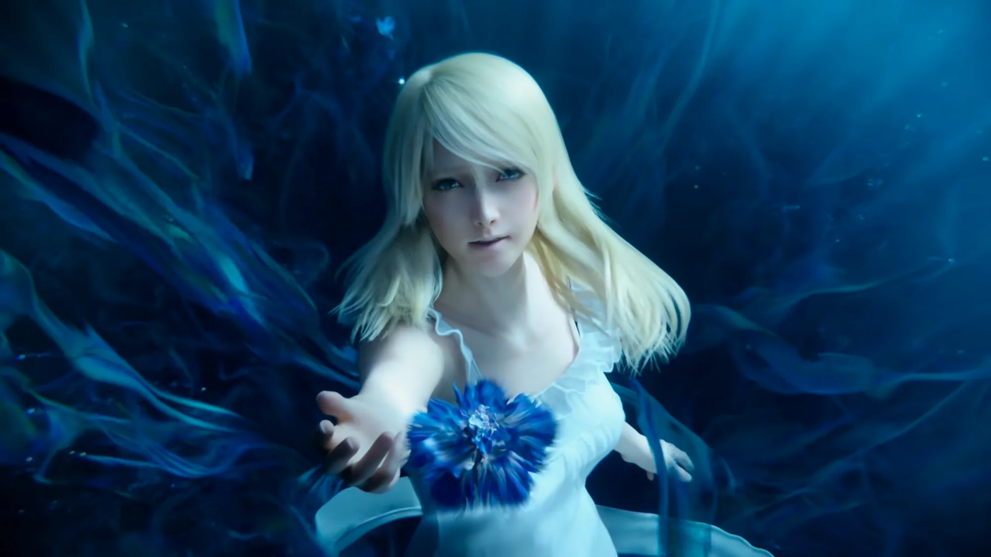忧郁蓝色的花海逐渐化为无法到达的深海,包裹着露娜,缓缓下沉。海面照耀而来的光芒让露娜的婚裙增添了几分神圣,而这光芒最终也随同花的消逝而暗淡了,留给男主和玩家的,只有无尽的遗憾。能将死亡刻画得如此浪漫的,恐怕也只有最终幻想了吧。