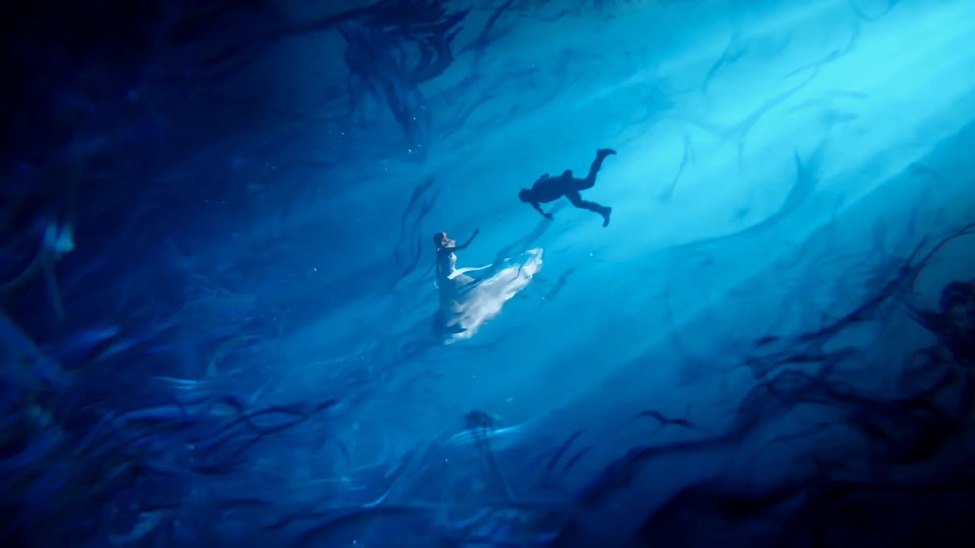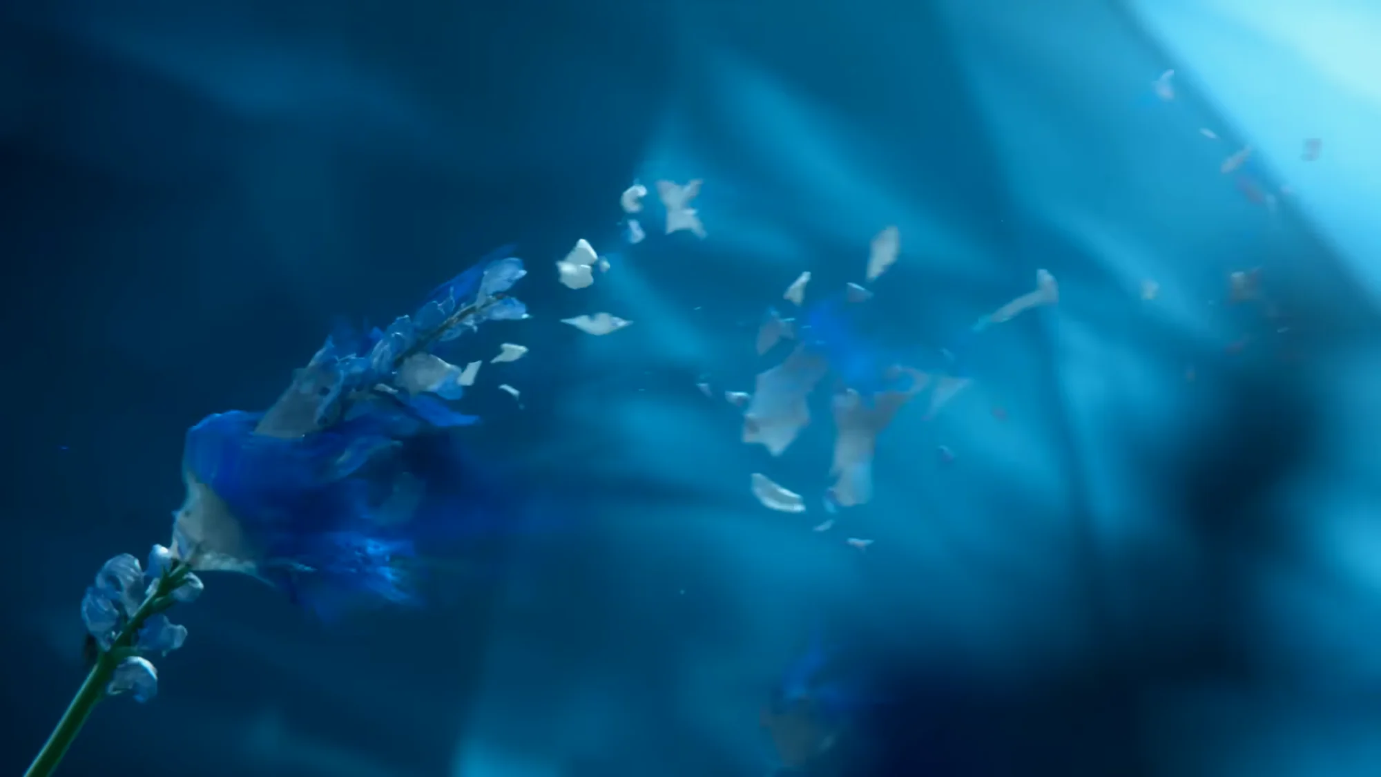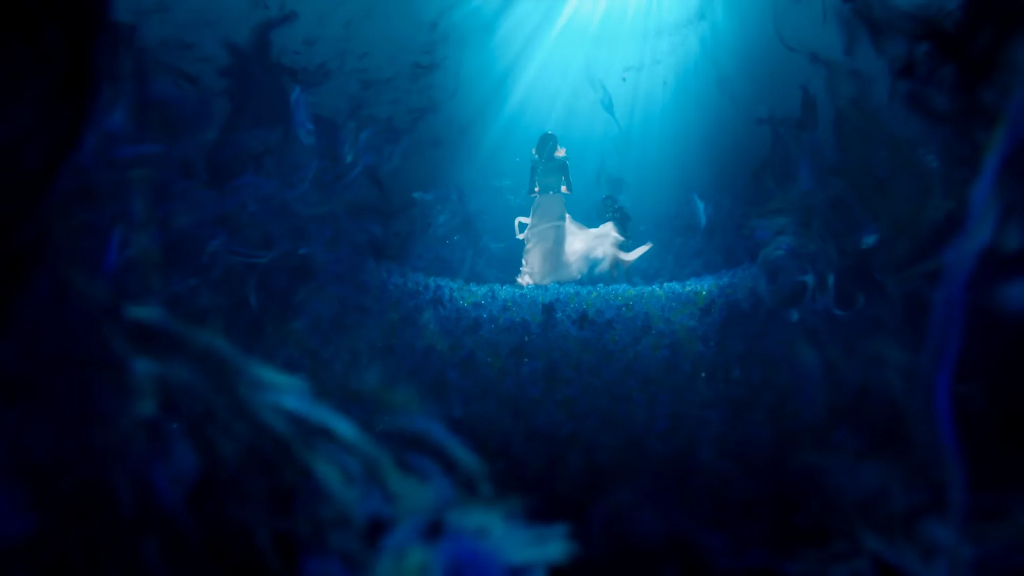 忧郁蓝色的花海逐渐化为无法到达的深海,包裹着露娜,缓缓下沉。海面照耀而来的光芒让露娜的婚裙增添了几分神圣,而这光芒最终也随同花的消逝而暗淡了,留给男主和玩家的,只有无尽的遗憾。能将死亡刻画得如此浪漫的,恐怕也只有最终幻想了吧。