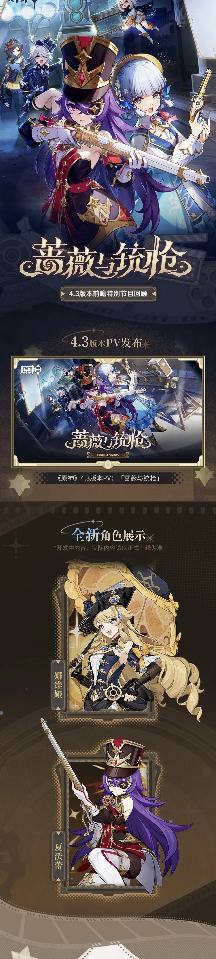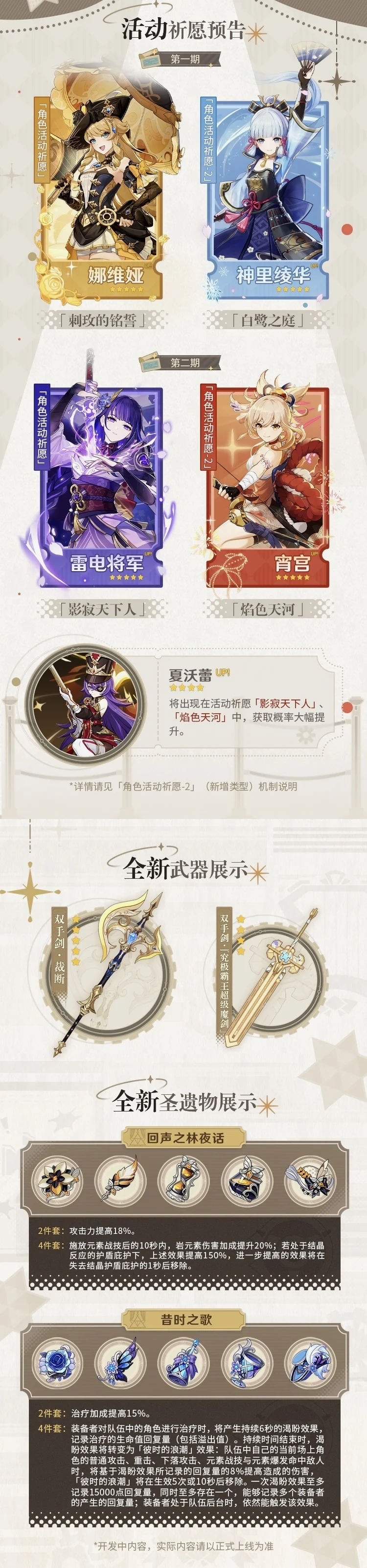 角色卡池方面,上半将是 娜维娅+绫华,下半 雷电将军+宵宫+夏沃蕾(四星) 。娜维娅传说任务也将同步上线。