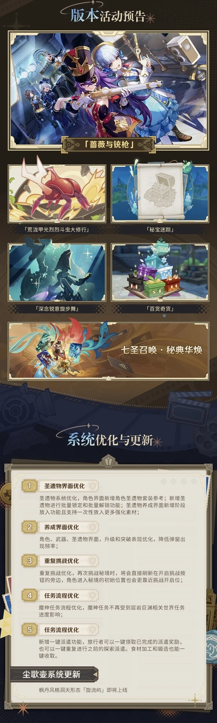 系统优化方面,将对圣遗物系统、任务派遣、角色养成、副本挑战等进行相关优化,提升玩家的游戏体验。