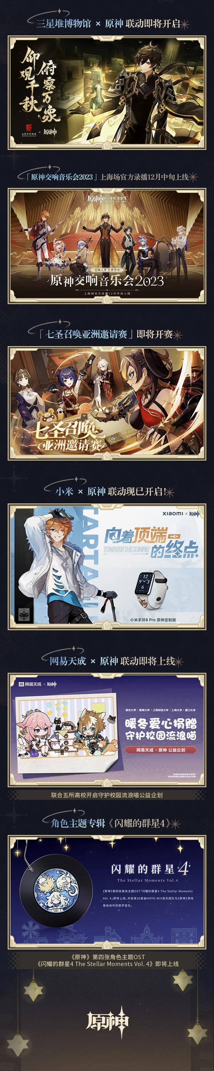 其他方面,明年初将举办七圣召唤亚洲邀请赛。除原神线上音乐会「无际之旅的旋律」将于12月22日举办外,原神2023交响音乐会官方录播也即将上线。联动方面,公布原神与小米,网易天成,三星堆文化的相关联动情报。