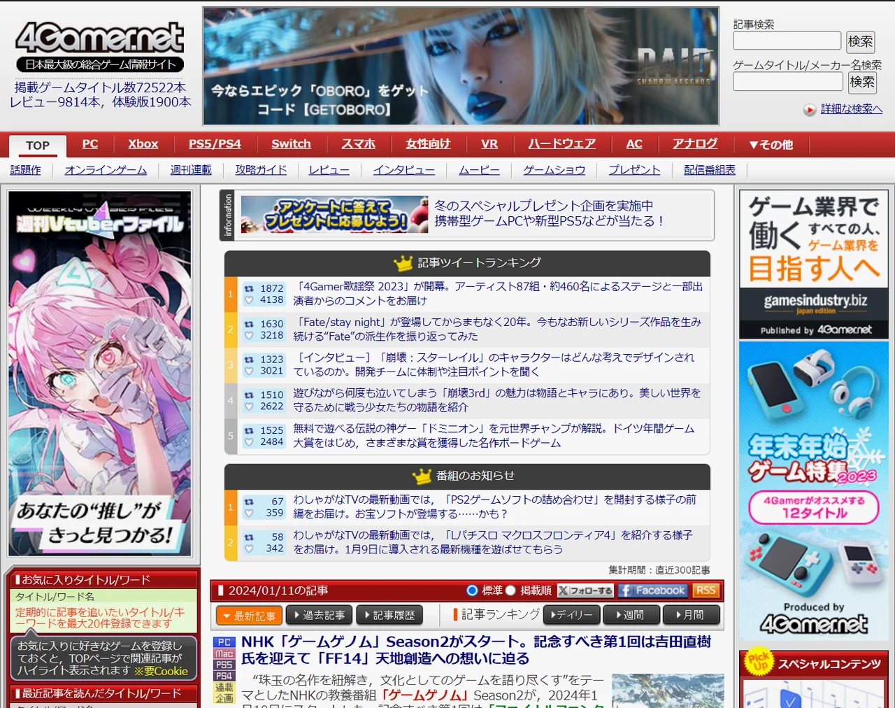 ②Fami通:老牌电子游戏杂志的官网,内容包括但不限于游戏业界的新闻情报、人物采访、新游宣传、游戏测评、新游戏宣传PV等。