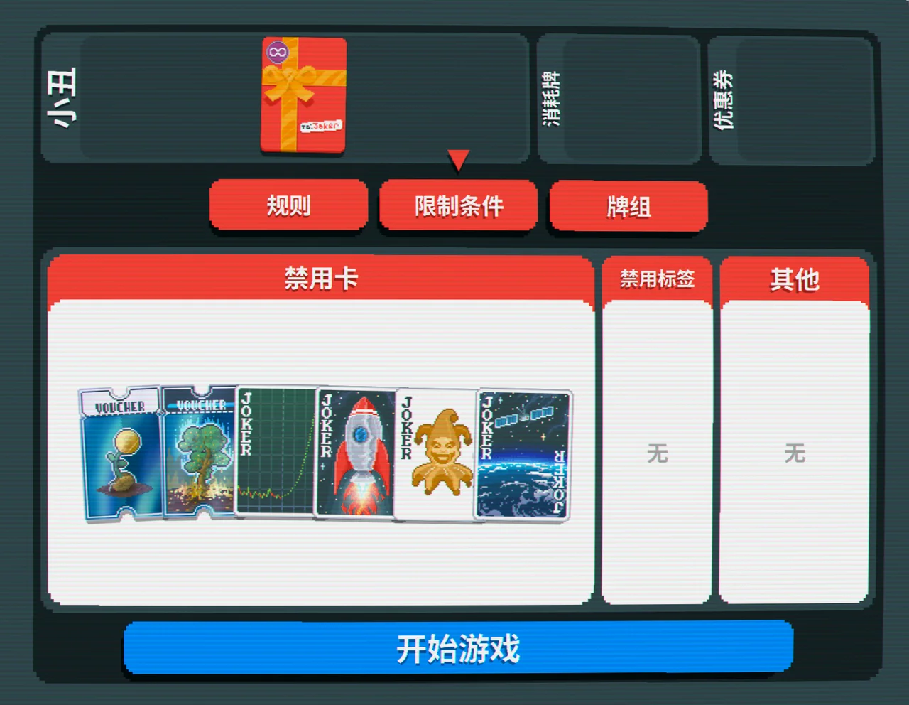 初始携带缟玛瑙、重影两张永恒小丑,两张月亮塔罗,一张魔术优惠券,使用方格牌组。