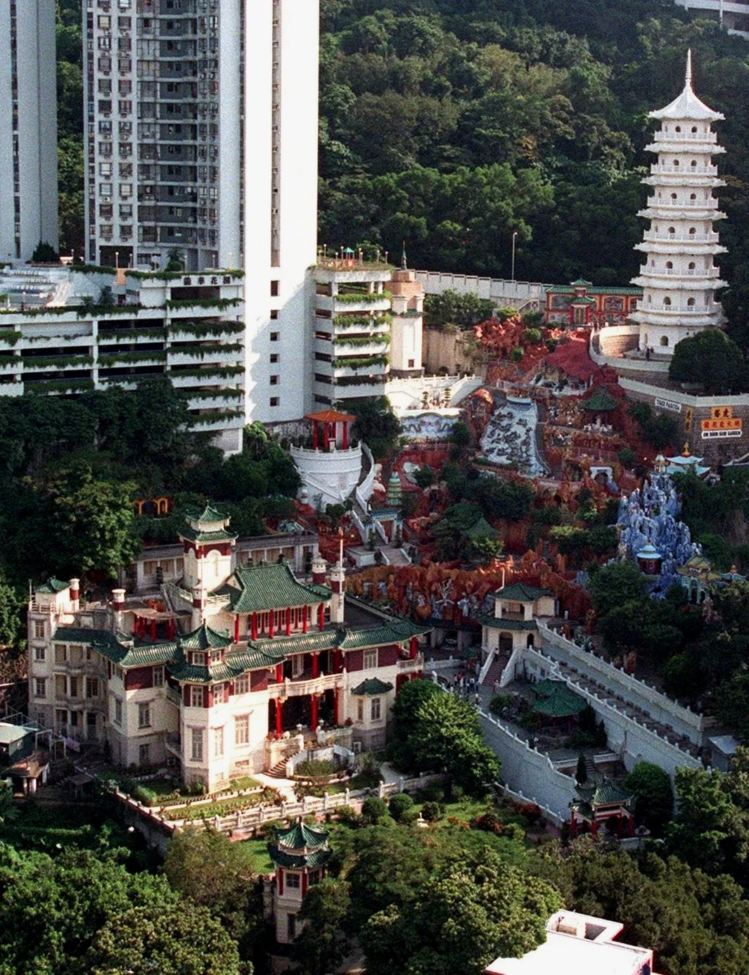 继续沿大坑道向上攀行,不久便可见到那座充满传奇色彩的“虎豹别墅”。这座建于1930年代的别墅,曾是实业家胡文虎家族的私人府邸。随着时间推移,胡文虎的后人将大部分地皮出售给地产商开发为高层住宅,许多附属建筑也随之拆迁,如今仅保留了别墅的主体部分。去年,别墅重新开放了预约团体参观活动,但仅限周末,不巧当日是工作日,未能入内,只能在外围绕行观望。