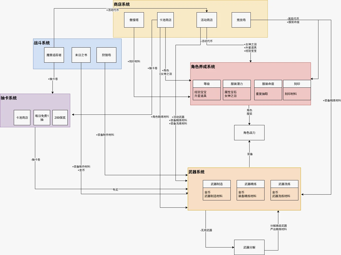 装备系统通过洗练与精炼大量需求分解装备产出的材料,而获取装备制作材料本身又需要大量投入体力进入与主线副本进度绑定的材料本,同时每个阶段都会消耗大量金币 。此系统的提升曲线为对数型,前期能给玩家轻松更换装备与强化属性的正反馈循环,后期追求完美词条则能补上版本内容被消耗完毕的匮乏期 。装备系统还有一个大的特点在于可被不同角色装备,使得中期一套角色队伍的培养成本降低,同时也有专武的消费区间,实现了对小R、大R的双重友好 。