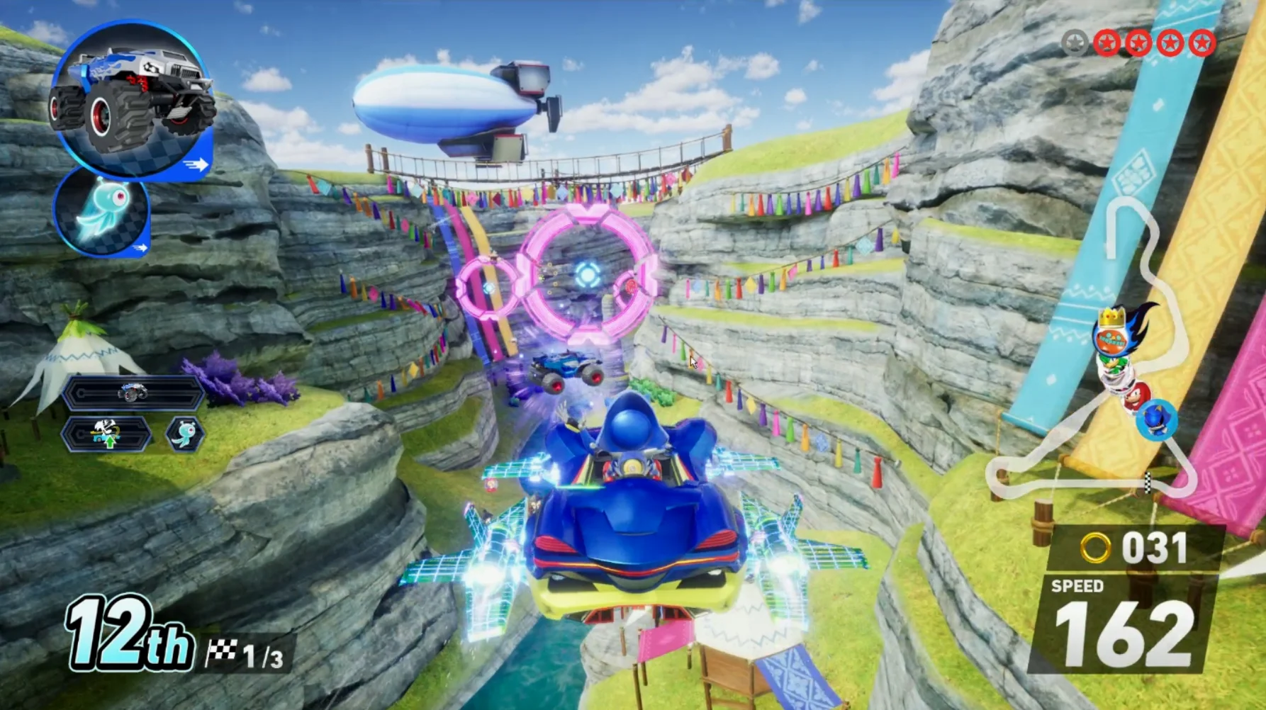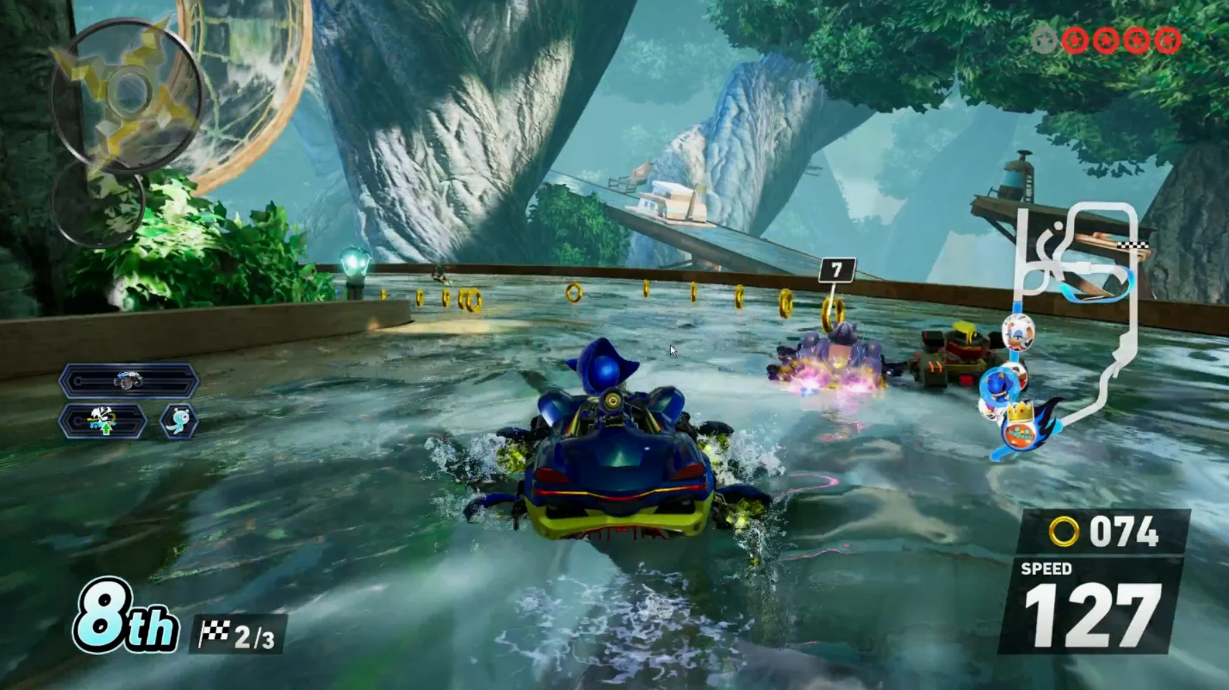 除此之外,游戏还延续了《索尼克全明星赛车:变形(Sonic & All-Stars Racing Transformed Collection)》的特色,玩家们的赛车会根据赛道的不同情况进行变形,在河道时会变为快艇,水花四溅;再跑两步,又装上飞翼冲向天空。陆地形态依靠赛车漂移加速,飞行形态可以上下移动通过空中的氮气圈加速,而水上形态则需要蓄力跳跃获得空中的道具或是穿越捷径。这种陆地、天空、水面三段式玩法的不断交错,像是在三种不同的游戏之间来回切换,虽然一开始并不好熟悉,但在上手后就会有种得心应手的成就感。 最后,《索尼克赛车 交叉世界》的赛道演出和音效也非常优秀,画面整体沿用了索尼克系列明快鲜艳的卡通风格。在不同赛道中,你能看到色彩饱满的地形和丰富的环境特效,还有着非常多的索尼克经典元素融入了赛道之中。