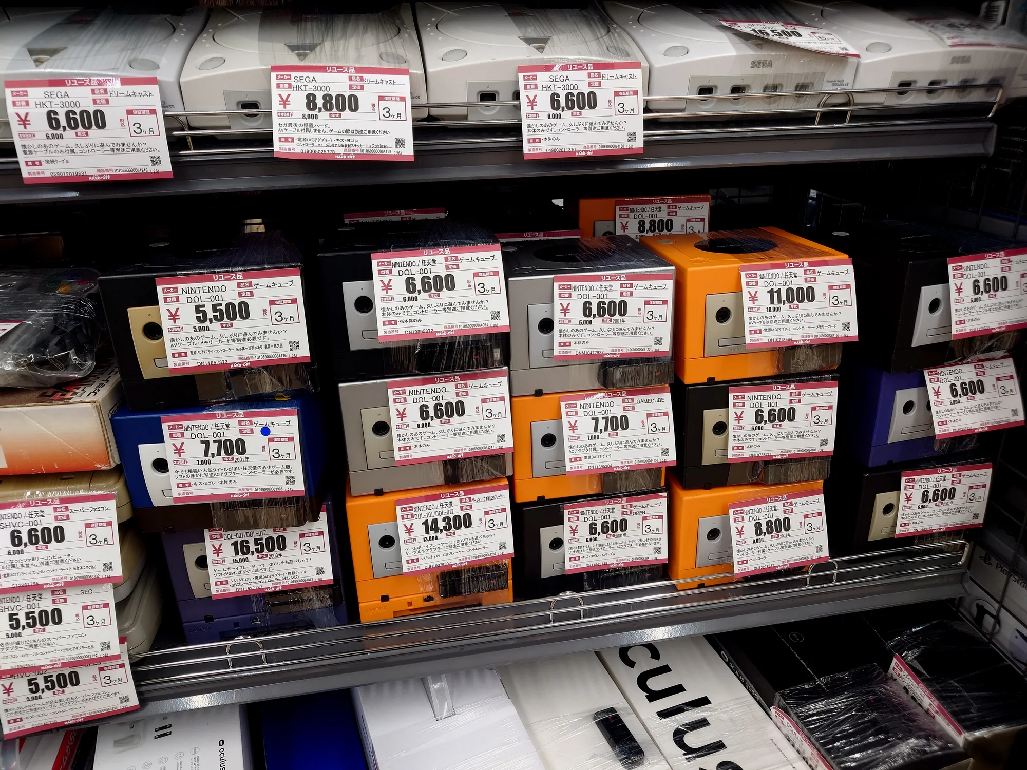 主机我单独挑出来说,本体购买是Hardoff的优势,大量陈列从fc到ps2的本体,保鲜膜一包任君挑选。按照橙色其实fc、sfc、n64、ngc、dc、ps、ps2这些据置机的价格从4k~8k都有,价格相对统一,箱说全的本体在1w上下也是可以挑到橙色不错的,但需要长时间比选。掌机的ws/c/crystal和ngp/c序列的本体由于比较小众,近几年价格还算相对稳定,但天鹅的软件也有涨价趋势。gb、gba、nds、3ds系列属于价格乱区,完成无法掌握趋势,总而言之就是贵。不管哪家线下店gb系列裸机价格已经达到新高,拿gba举例,无箱说橙色一般的本体6、7k已经算是低价,但凡带箱说的都是1w起,gbasp橙色极差的箱说全也要1w2。3ds在之前闲鱼那波抬价之后已经没有正常价格区间,初代3dsジャンク品 (垃圾,无法确认启动状态的)都能卖3、4k,箱说全的本体价格最低也要1w2朝上,new3ds系列根本不会看,因为买不起。2ds价格也涨得飞快,本体基本在6、7k左右可以买到,箱说全的蹦着1w5去了。Nds可能是被3ds涨价波及,也涨了不少。