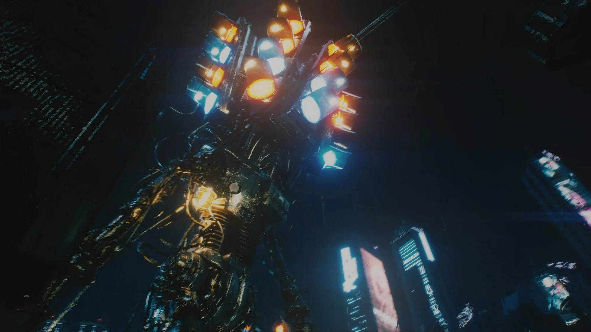 伴随紧张心跳声而来的是窸窸窣窣的爬行声,镜头一转铺天盖地的苍白“抱脸虫”如潮水般向几位“行者”涌了过来。在逃窜的过程中,我们又见到了更多“熟悉的”陌生敌人。一片火海的村庄中矗立着一个压迫感十足的探照灯脑袋怪物,场景转换下霓虹城市的窗外又出现了“红绿灯头”的巨型怪物。最后几个闪过的场景与怪物各不相同,甚至末尾还有一个十分神似香港地区的环境。