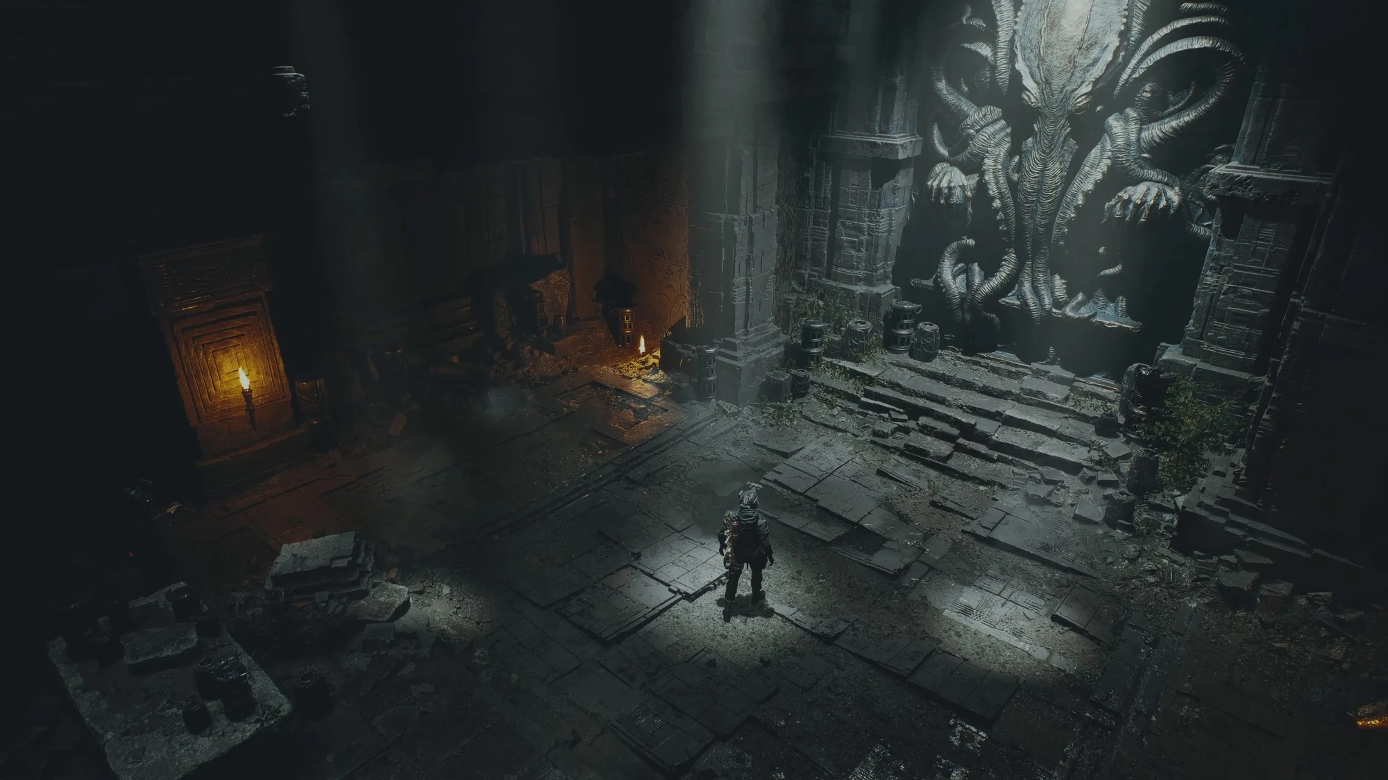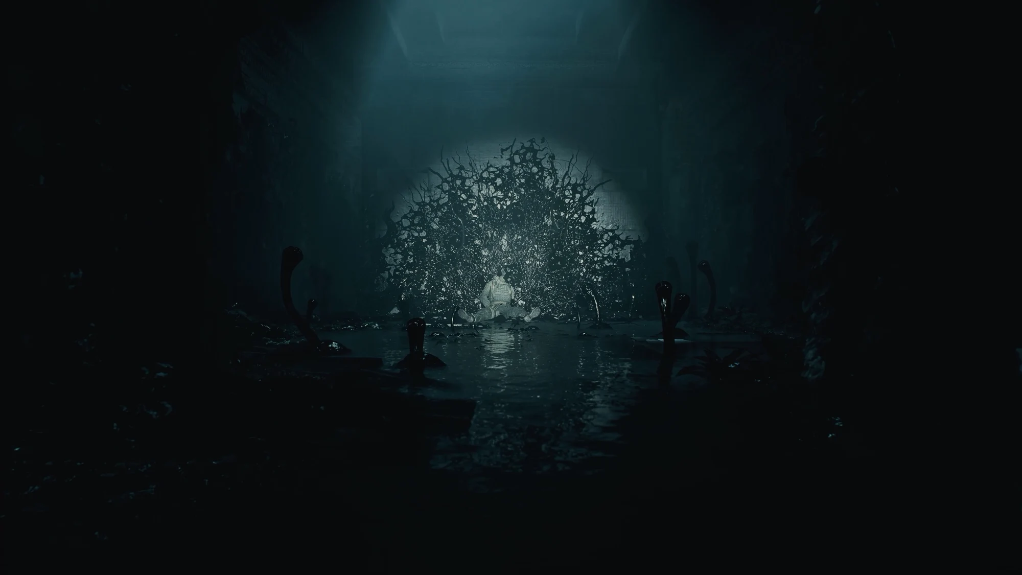 《灰境行者》的首爆预告整体给到我一种“不可知”与“压抑”的紧张感。开场我们在一个重力似乎出现问题、周围石子碎片向天上飘去的环境中醒来,周围的建筑物也都“飘在”空中。而下一场景就切换到了黑暗的诡异神庙中,一个与沉睡之神——拉莱耶之主神似的克苏鲁巨型雕像被冰冷的光线照亮。接下来的镜头又转到了黏稠的黑水与那经典的小罐子,这里的灵感来源肯定是“异形”宇宙了。