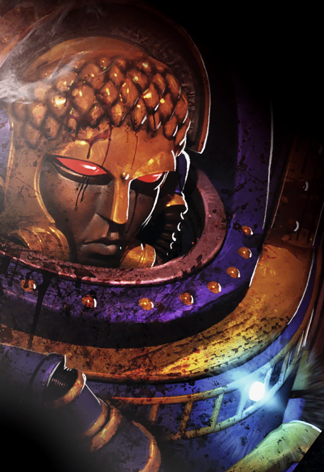 这个佛头头盔是来自伊利昂·梅萨罗,他是战锤30K时期的极限战士百夫长,以及精锐第一连文迪库斯小队的指挥官,在荷鲁斯叛乱期间追击怀言者时战死。