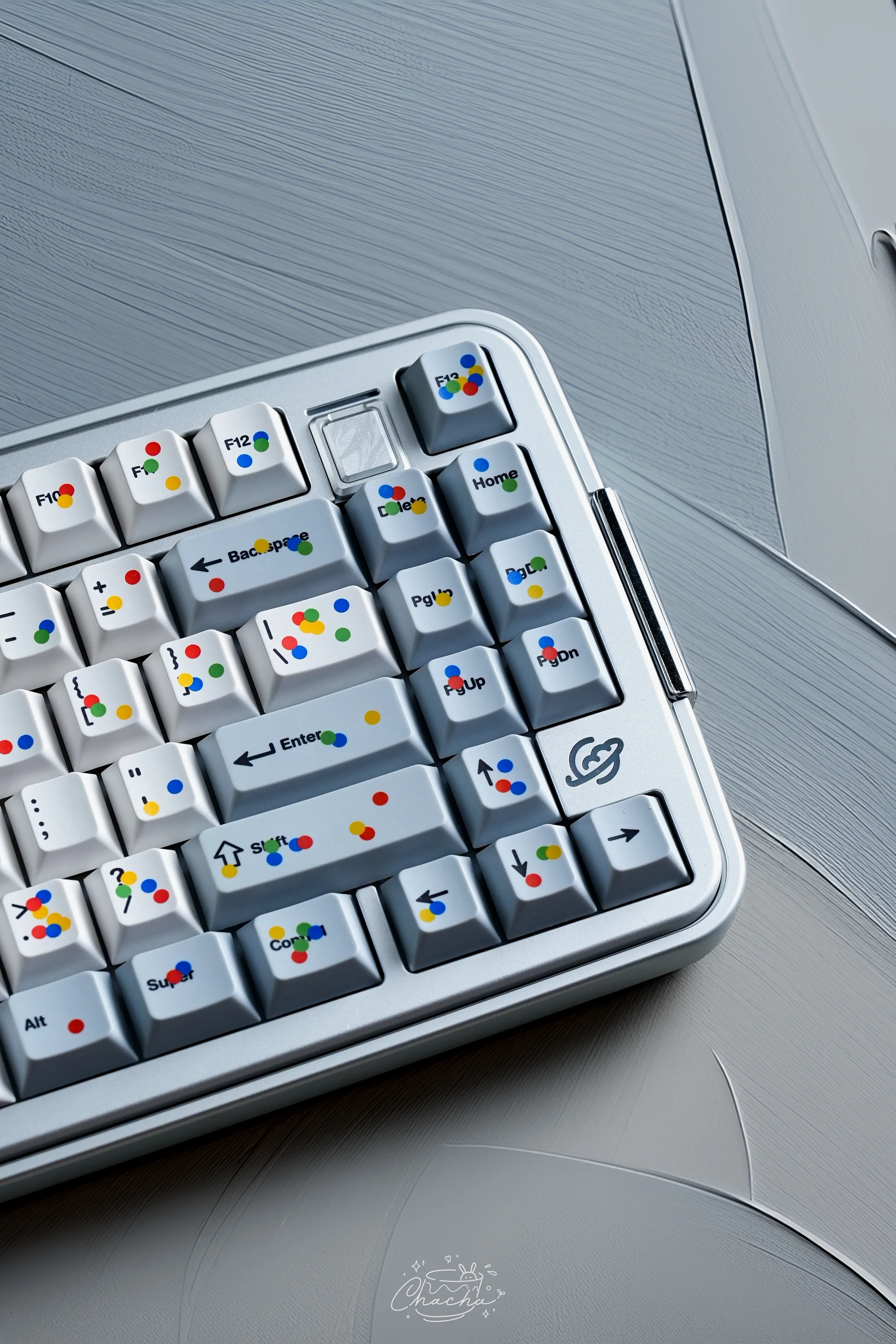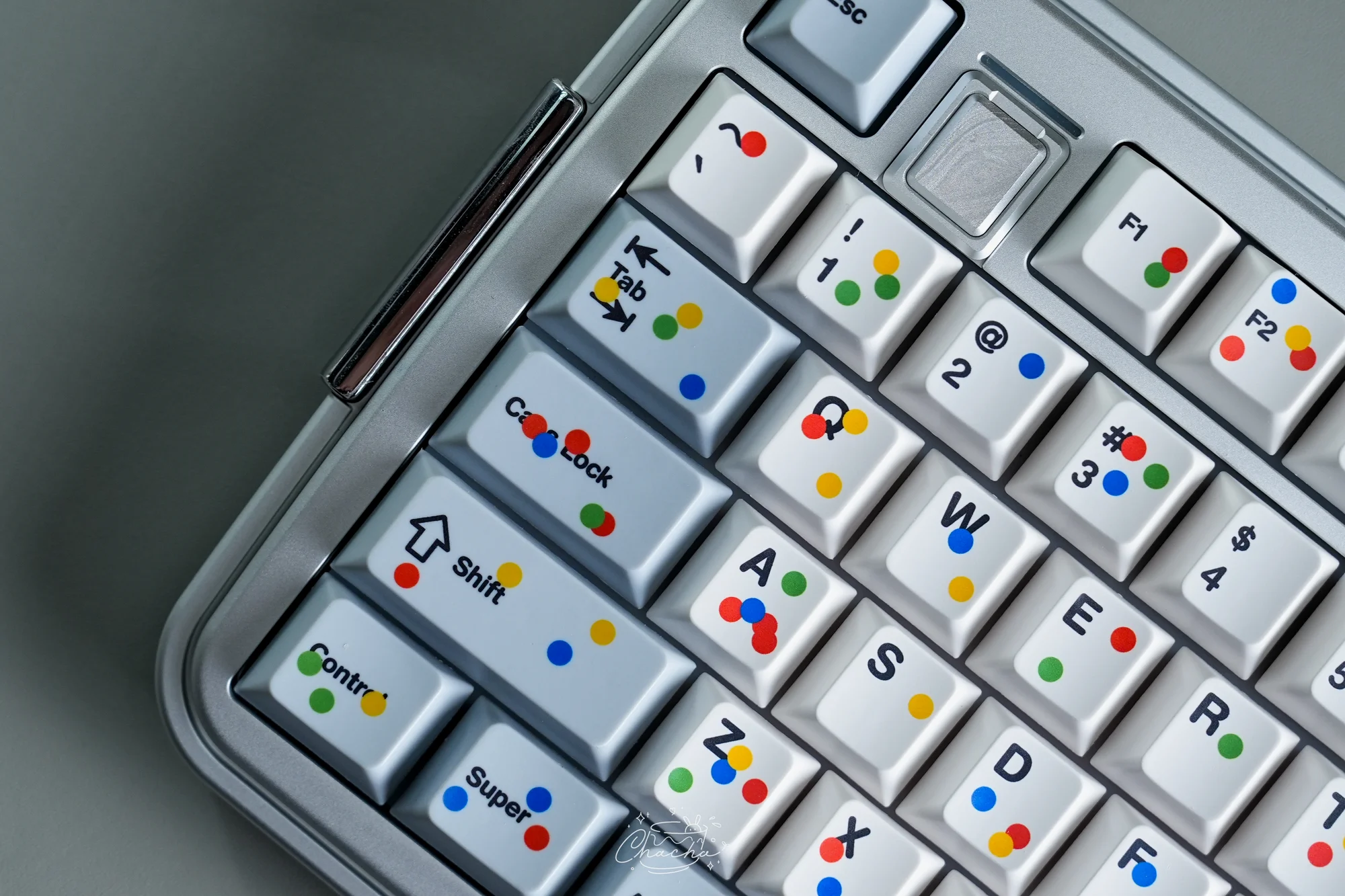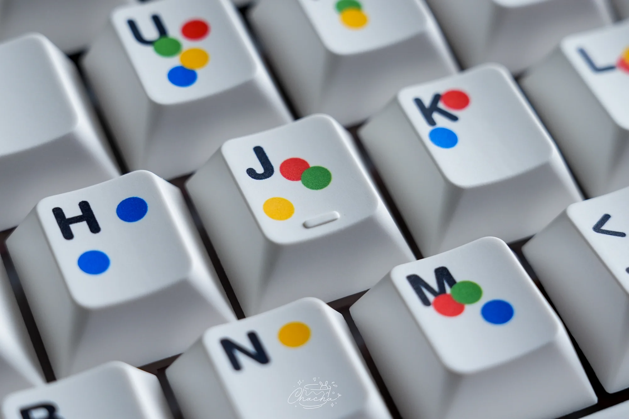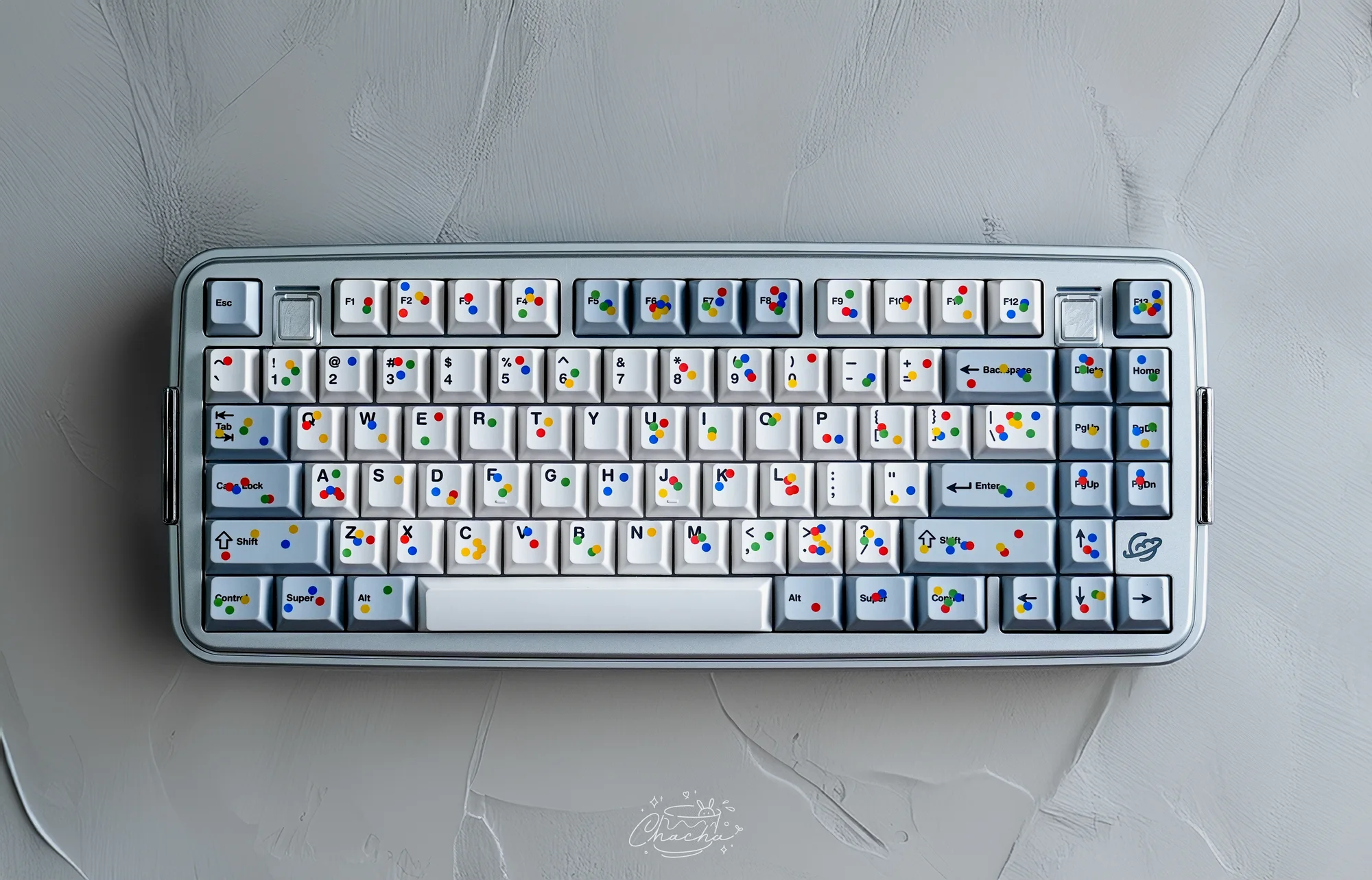 键帽基底色为非常柔和的浅灰色,带有轻微的暖调,看起来更接近“带点米感的雾灰”,字符色则是黑色,mod区的基底色则为深一度的灰蓝色,类似“带点冷感的铅灰”,字符同样为黑色。其实整体是一个比较常见的搭配,很多复古系或是常规的键帽都会选择这样的色系搭配,但在这样克制的基底色上,点缀了绿色、橙色、深蓝、金黄、砖红的小点,打破沉稳,增添了一些轻快的节奏感,让我联想到波点艺术,愉悦与活力。