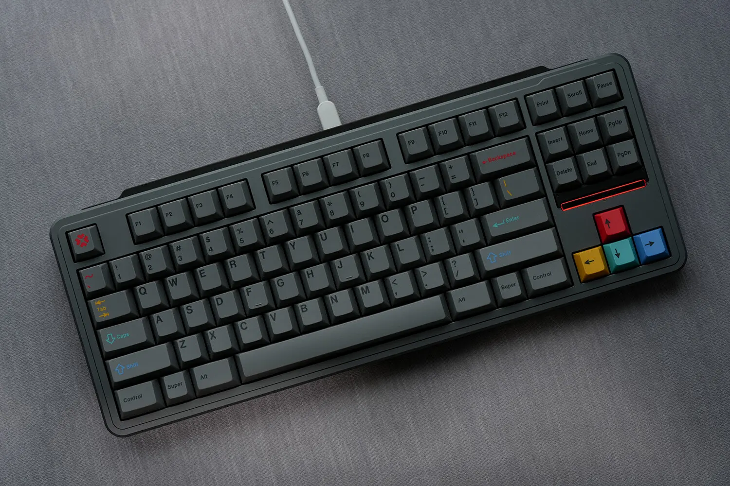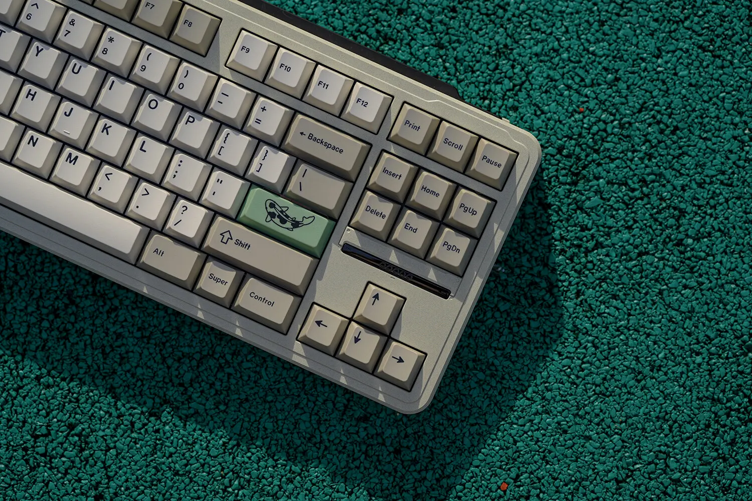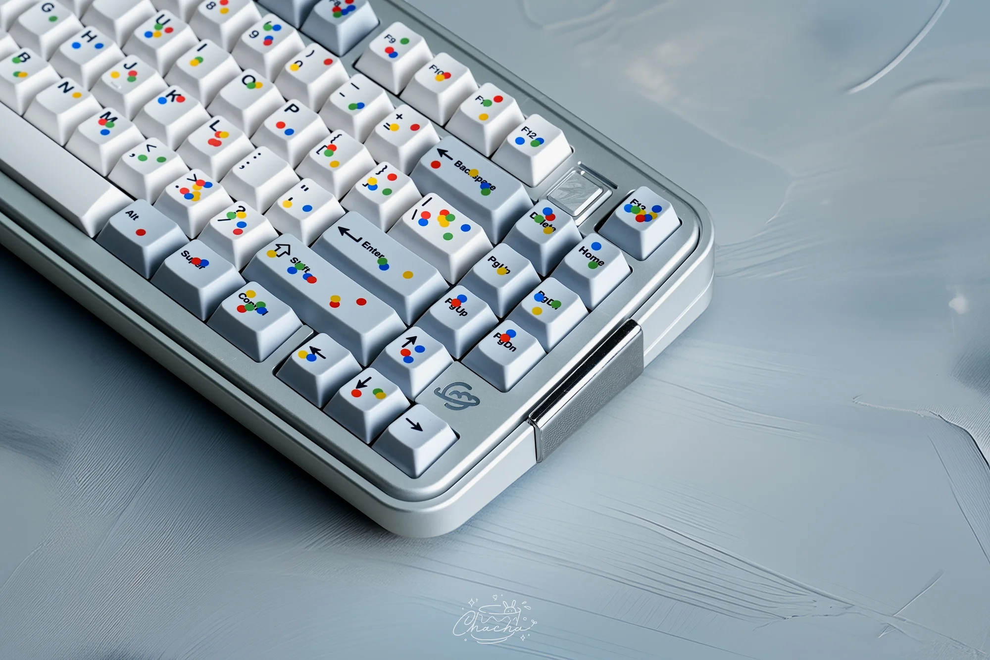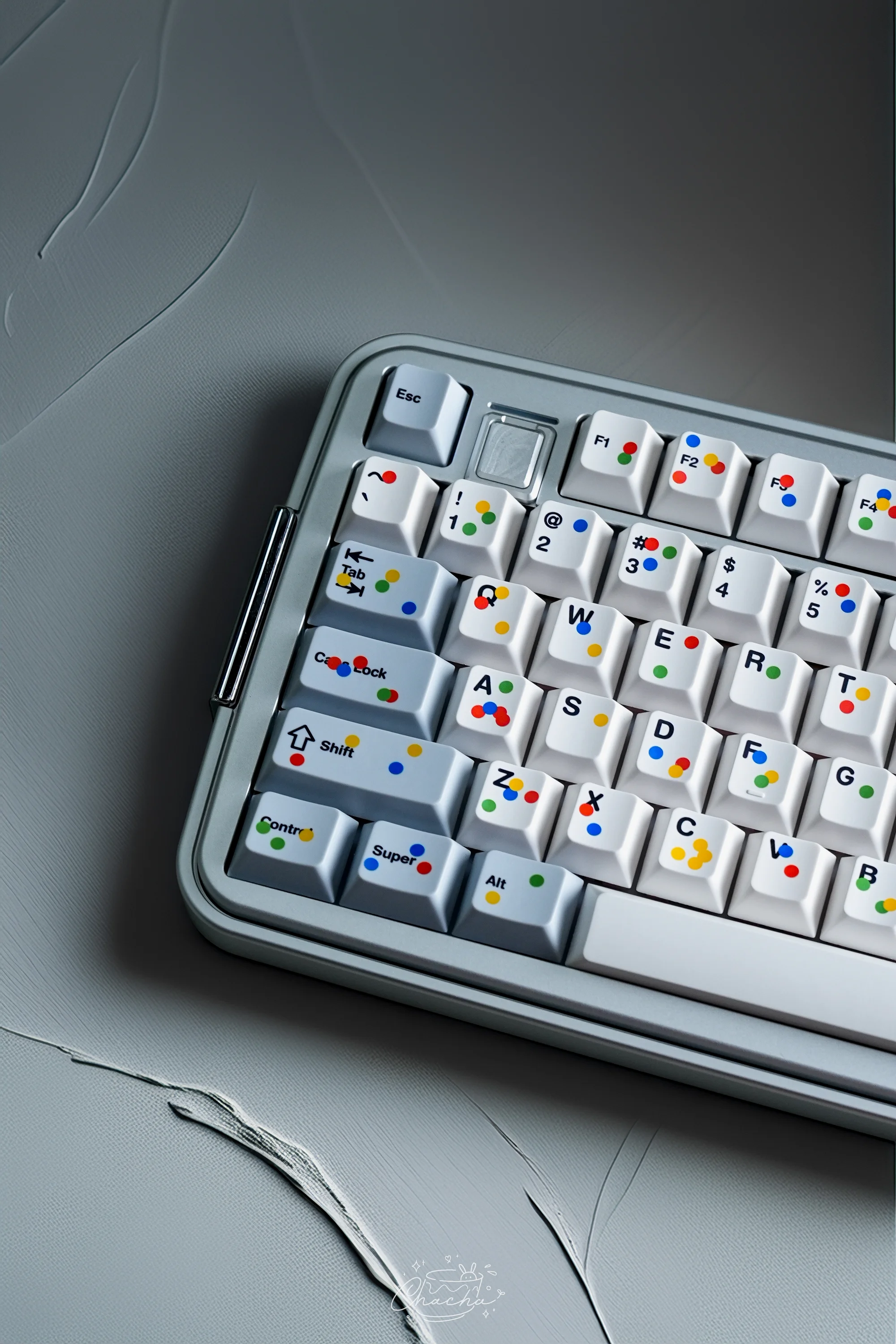 键帽基底色为非常柔和的浅灰色,带有轻微的暖调,看起来更接近“带点米感的雾灰”,字符色则是黑色,mod区的基底色则为深一度的灰蓝色,类似“带点冷感的铅灰”,字符同样为黑色。其实整体是一个比较常见的搭配,很多复古系或是常规的键帽都会选择这样的色系搭配,但在这样克制的基底色上,点缀了绿色、橙色、深蓝、金黄、砖红的小点,打破沉稳,增添了一些轻快的节奏感,让我联想到波点艺术,愉悦与活力。