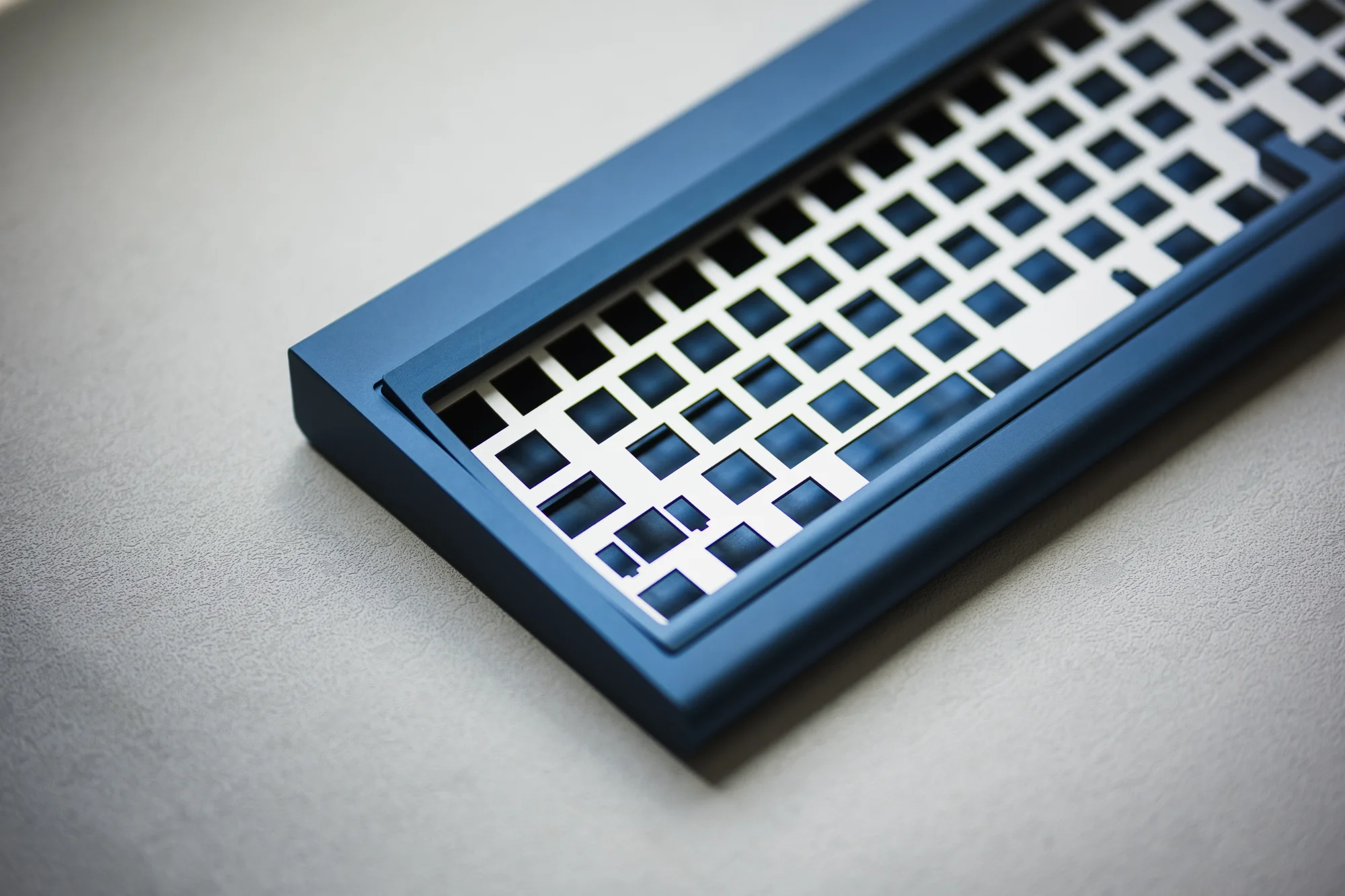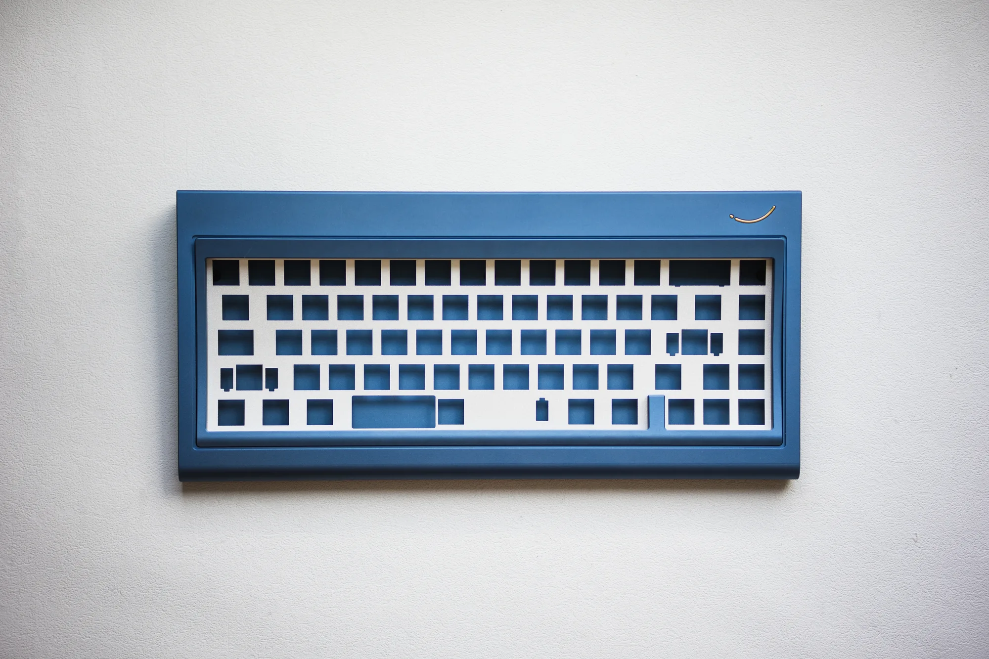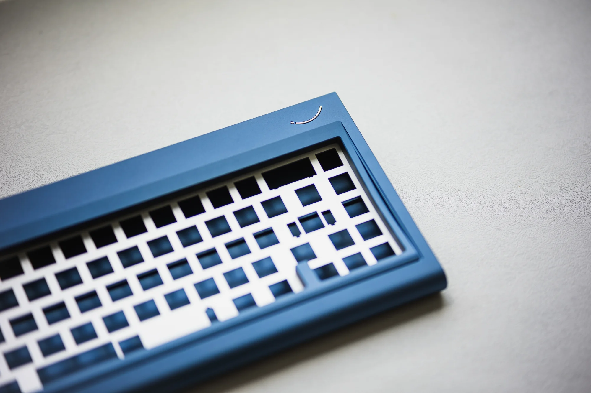 Curve65 最大的特点就是真正意义上的曲面机身,不仅是外壳在外观上做了弧度处理,PCB、定位板都有做相应的定制和设计。Curve65 的前唇部分做得圆润,视觉上贴近 Model M 那种柔和的过渡;而键盘的后侧则保持了方正收束的造型。内胆方面,左右两侧定制了硅胶Gasket底座,不同于常规的键盘内胆设计,它是将中框和定位板、pcb作为一个整体,嵌在底座上,具体手感尚未可知,按我的理解应当是相当硬的,曲面中框上也附上了 Top Mount 的固定锁点,我个人会感觉点位设计有点太少了,但考虑到这个设计的特殊性,也能理解。