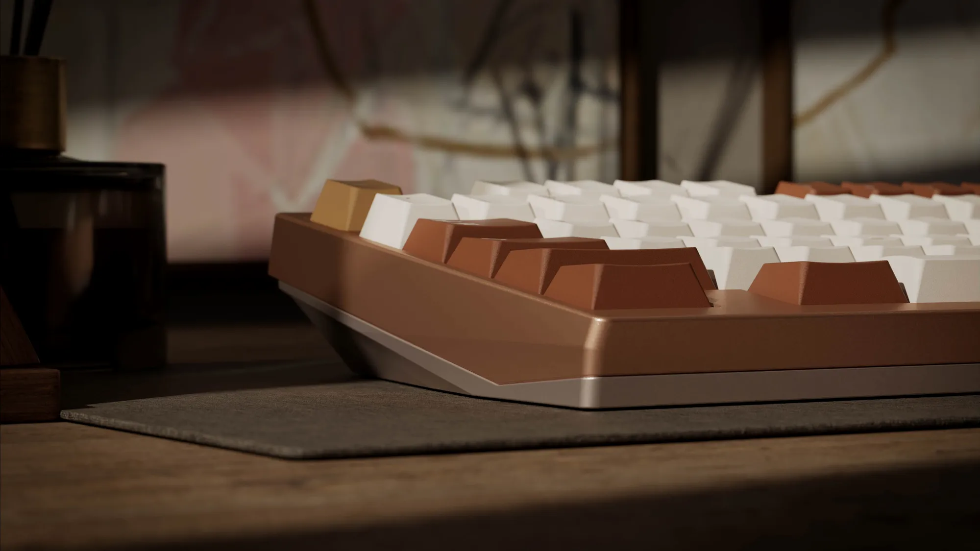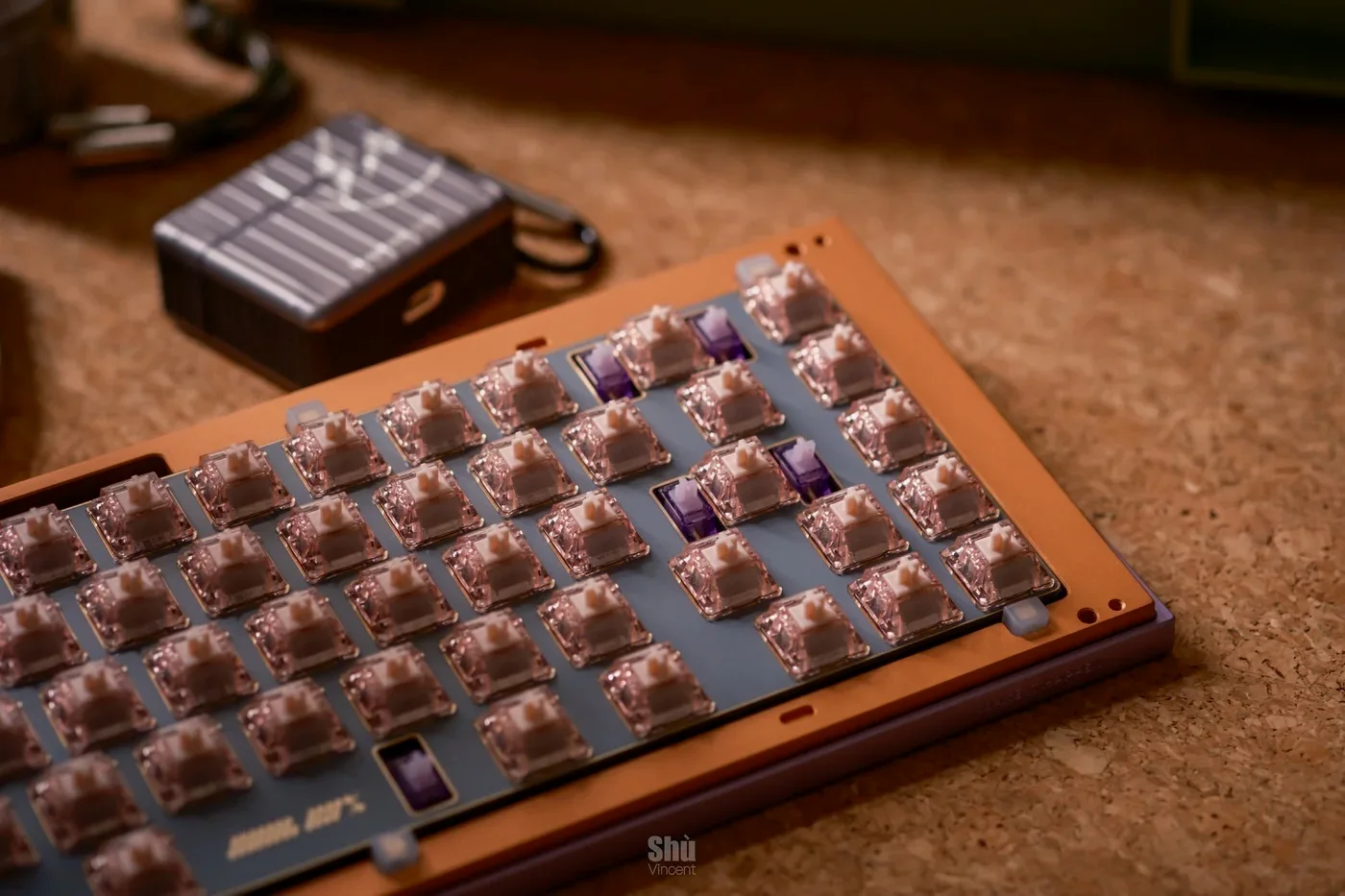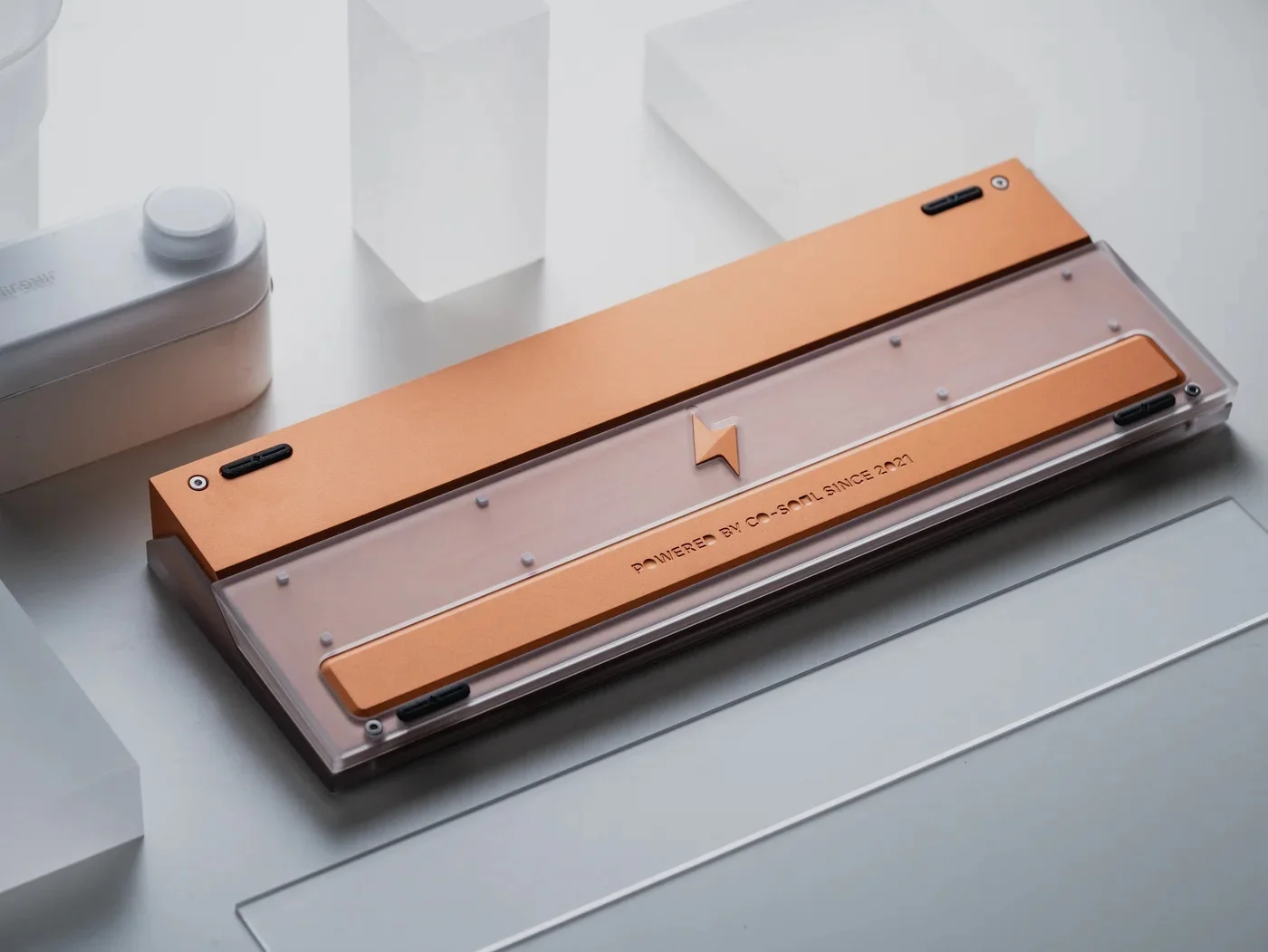 整体来说,我觉得 SOUL65 是COSO Studio 目前最集大成的作品,围绕铜厚实的大块铜底进行设计,C 口位置能直观感受到那种“豪横”的比例,而前唇处上下盖板之间露出的铜色,也进一步强化了这种存在感,相较于此前的 80、70 与 75,65% 的小巧配列恰好规避了因边框比例与层次堆叠而带来的臃肿问题,既保留了系列一贯的厚重质感,又在尺度上取得了一种难得的平衡,即便如此,实物观感依旧偏厚重,但这份厚重也是经过收敛后的力量感。