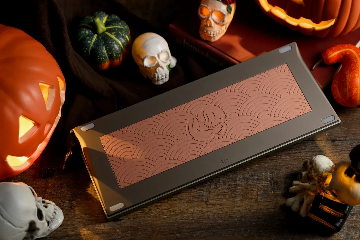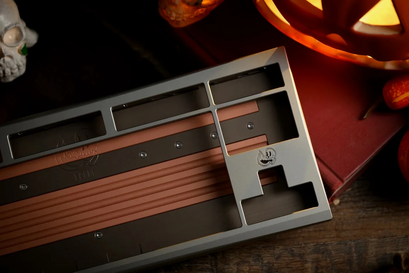 贯穿式的红铜配重也是这把套件的卖点之一,背面设计采用扇状条纹处理,中间则阴刻了橡皮管风格的骷髅头吐火图案,这个图案在正面也有趣味延展:火焰部分进行了镂空设计,当配合键盘灯光使用时,光线能够透过火苗区域投射出来,形成一种动态的“鬼火”效果。