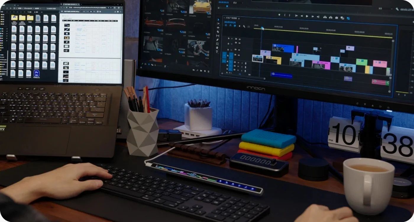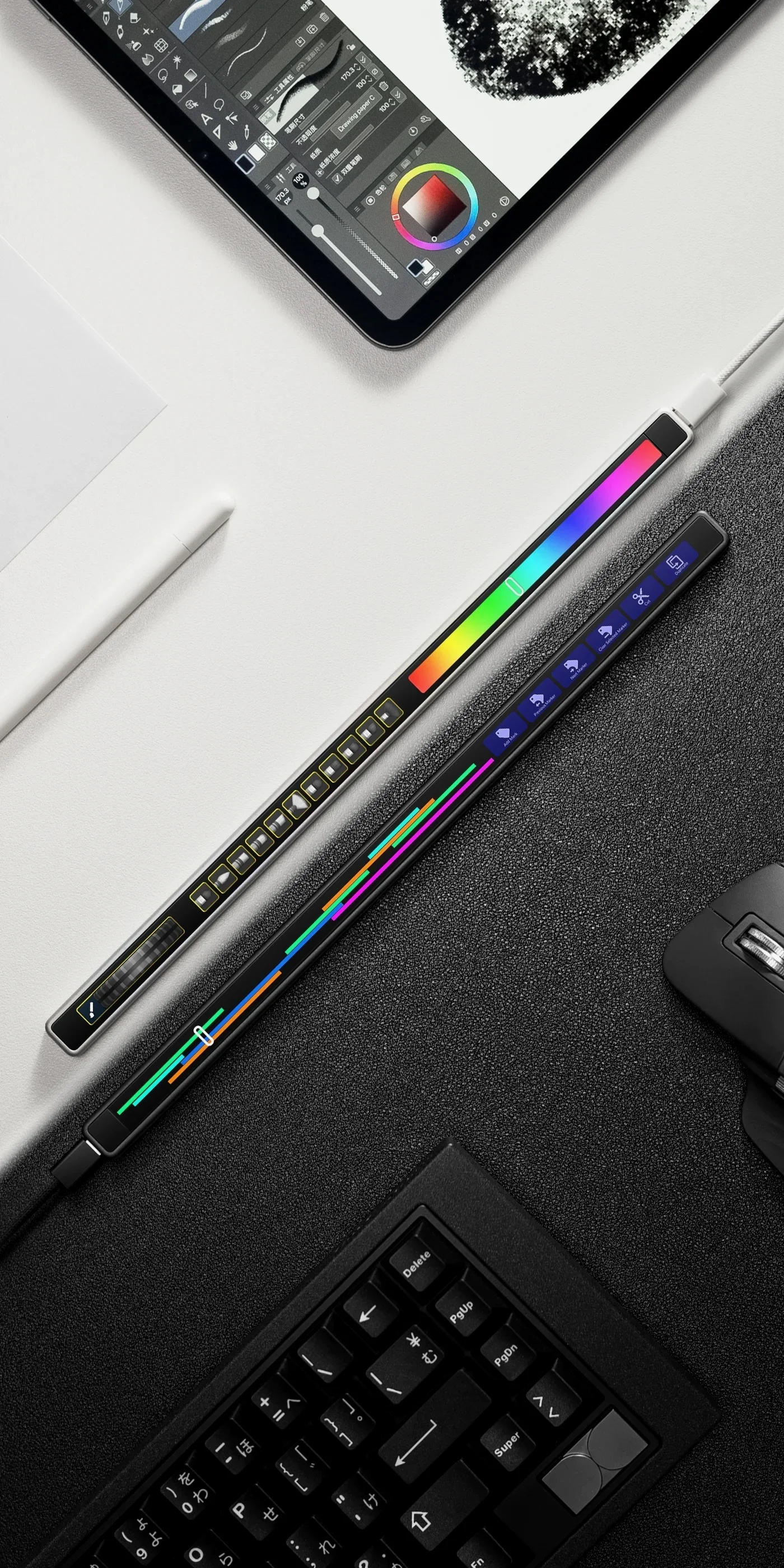 说回 Flexbar,这款产品的设计非常简洁:一条铝合金长条,搭配磁吸底座以提供适宜坡度,配备 2K OLED 触摸屏和线性震动反馈。在软件层面,开发了配套的专用软件 FlexDesigner,可视化程度高,支持傻瓜式拖拽自定义,同时内置按键设计器、图库以及 GIF 编辑器,满足按键风格和功能需求,整体体验可玩性和可定制性都是不错的。