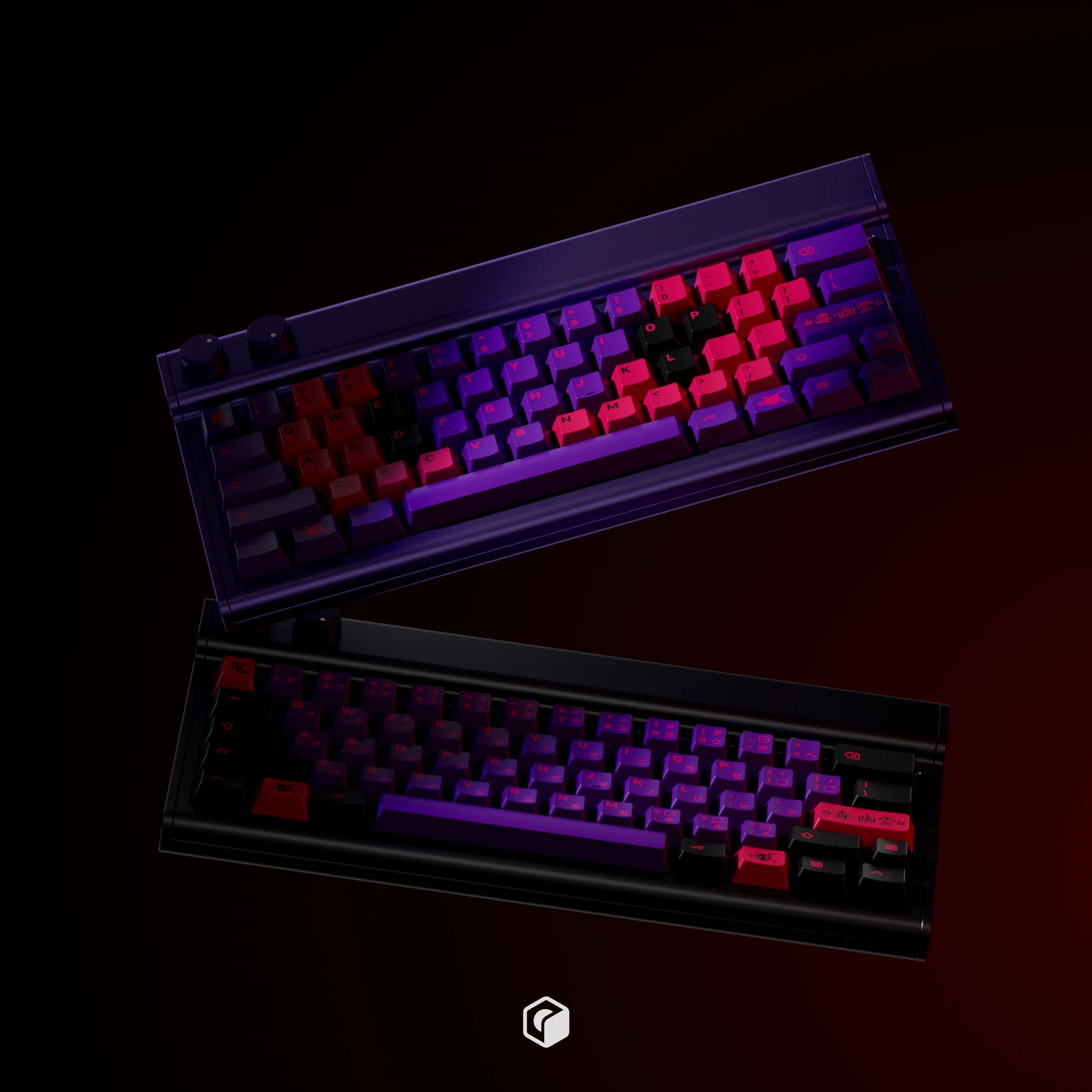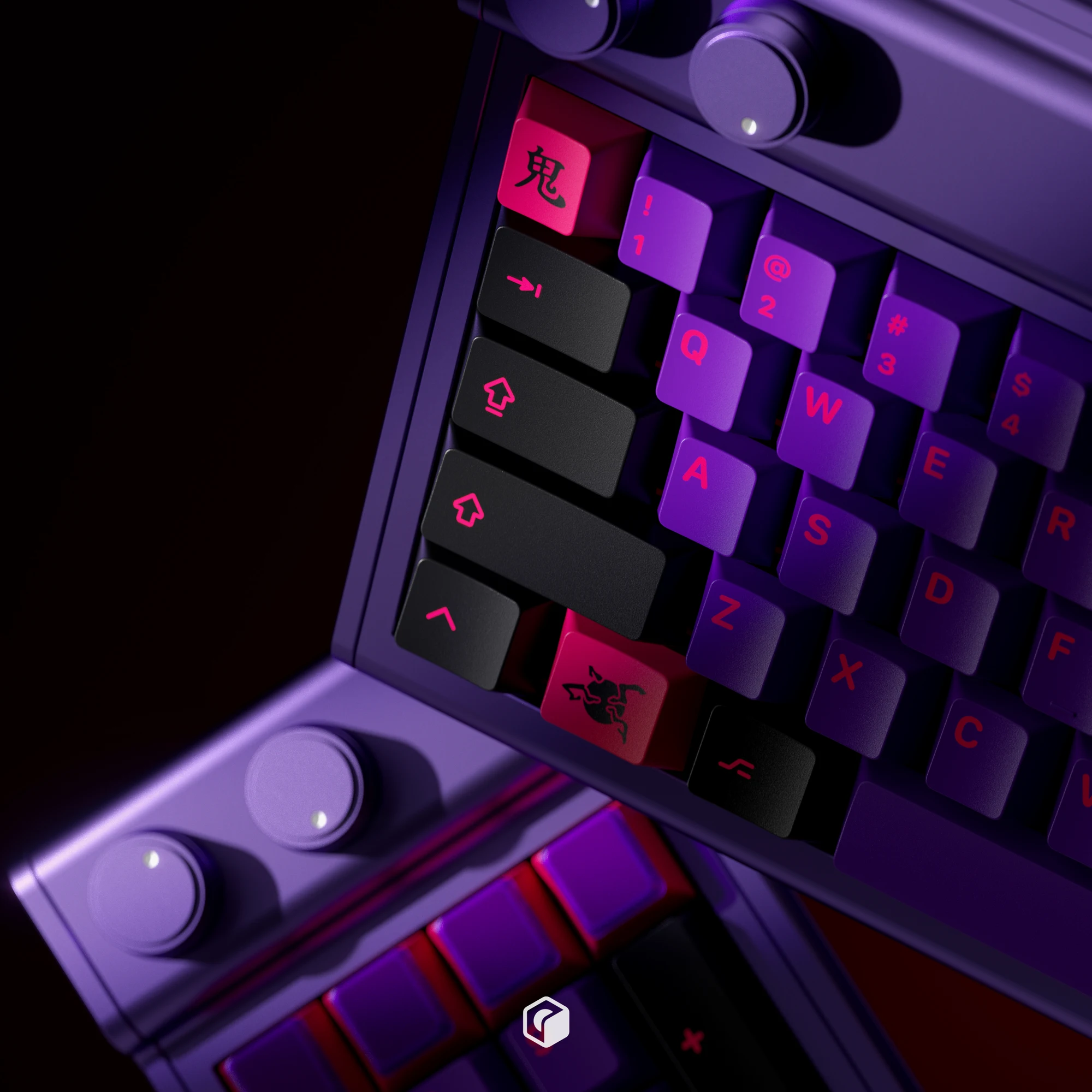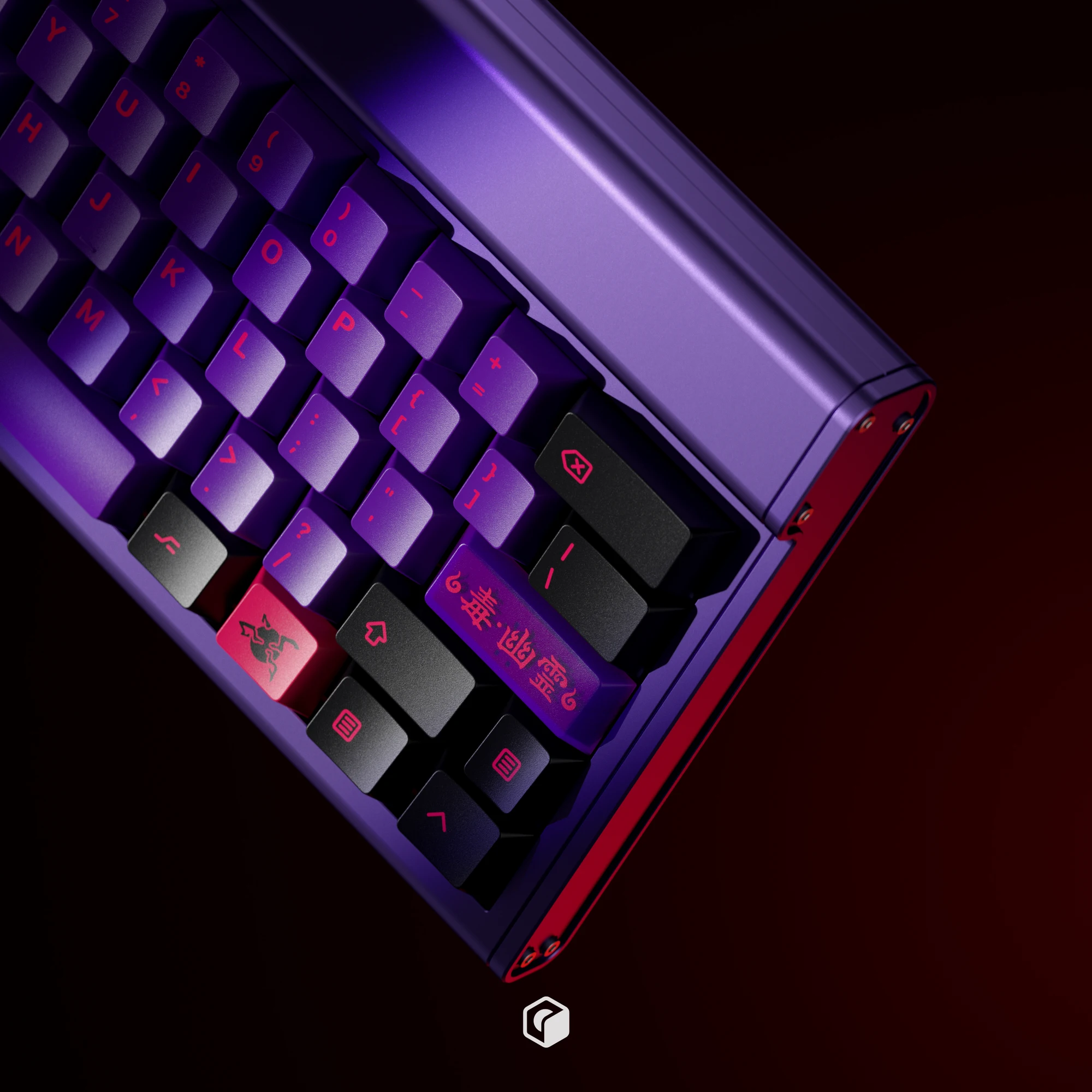 键帽的字母区采用深紫色为基底,搭配鲜艳的红粉色字符,既保证了良好的可读性,也呼应了耿鬼的眼睛颜色;Mod区则以纯黑为基底,字符仍为红粉色,部分增补键采用字母区的反色设计,使整体更具层次感。最有趣的设计点在于类似GMK 狗勾的设计概念,设计师通过全套键帽的排布,构建出耿鬼的脸,深紫色呈现皮肤,红粉色为眼睛,黑色为瞳孔,这种设计不仅强化了主题感,也让整套键帽在视觉上更有趣味。