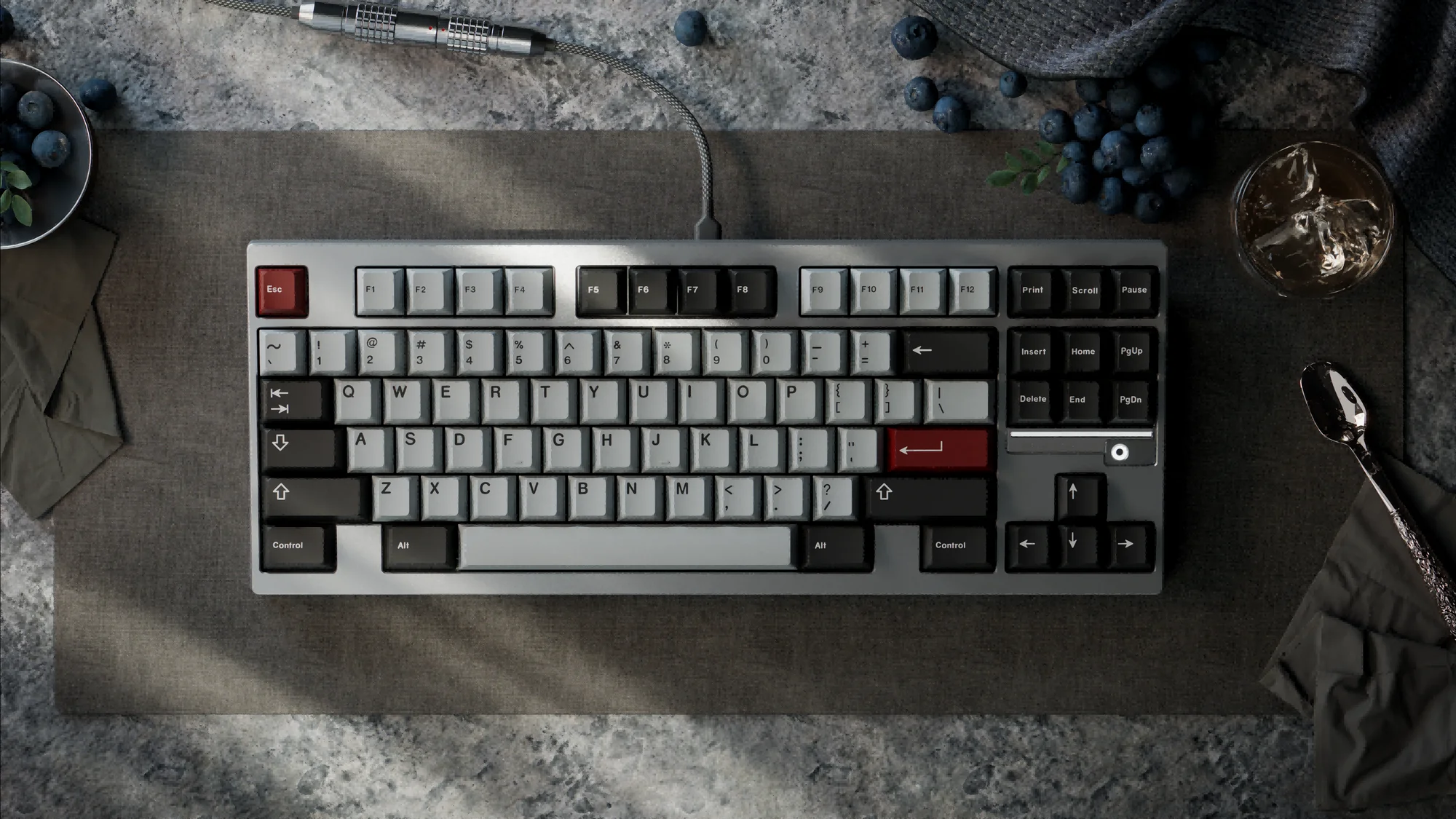 相较于雫,Two40 的正面观感留白明显更大,不仅左右两侧加入了类 HHKB 的 corner blocker,使键区边界更分明,中央 Alice 配列特有的“大裂谷”也比雫更开阔一些。这种设计可能是考虑到在左右两侧留白已经被放大的情况下,适度拉开中间间距,避免视觉上出现拥挤或比例失衡,让整把键盘看起来更舒展。