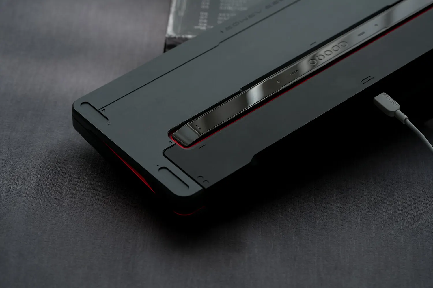 键盘周身是经典的环绕RGB灯板设计,辅以梯形分割和大倒角处理,层次感和分件感被进一步强化,整体观感更接近“机械装甲”的风格,在细节上,R2 也加入了一些新的修饰元素。键盘后侧的 C 口上方新增了一条凸起的 PVD 装饰条,与正面的饰板形成呼应,同时也让背部的观感不至于过于单调。底壳部分则通过斜切的方式削减了厚重感,让原本方正的机身多了一些轻盈的视觉过渡。