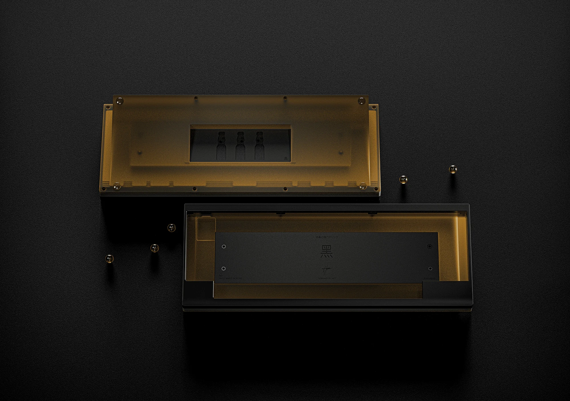 内胆方面,上四下三的定位板Top,传统TKL点位,以及PCB Gasket Mount,斜内锁螺丝,提供焊接PCB,定位板 PC、PEI、铝、碳纤维,个人会比较偏好铝和Pei。推荐正面雕刻Onibi专属鬼头LOGO款。