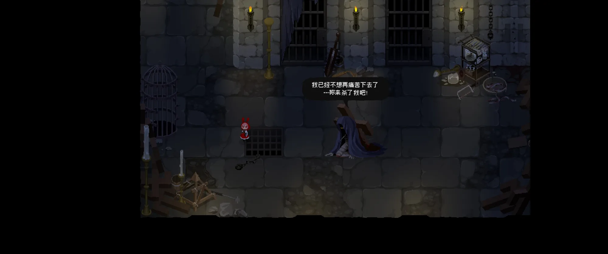 主角Ruby凭借一把小刀去迎战各种BOSS,输赢都能获取奖励并在家里进行强化(例如血瓶数量)后继续挑战