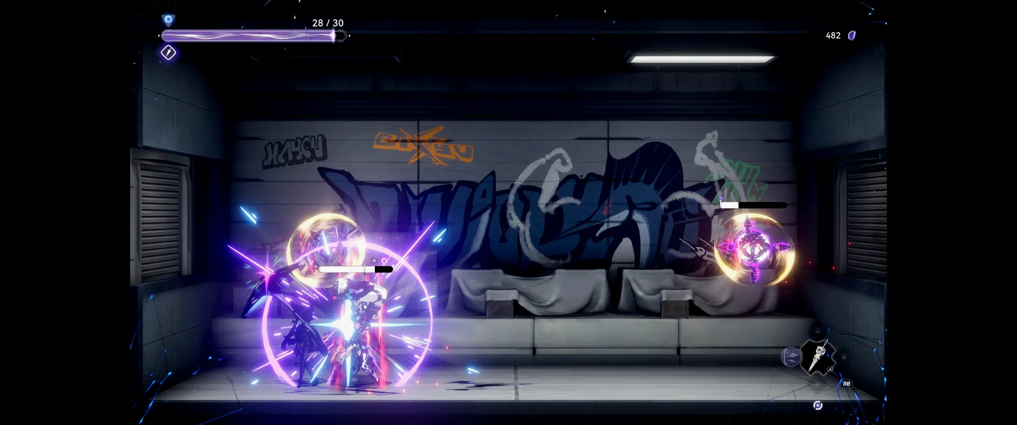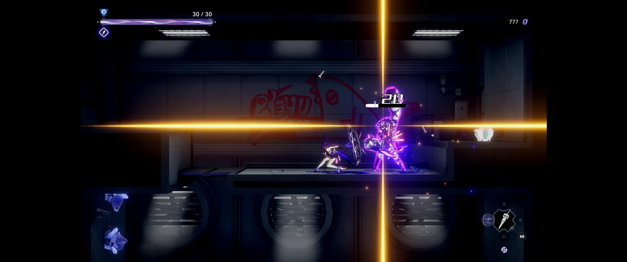 基础玩法是横版平台跳跃的动作游戏,除了基础的平砍和跳跃以外,主角一大特色能力是瞄准敌人后发动快速接近并将敌人和空间一起斩断的强力攻击,连续发动时不仅能高速通过关卡还能形成高连段的加成,非常爽快。