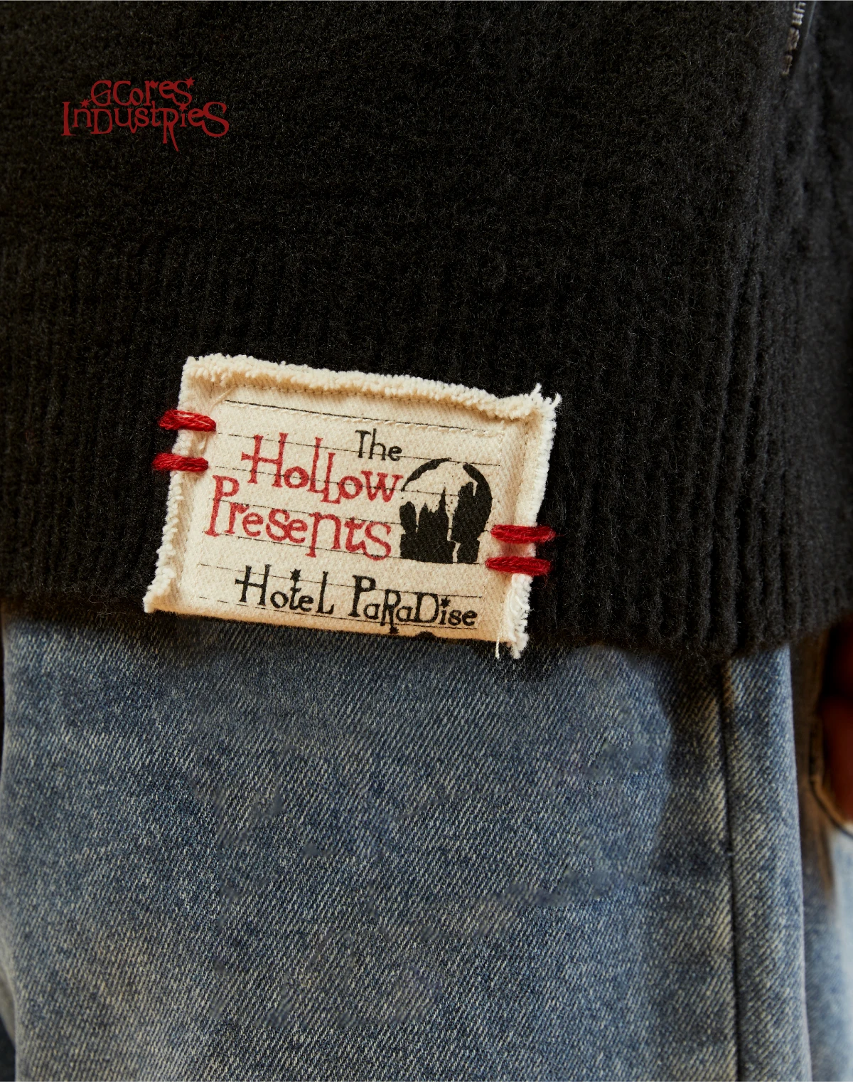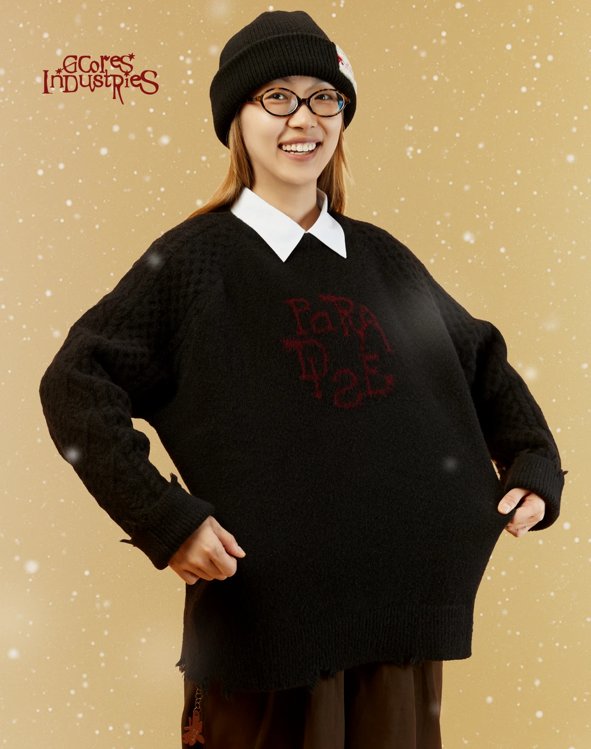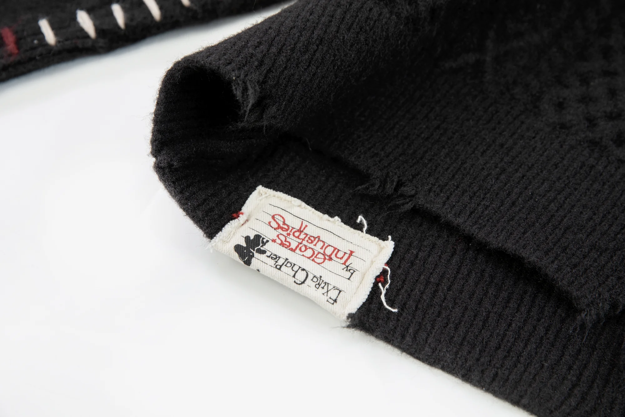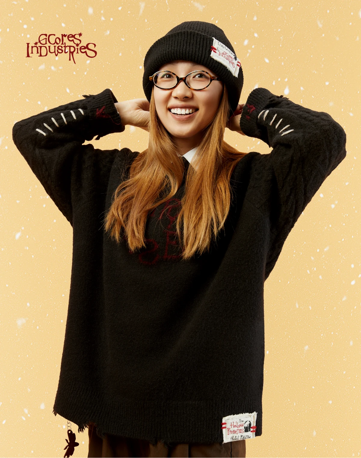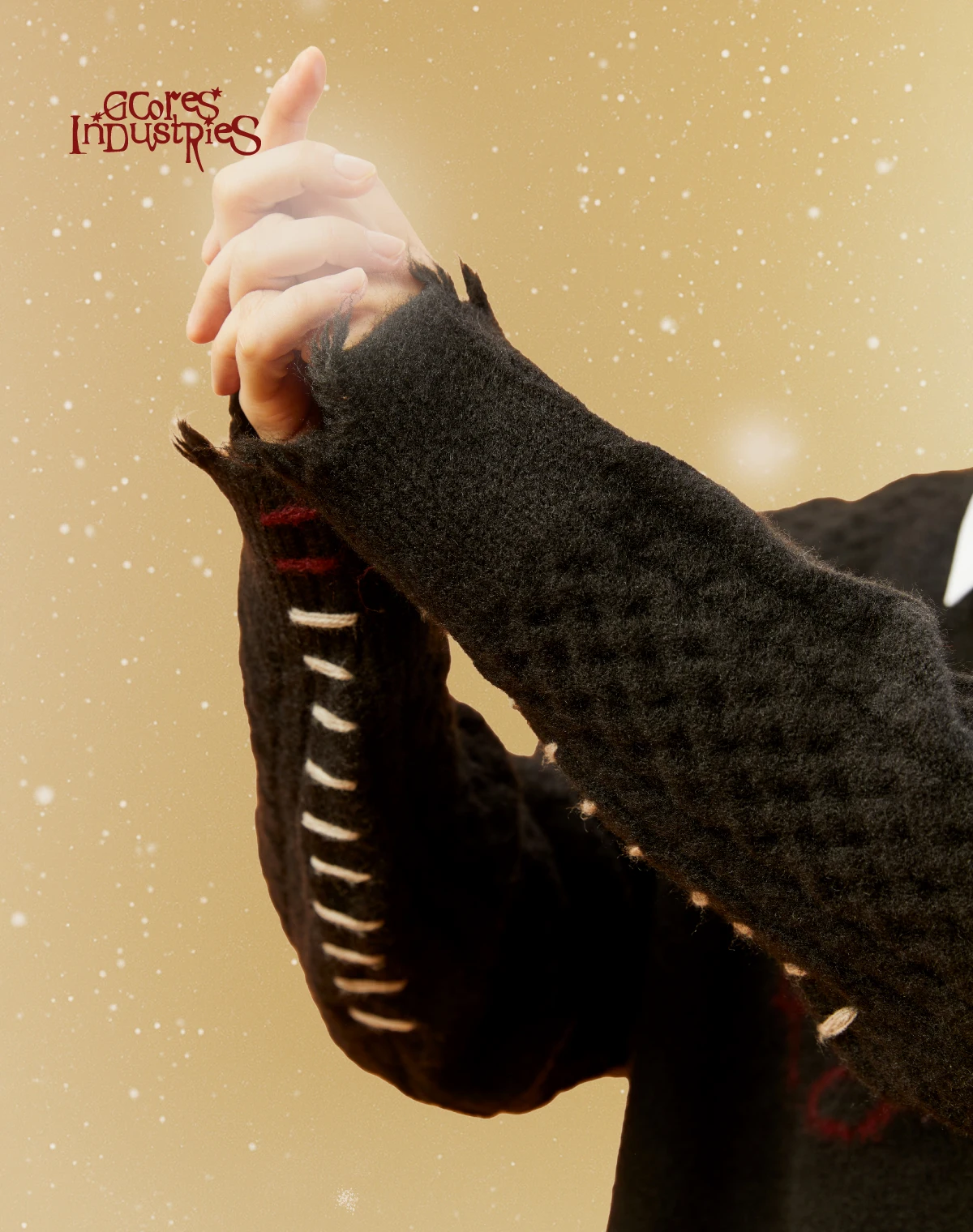 图案插画被转化为服饰贴布装饰,黑、红两色交错,象征雪夜中被封存的心跳与铃声。整件毛衣既是服装,也是故事的延续。