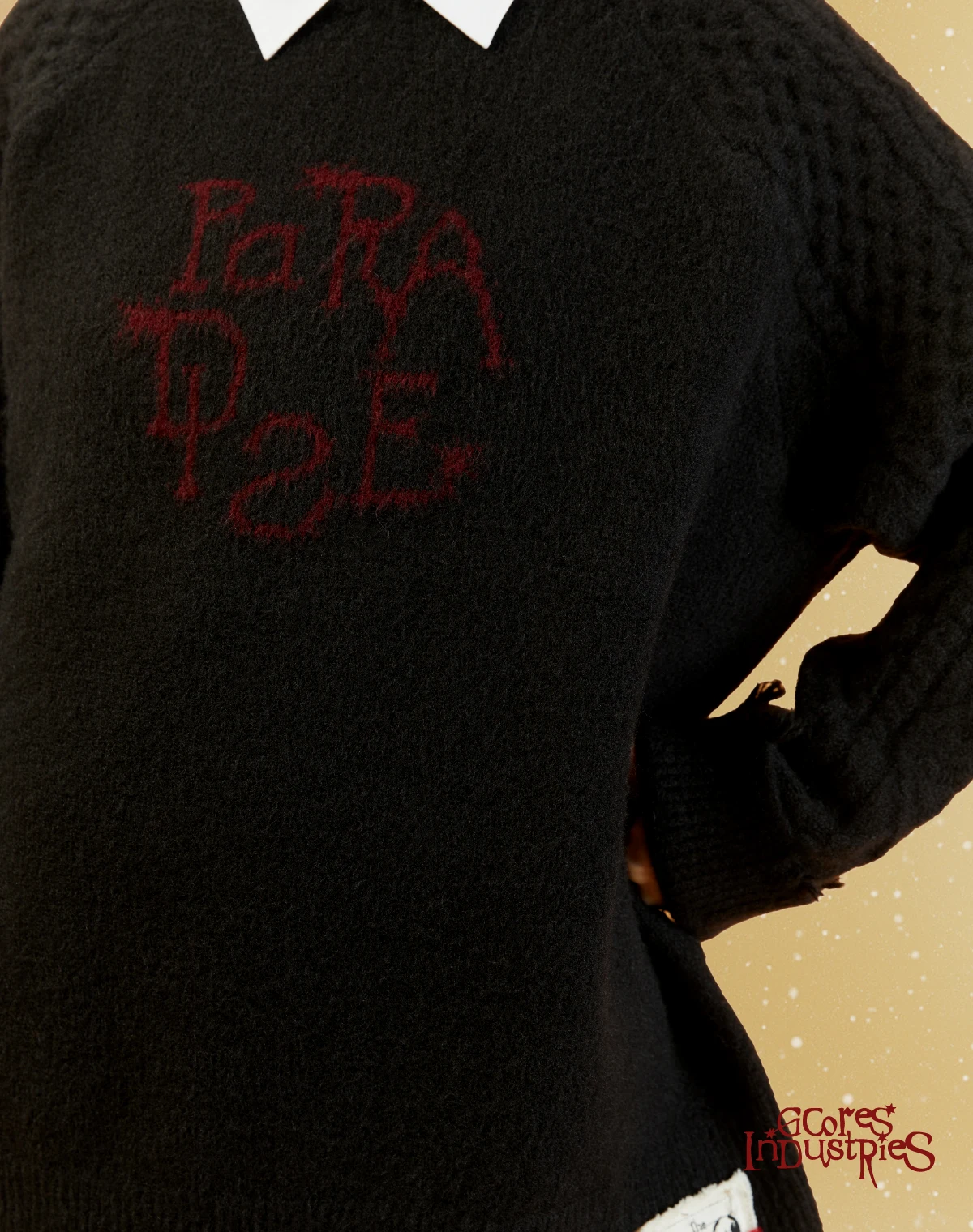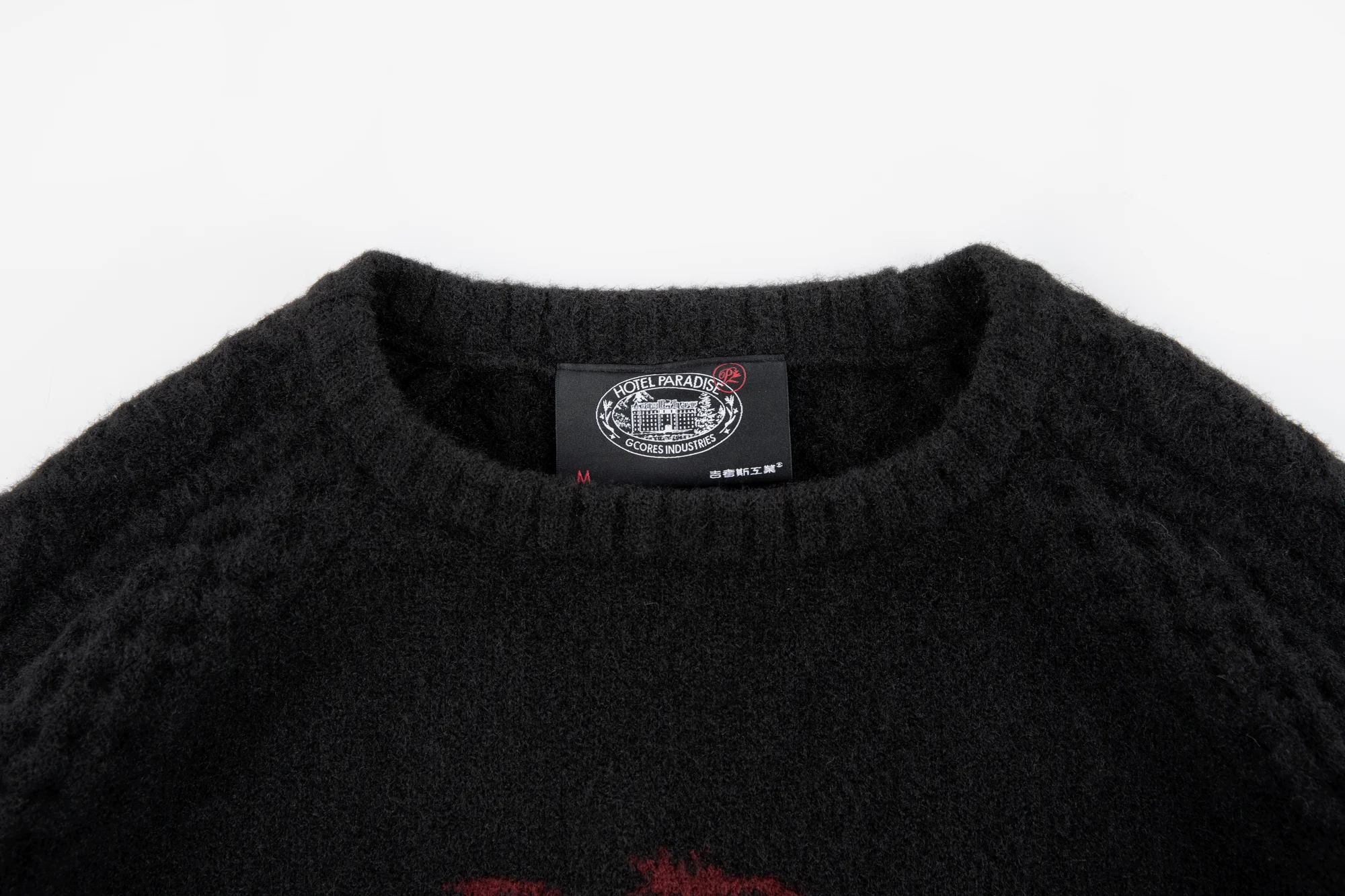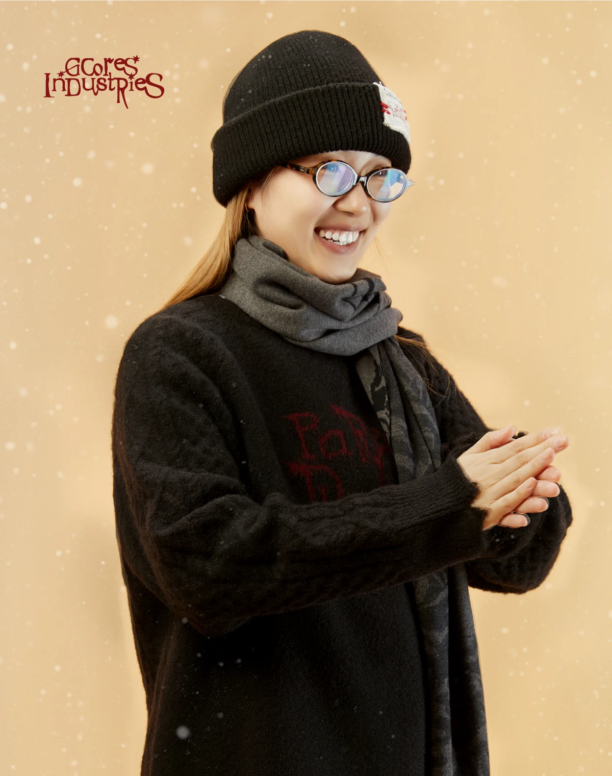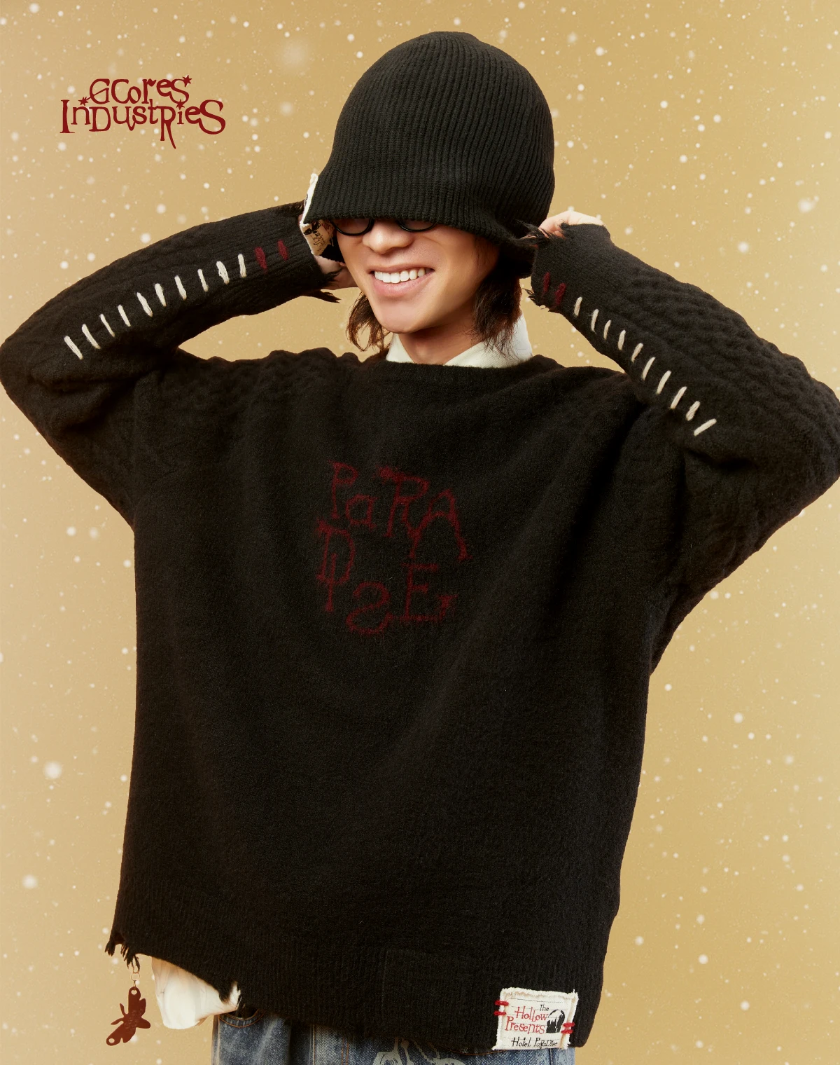 图案插画被转化为服饰贴布装饰,黑、红两色交错,象征雪夜中被封存的心跳与铃声。整件毛衣既是服装,也是故事的延续。