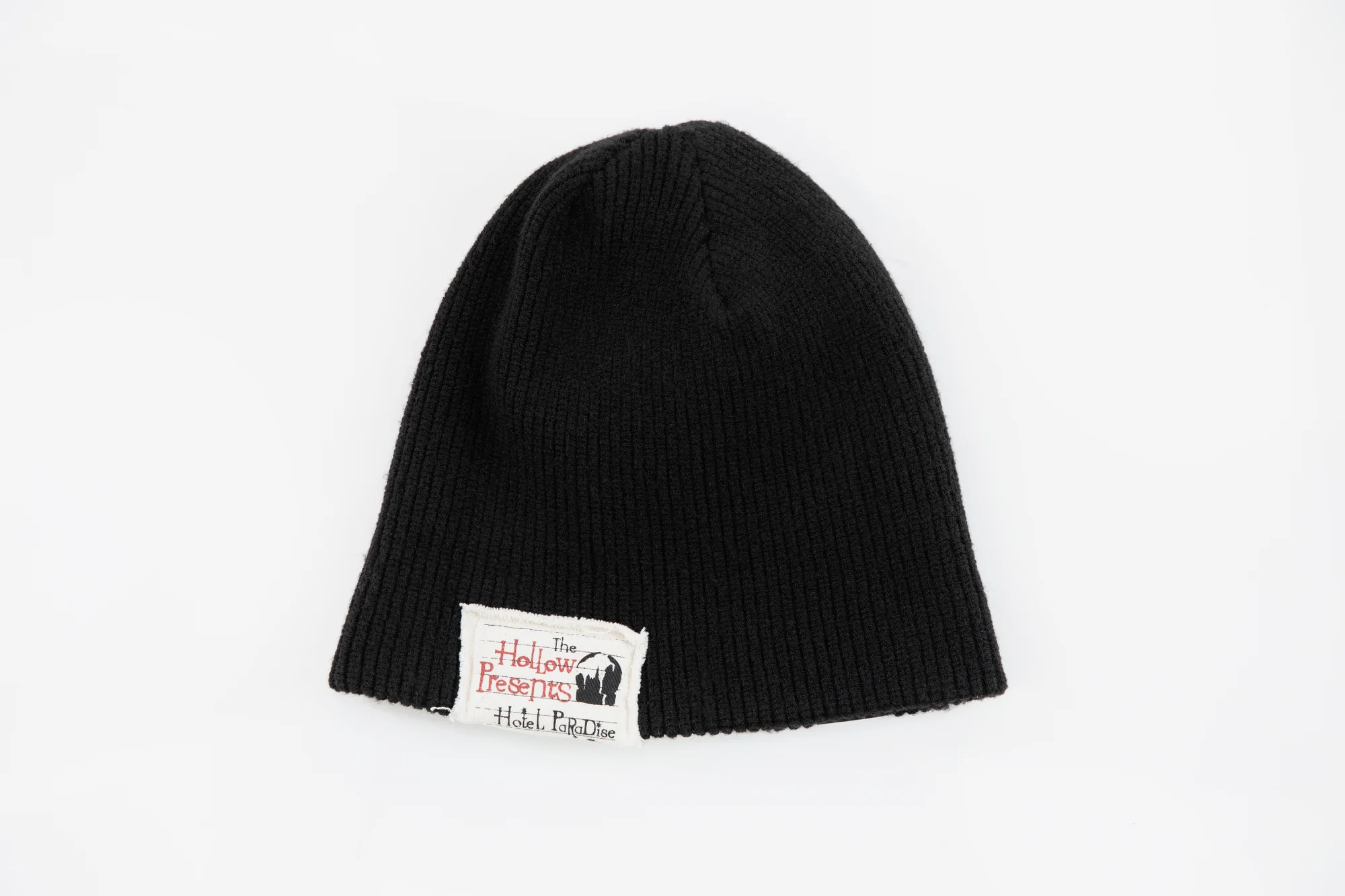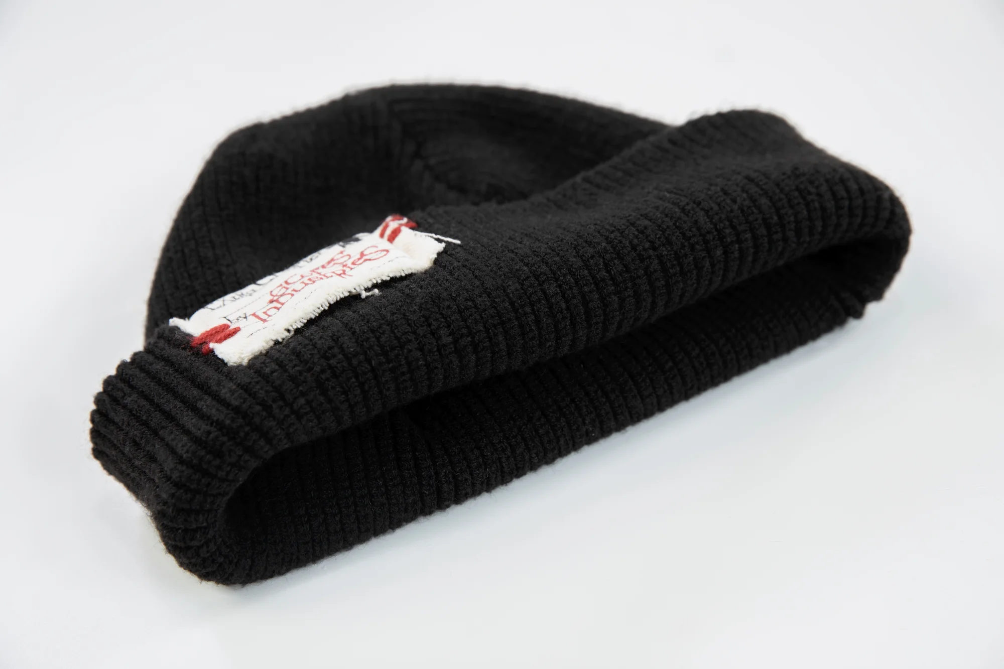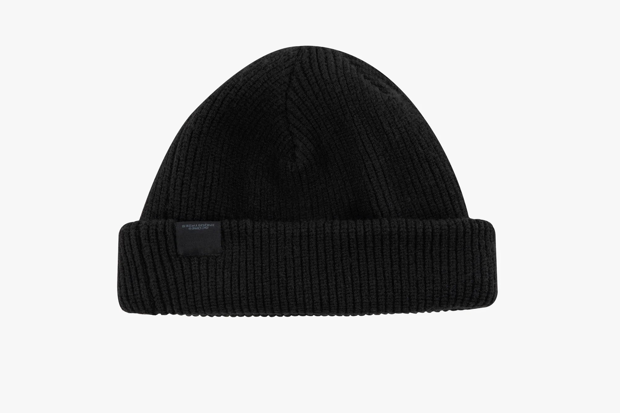一款兼具实用性与设计感的双层加厚针织帽,整体以黑色基调呈现,呼应系列风格。帽身正反无毛边,触感柔软贴合,长时间佩戴也无压迫感。帽围设计为 60cm 宽围度,适合不同头型佩戴,帽檐翻折戴法更加修饰脸型。装饰标两侧的红色线迹均为手工缝制,保持该系列一贯的品质。