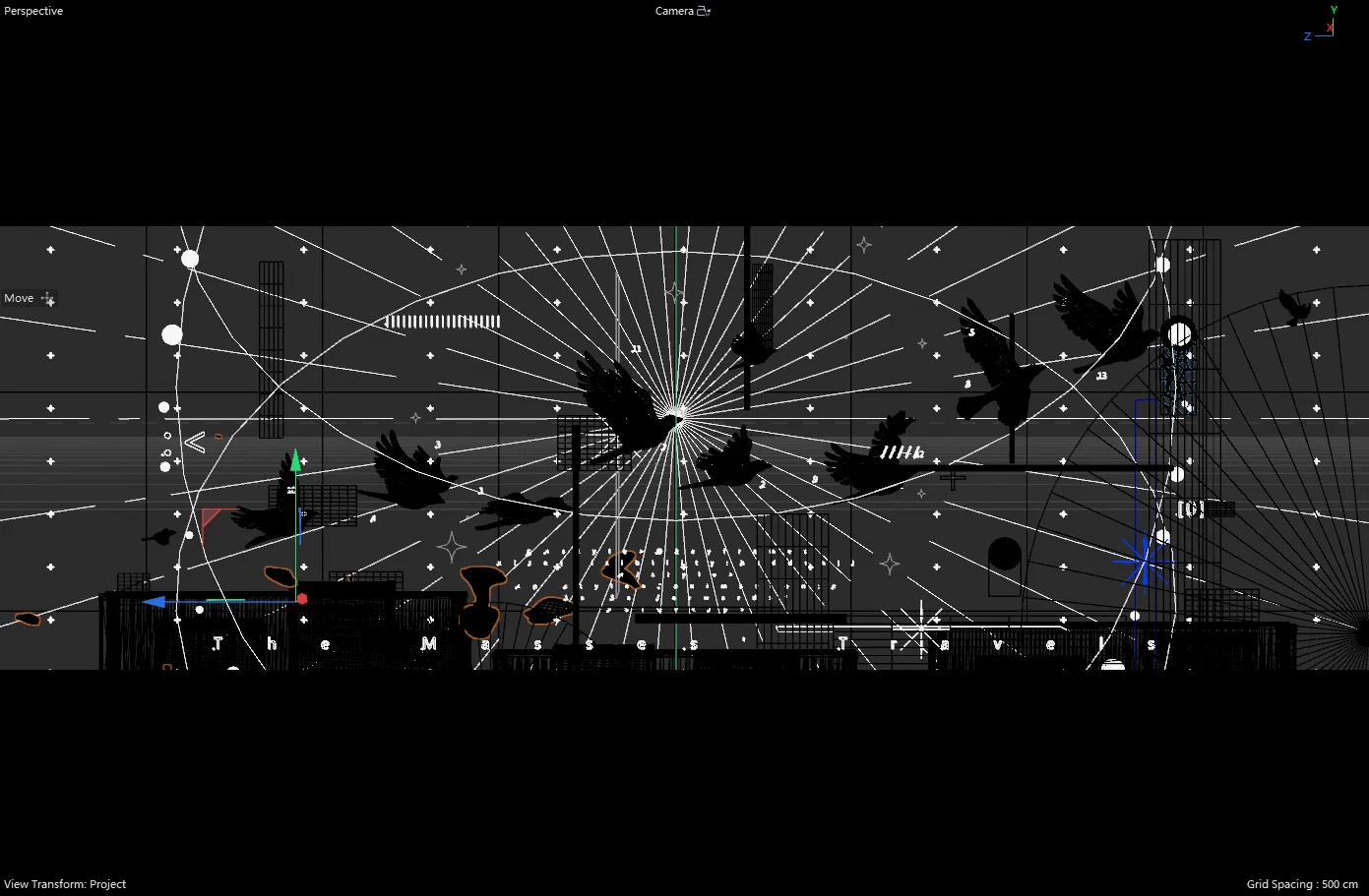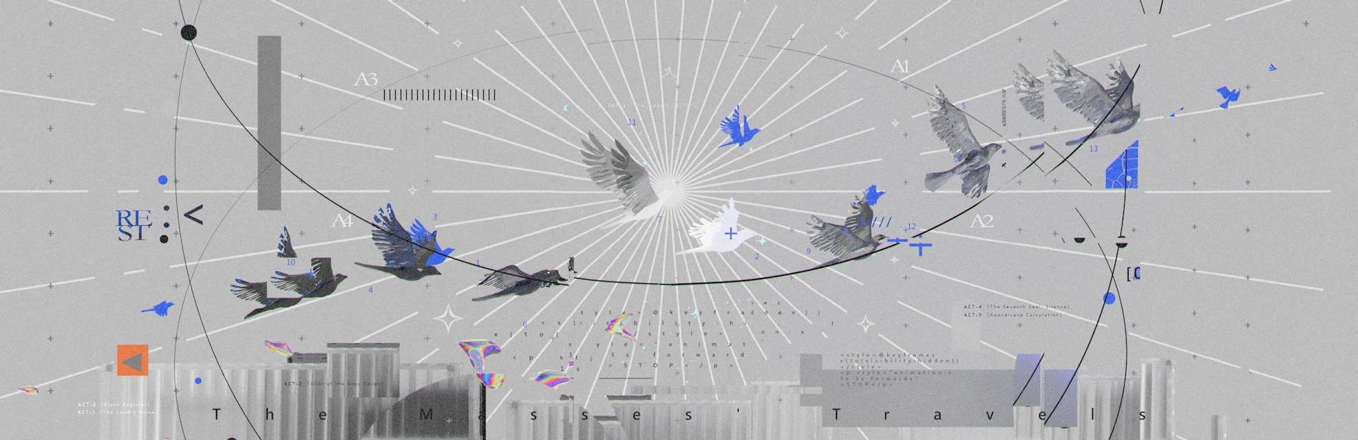 🎇想尝试一个有明确聚焦视觉中心的画面设计,同样结合之前几张设计的元素来作为构成,本次手型使用了更为平滑的模型,让线条剪影更加流畅。所有画面元素的方向都导向视觉中心去安排,并且在最多细节的白鸽摆放角度上作出更多空间感,进一步增加画面层次。