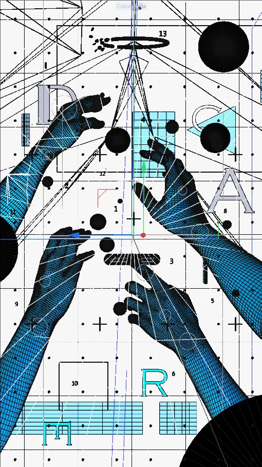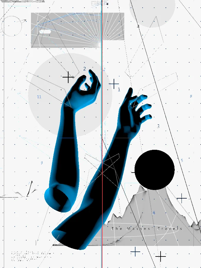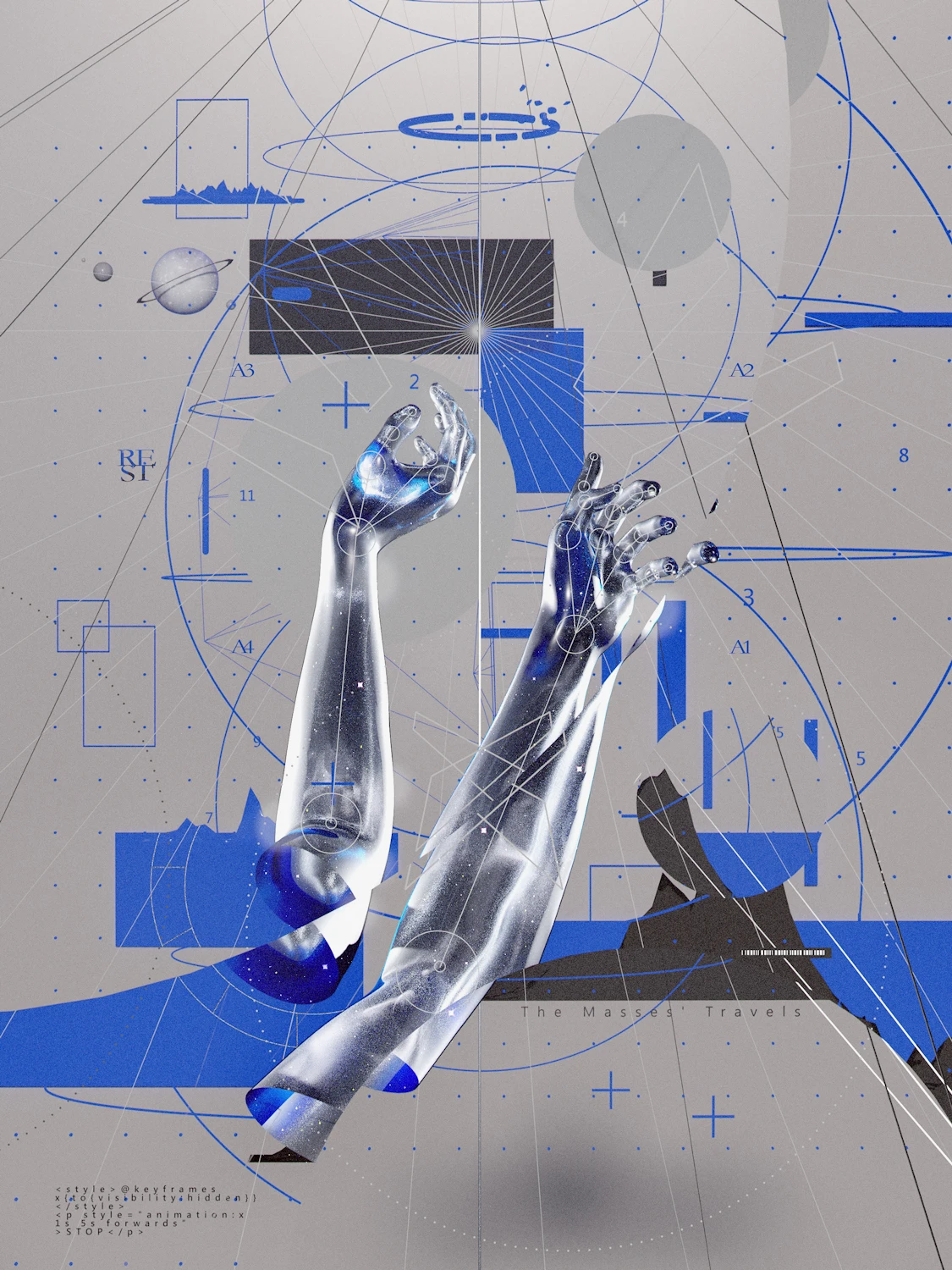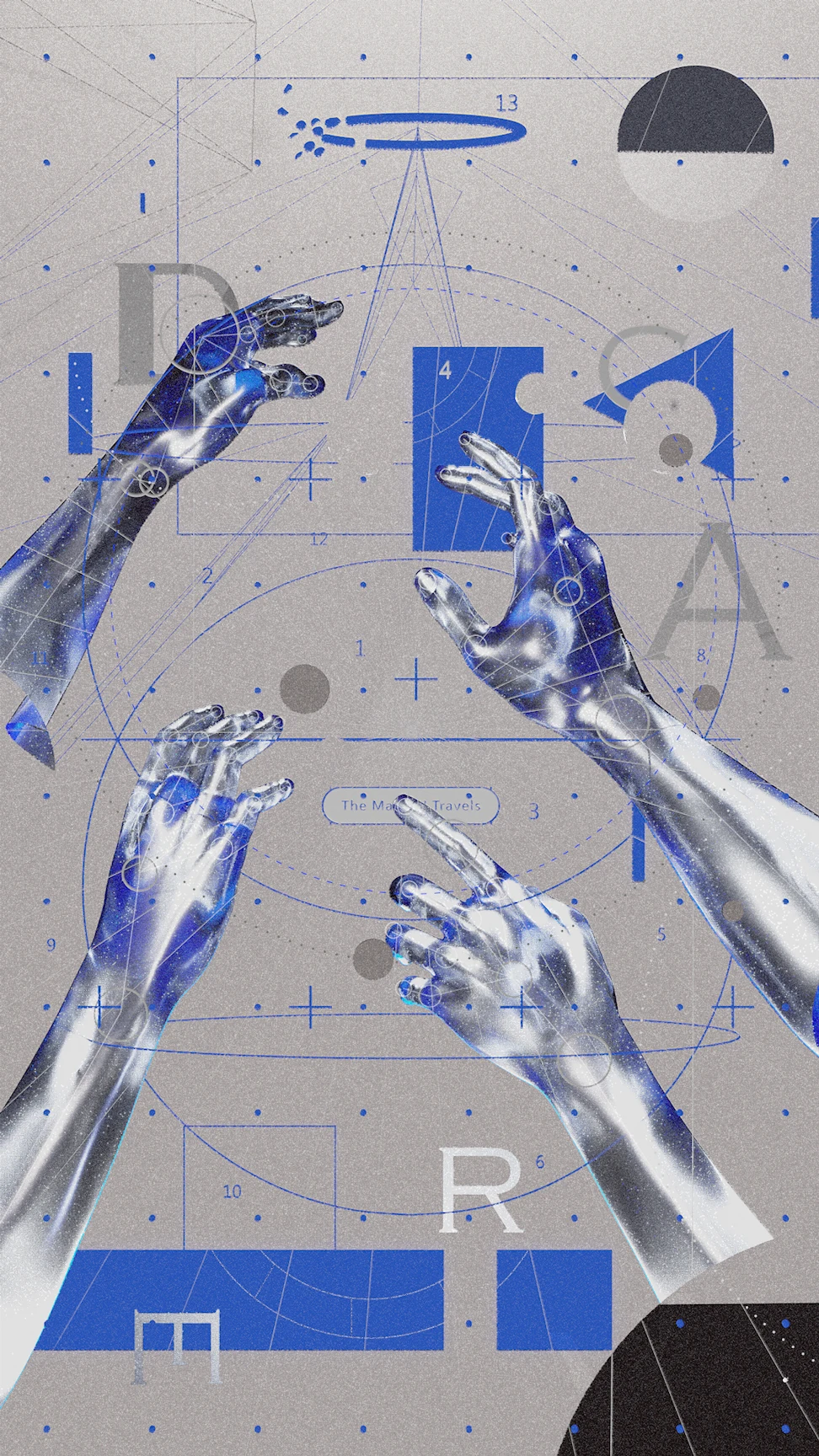🔷核心构思 画面以“手与白鸽”作为视觉符号, 色调采用不同明度灰色+蓝色的基调, 整体布局呈现向上的流动感——不同角度的手臂彼此呼应, 形成无形的纽带,白鸽的姿态也强化了升腾的意象。 刻意将放射线元素集中在上半部分, 配合大面积留白,与下方的密集元素形成轻重对比, 让构图既有冲击力又不压迫。