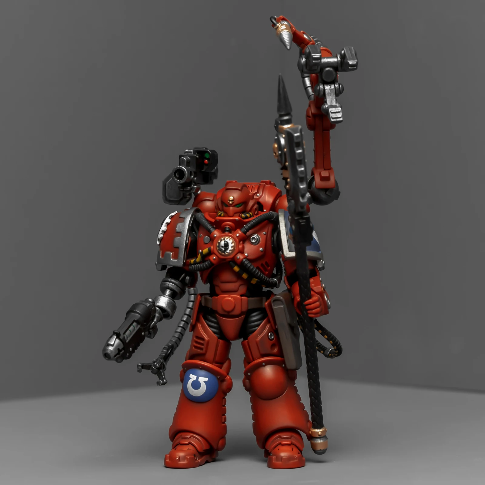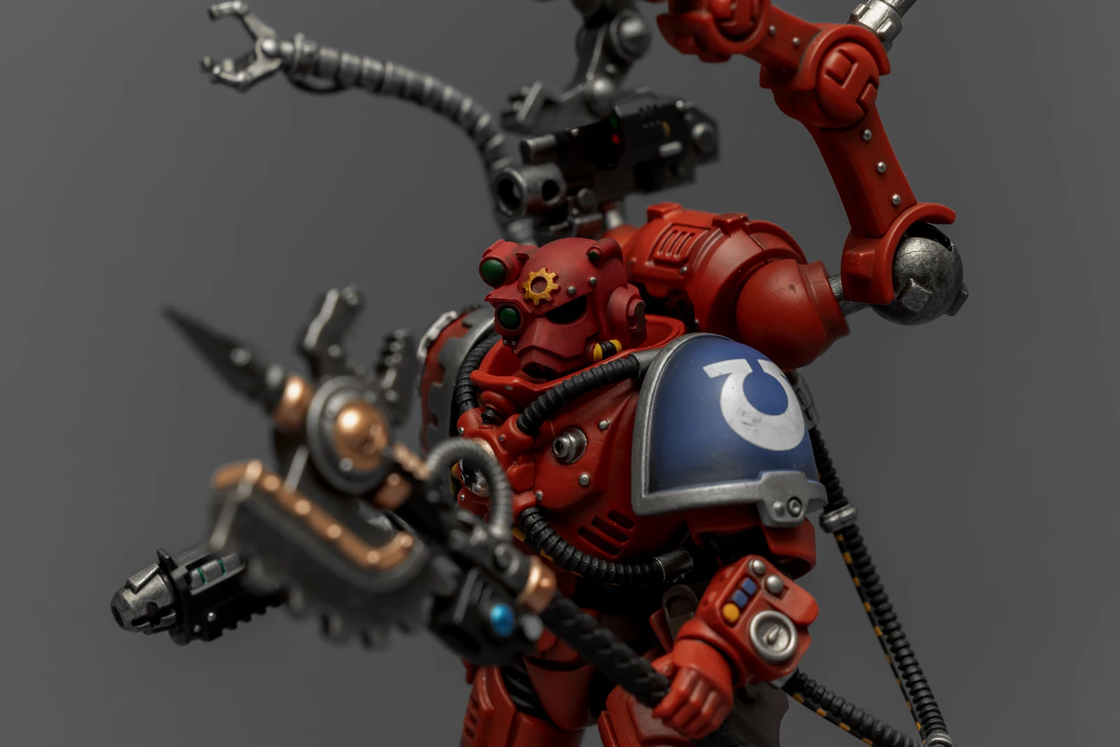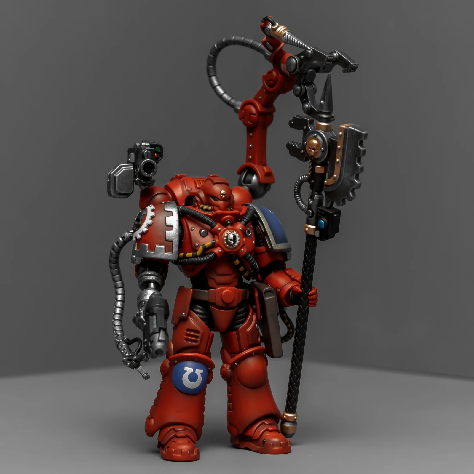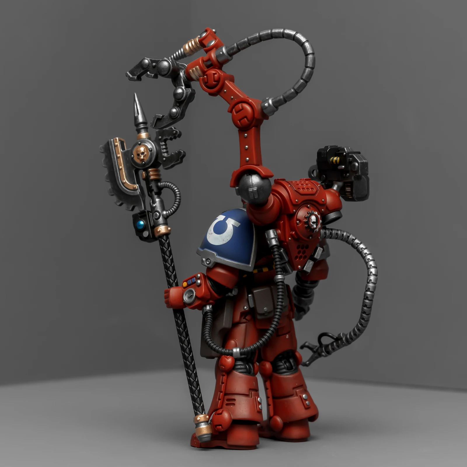 暗源这只原铸技术军士和以前一样,都是照搬GW的棋子造型,但增加了一个人物设定,命名为泰贝斯提斯兄弟。右臂替换成了机械臂,动力甲有着很多适应机械改造的调整,全身涂成红色,左肩和右膝保留了极限战士的蓝色和U字标志,风格上和普通动力甲也有所不同。