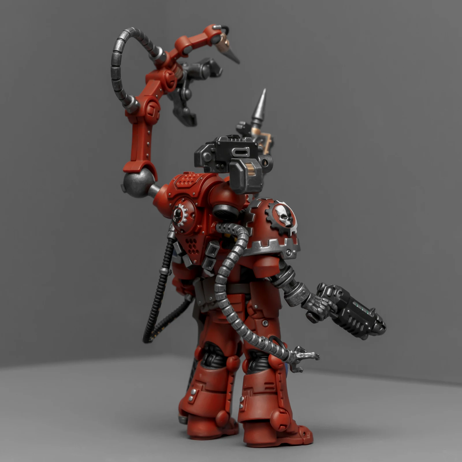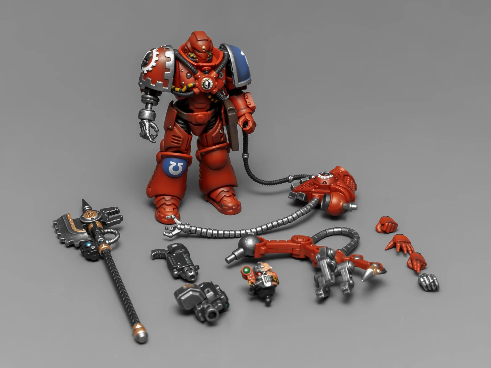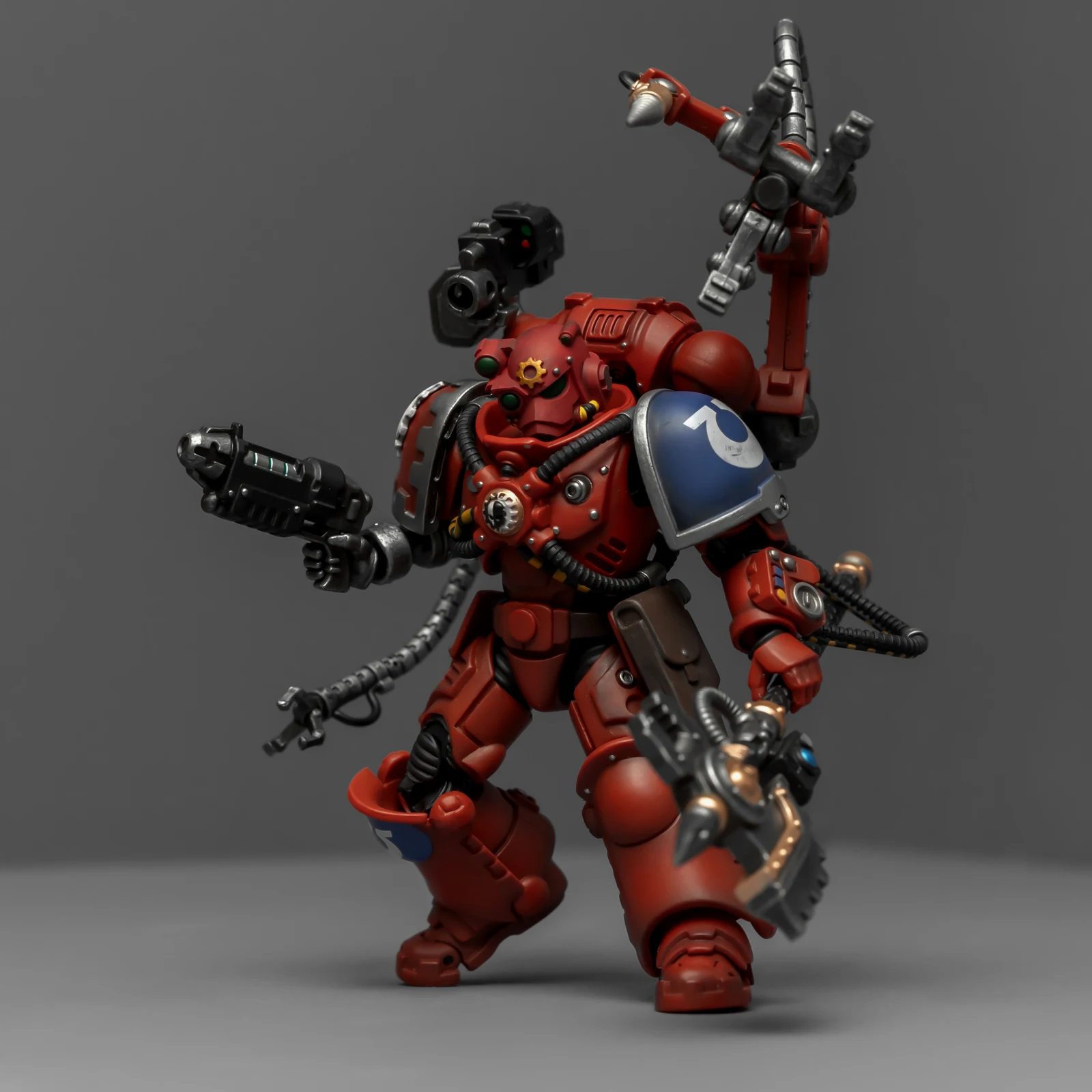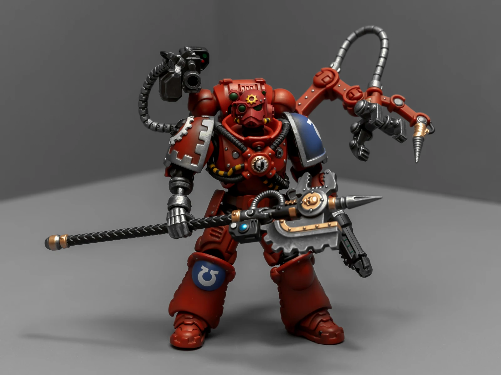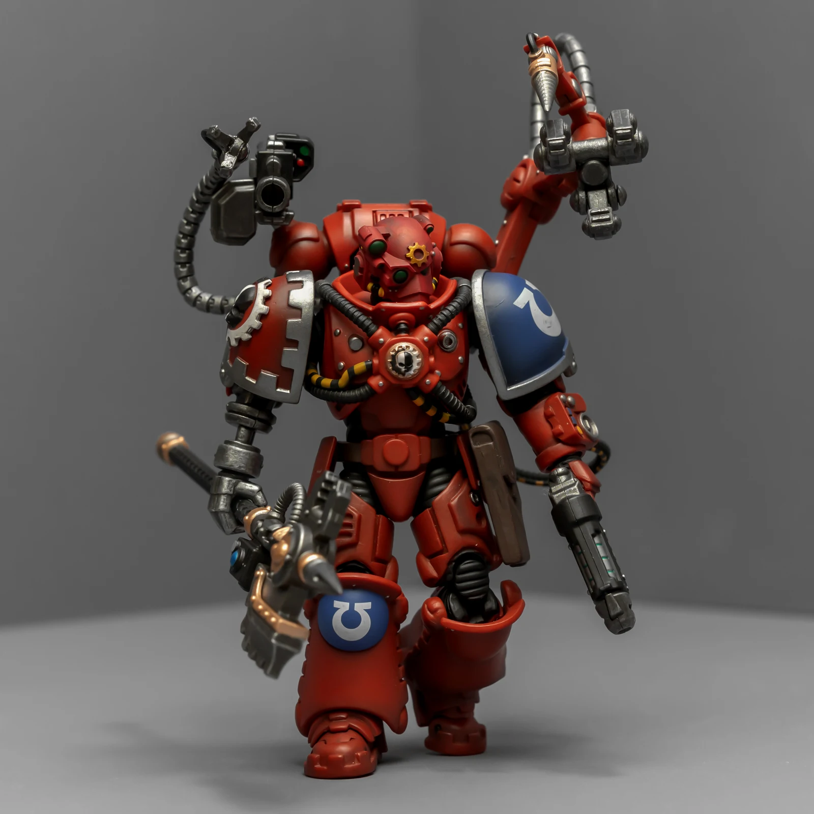 暗源这只原铸技术军士和以前一样,都是照搬GW的棋子造型,但增加了一个人物设定,命名为泰贝斯提斯兄弟。右臂替换成了机械臂,动力甲有着很多适应机械改造的调整,全身涂成红色,左肩和右膝保留了极限战士的蓝色和U字标志,风格上和普通动力甲也有所不同。