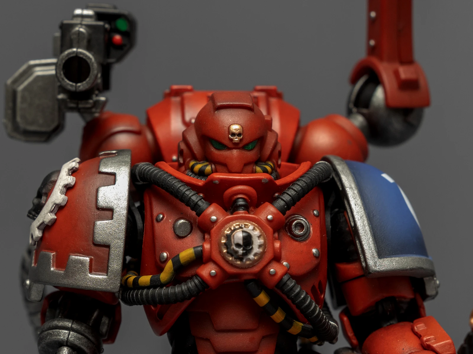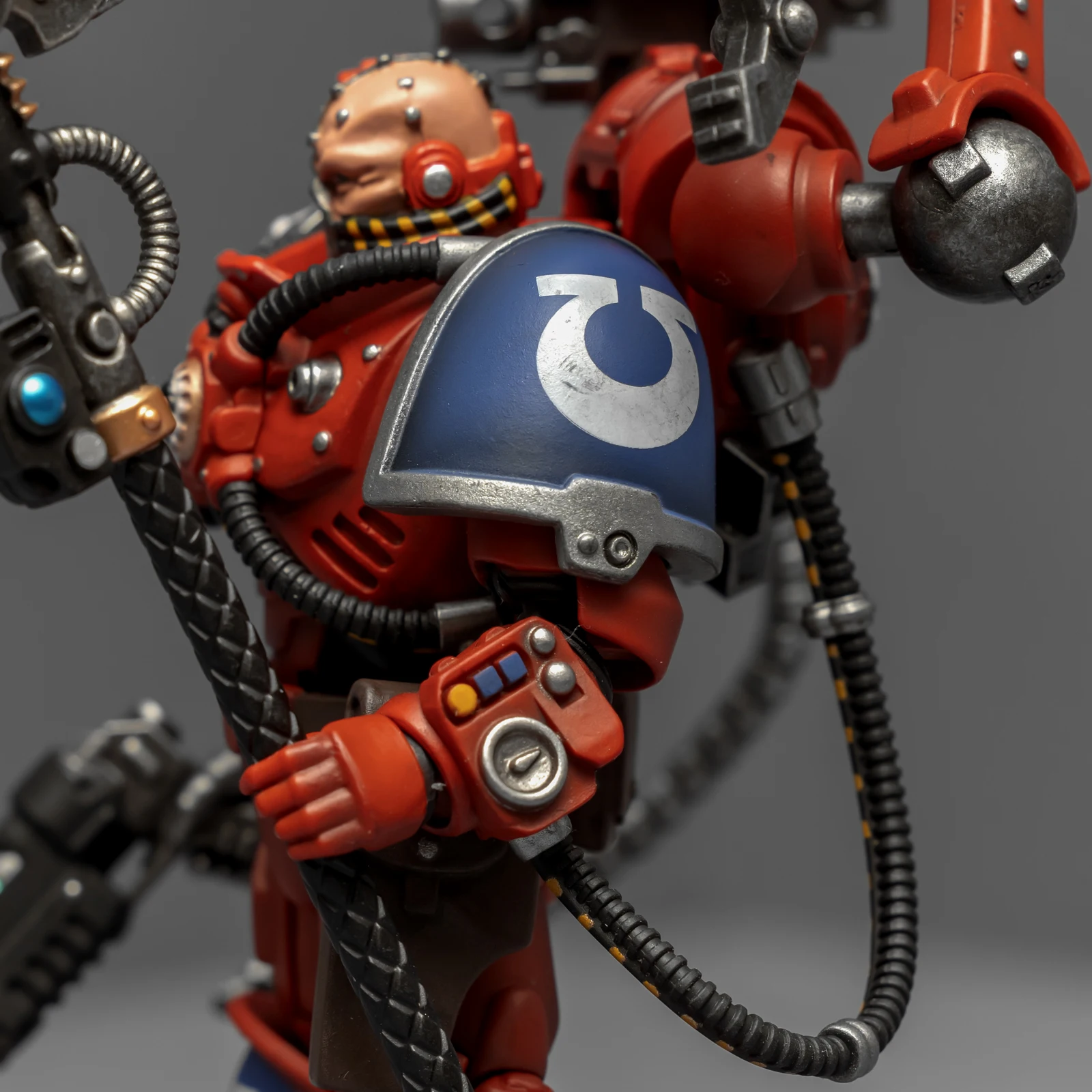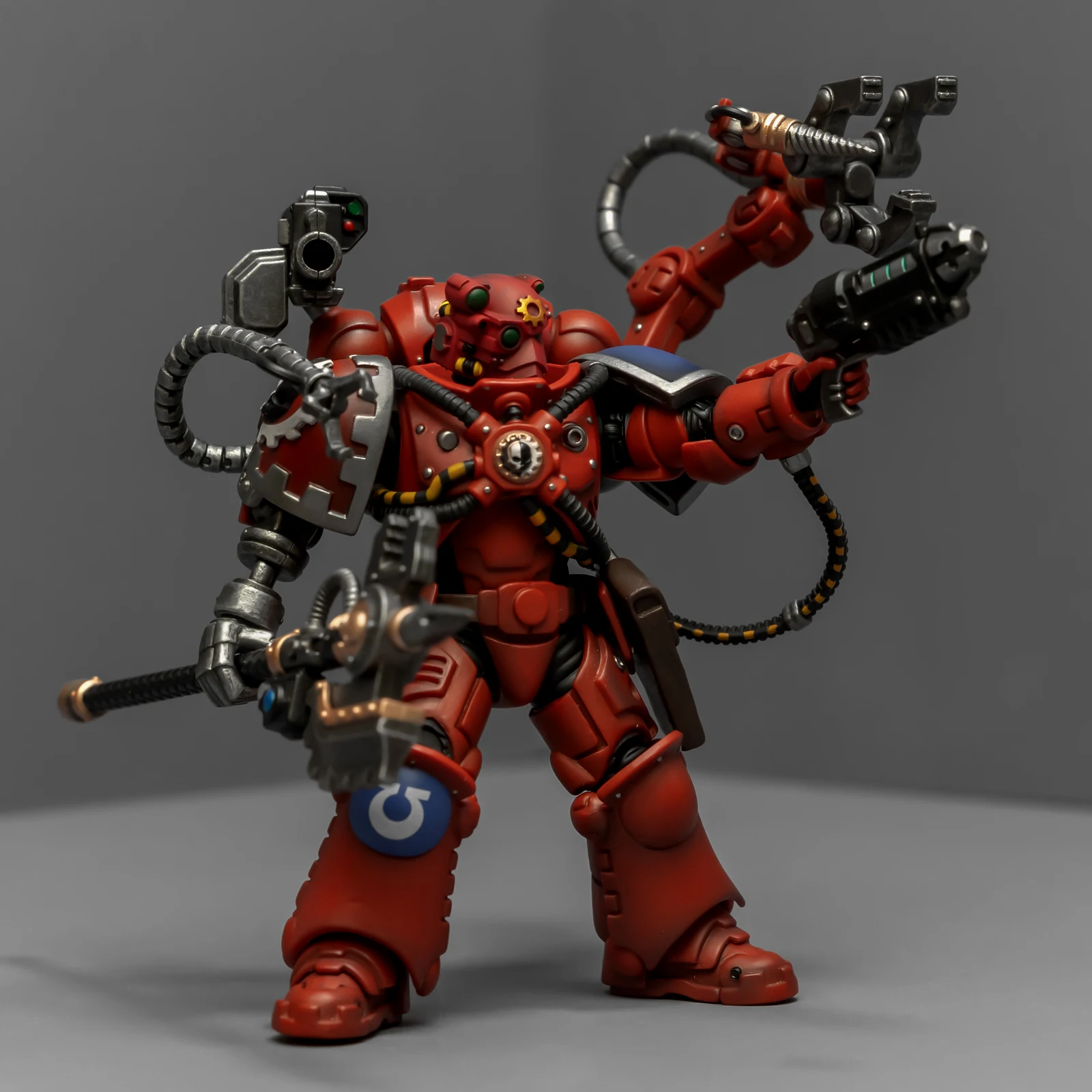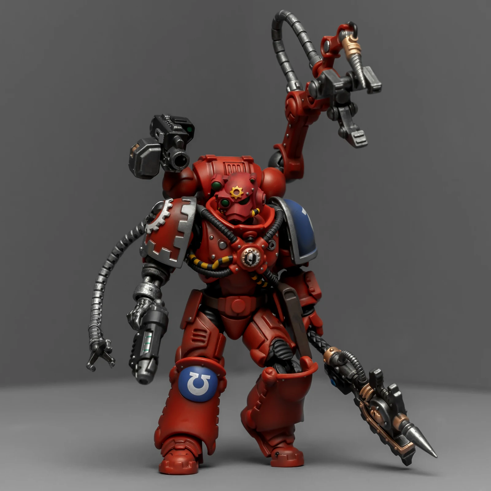 暗源这只原铸技术军士和以前一样,都是照搬GW的棋子造型,但增加了一个人物设定,命名为泰贝斯提斯兄弟。右臂替换成了机械臂,动力甲有着很多适应机械改造的调整,全身涂成红色,左肩和右膝保留了极限战士的蓝色和U字标志,风格上和普通动力甲也有所不同。
