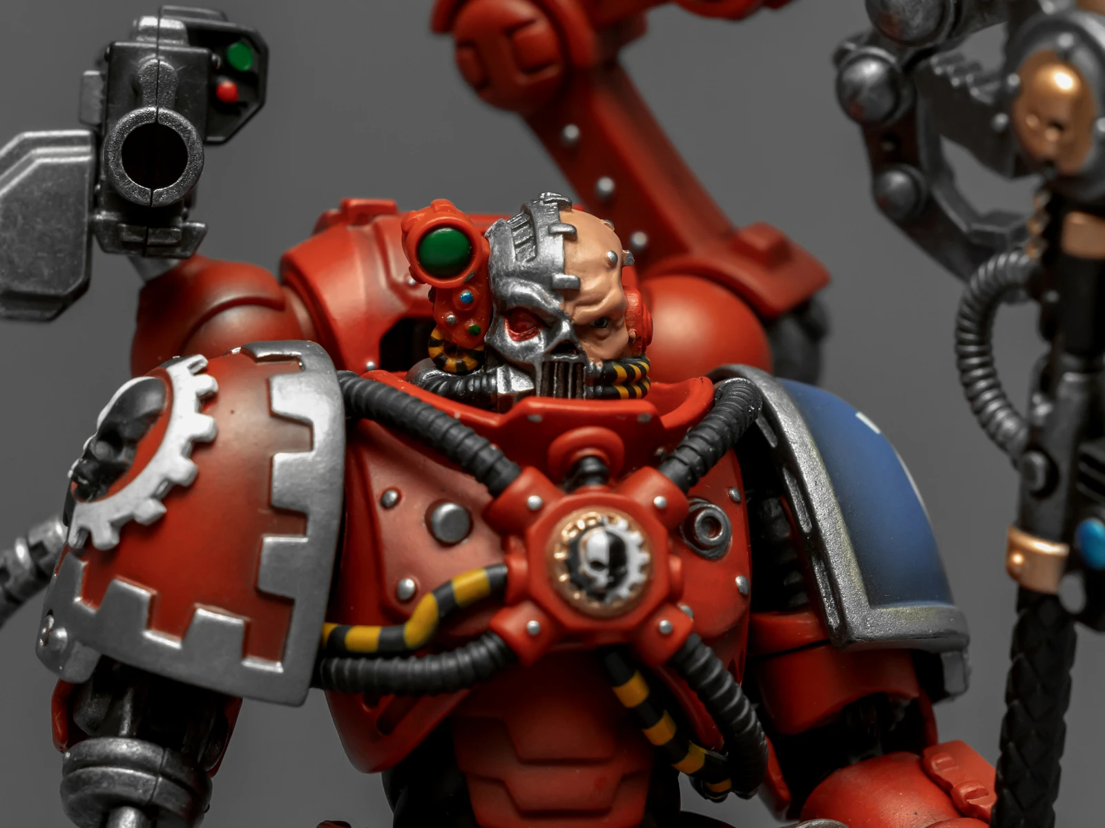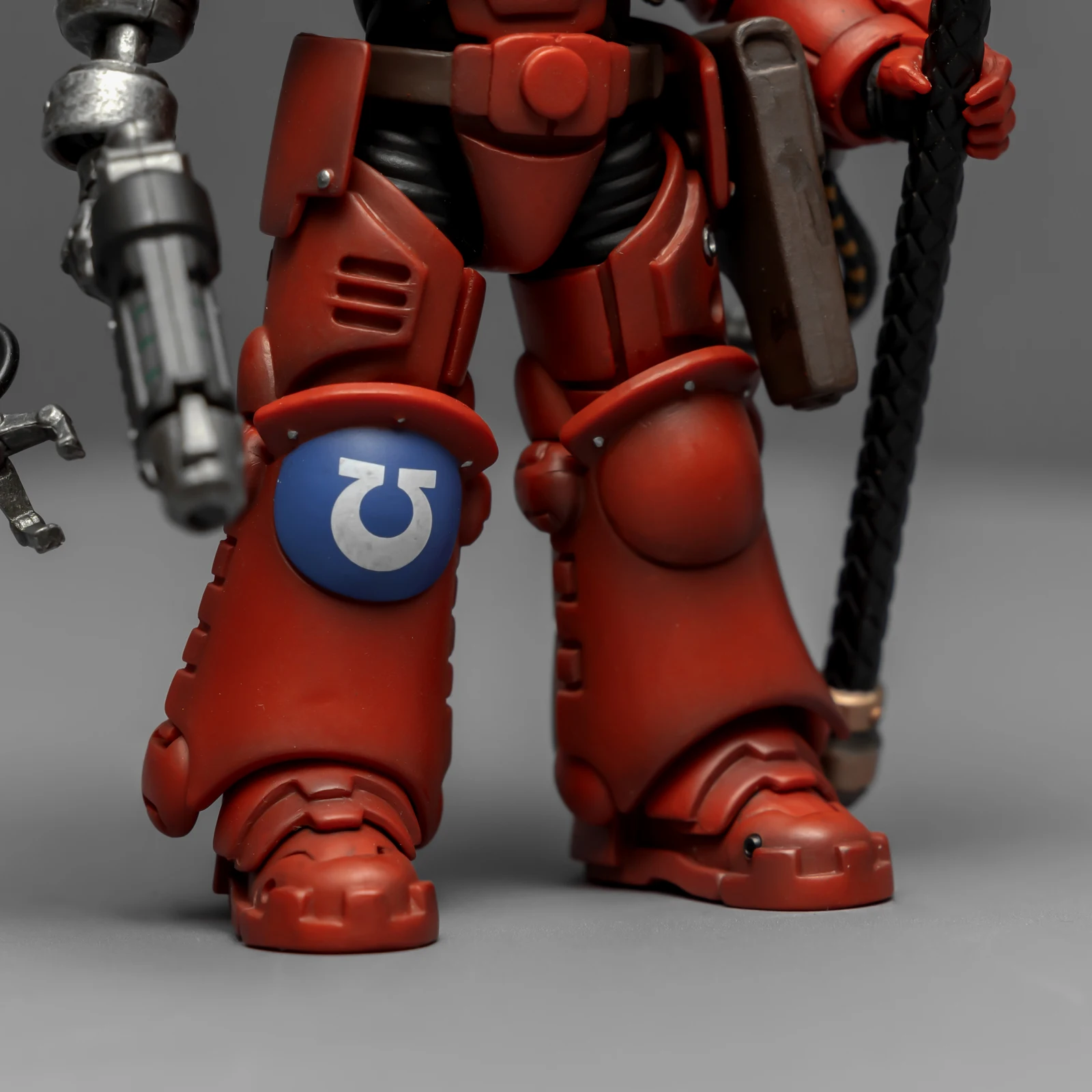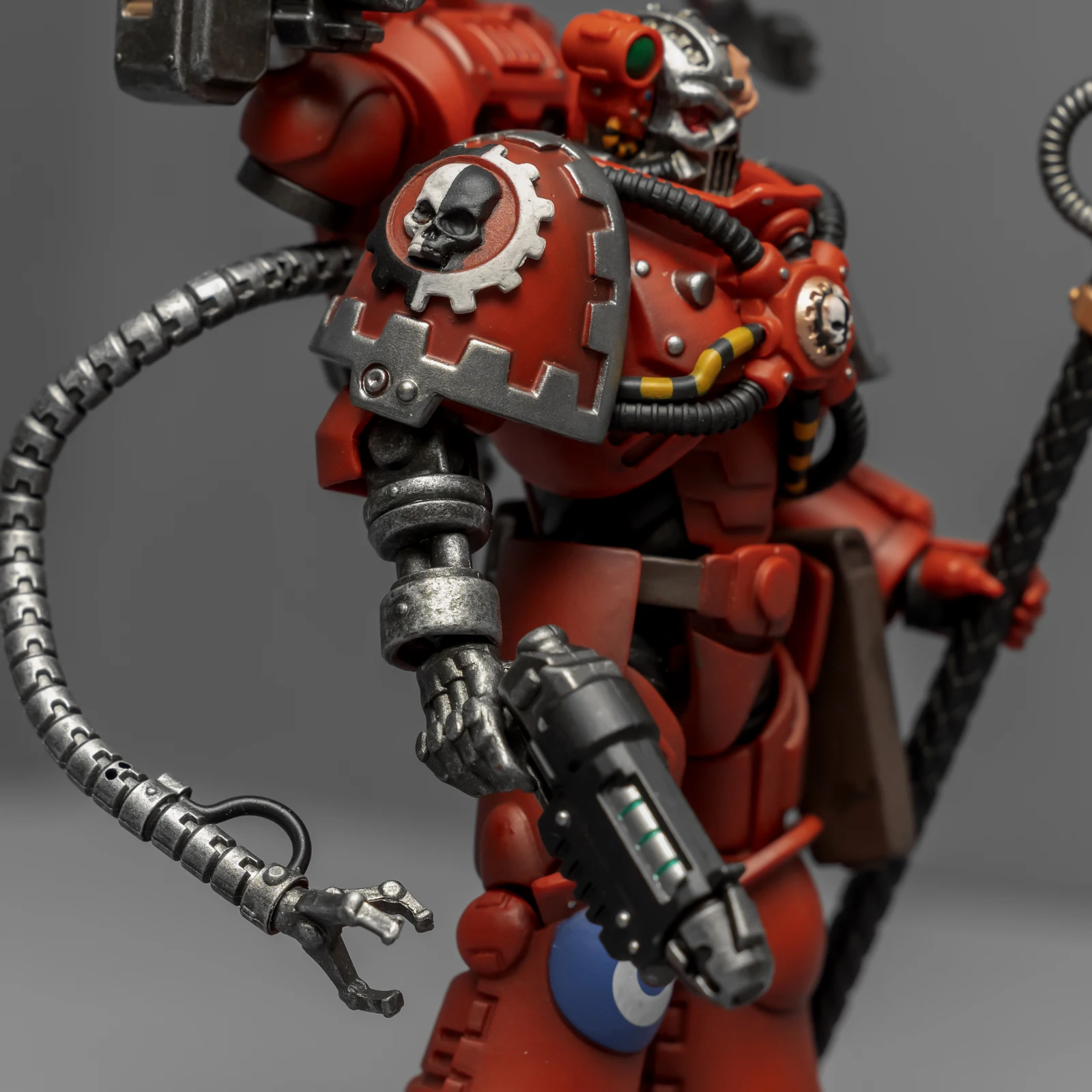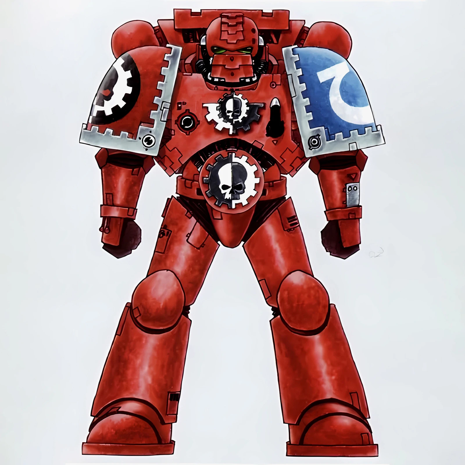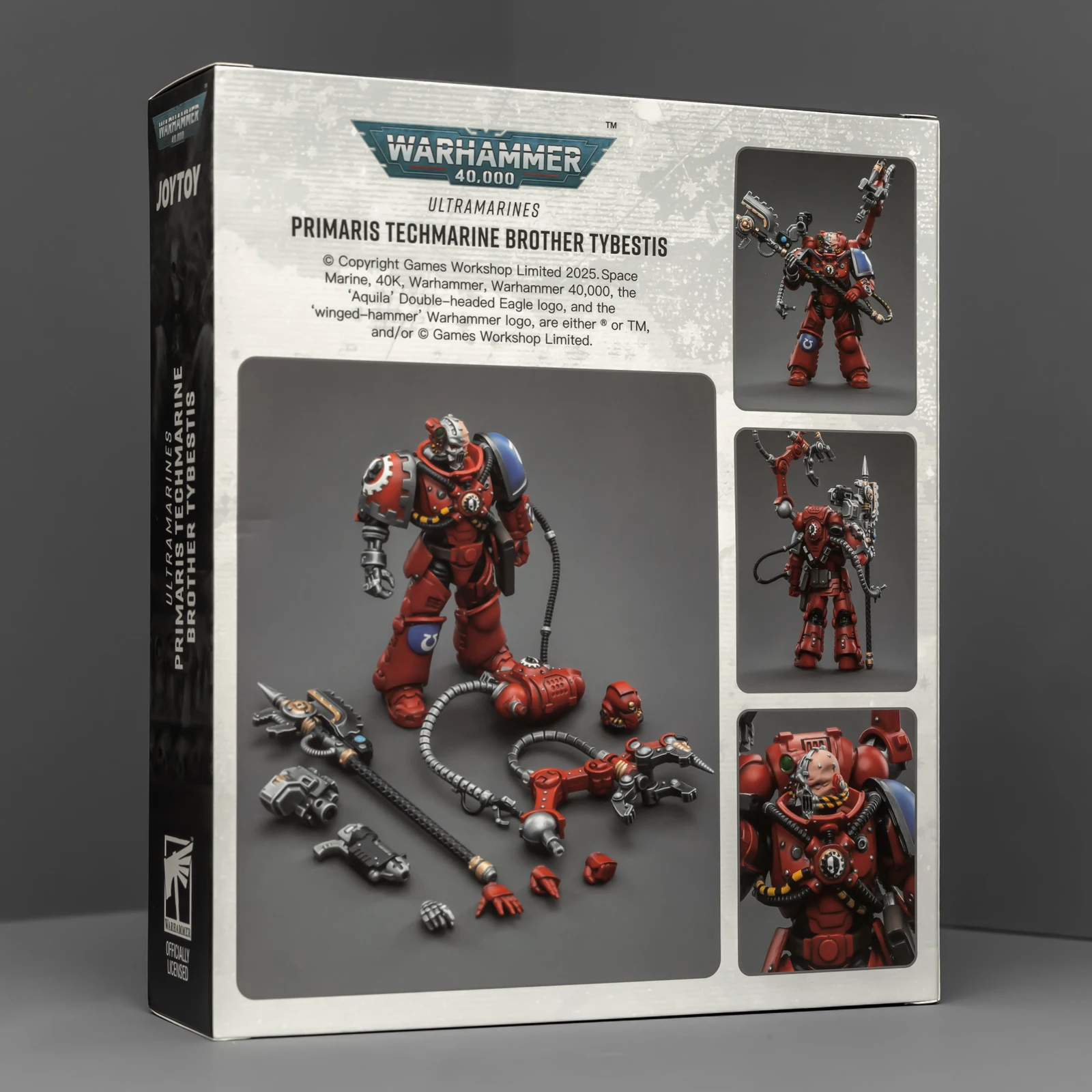 暗源这只原铸技术军士和以前一样,都是照搬GW的棋子造型,但增加了一个人物设定,命名为泰贝斯提斯兄弟。右臂替换成了机械臂,动力甲有着很多适应机械改造的调整,全身涂成红色,左肩和右膝保留了极限战士的蓝色和U字标志,风格上和普通动力甲也有所不同。