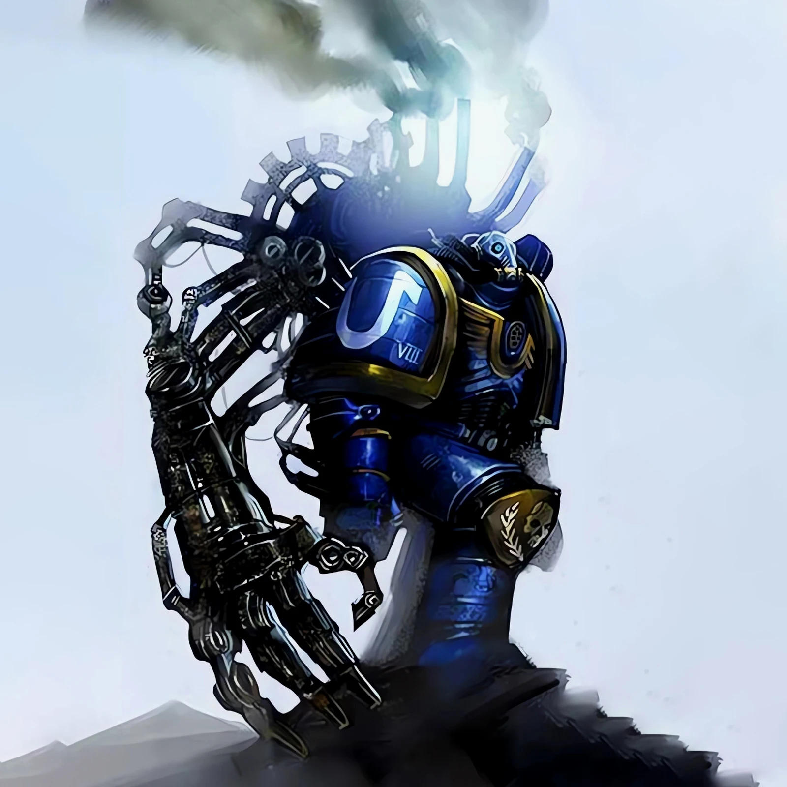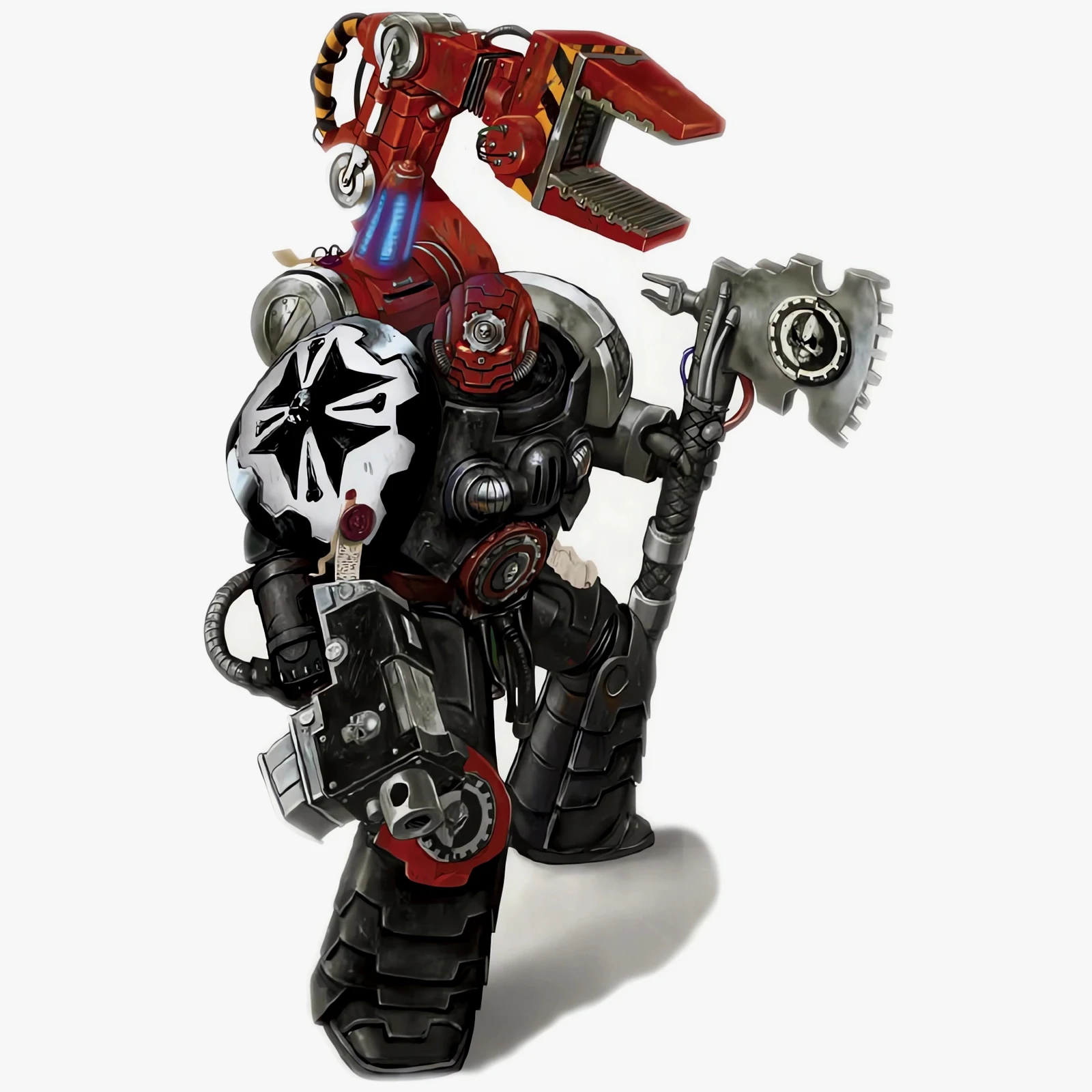技术军士是在火星机械教学成归来的星际战士,他们信奉万机之神,经过长期学习和身体改造,负责维护和制造战团军械。技术军士配有很多机械神教常用的装备,包括伺服臂。为了展现身份、与机械教的联系,技术军士常常会将动力甲涂装成红色、增加机械神教标志,同时配有欧姆尼赛亚动力斧。