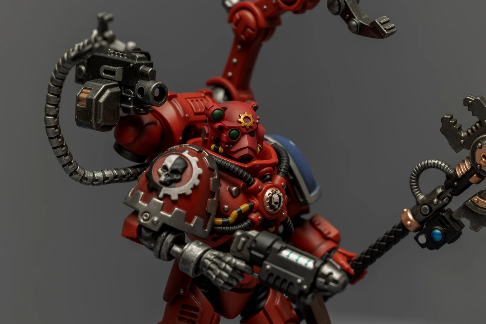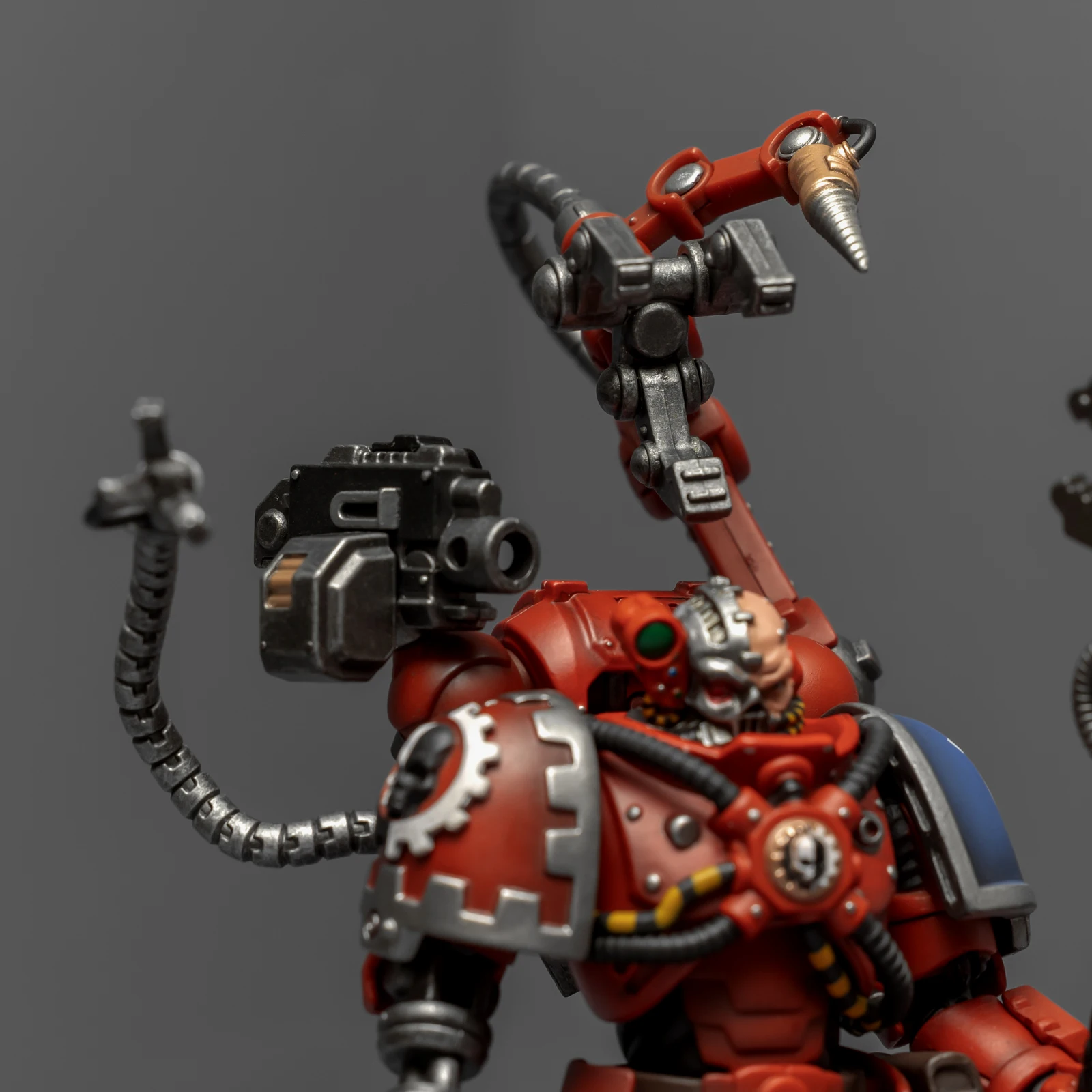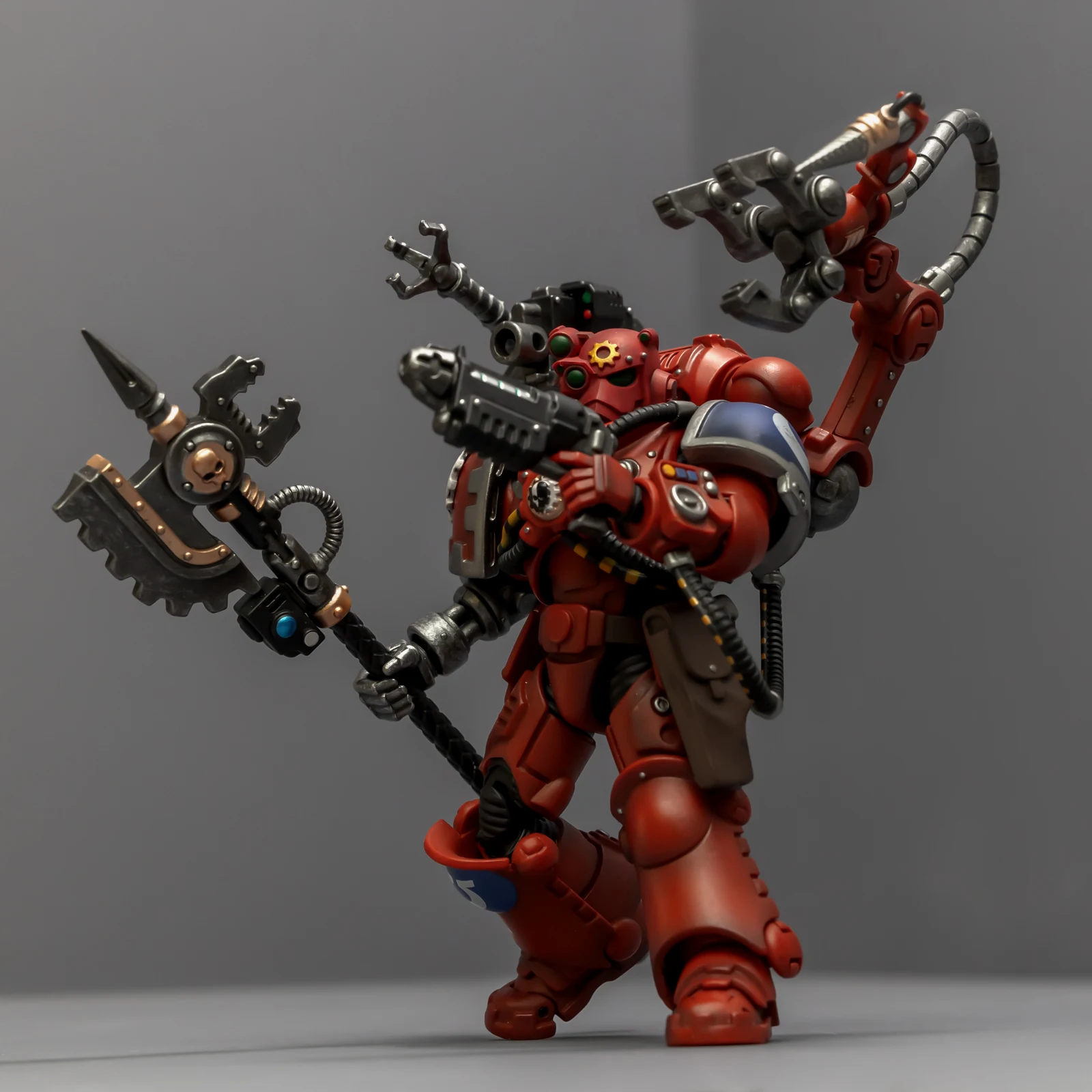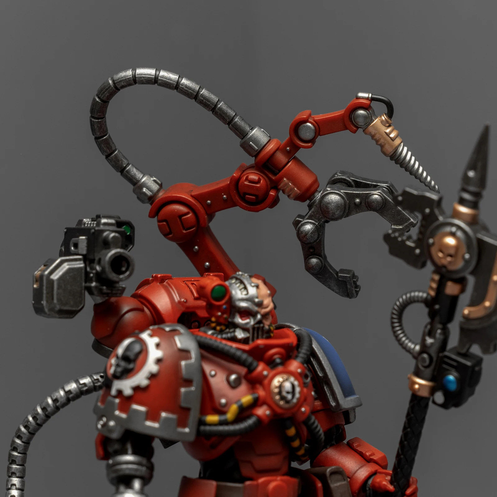 机械军士的背包是我很喜欢的圣诞树式造型,附加了多个伺服臂和能遥控射击的爆弹枪,都有很高的可动性。配有的武器除了欧姆尼赛亚动力斧之外还有把重力枪,双手巨斧造型的欧姆尼赛亚动力斧更像一柄长杖,重力枪的涂装有点差。