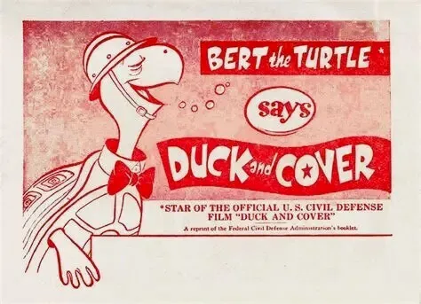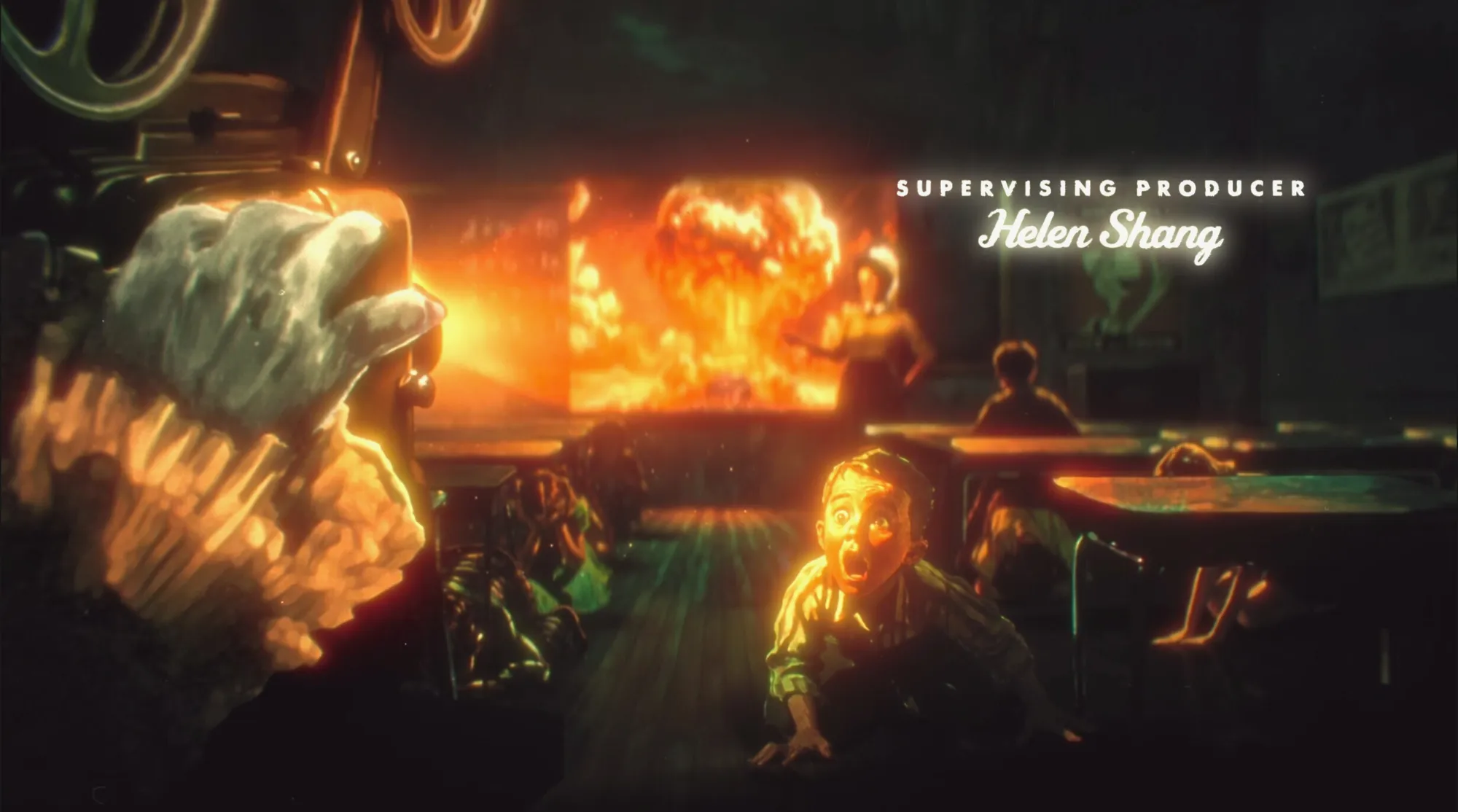 随着镜头推移,老房子的背景是核爆蘑菇云,之后场景进入了教室,能看到一侧墙面上的宣传画以及放映员,这里契合了剧版的时间背景,1962年处于冷战时期,核恐慌催生了防护教育动画片“Duck and Cover”,好巧不巧的是动画片里的形象确实是一只乌龟,而原著中的守护者马图林也是乌龟——啊光束的守护者——无巧不成书在这里又一次具象化。放映员是IT这点很明显,所以那个卧倒的孩子才会一副惊恐的表情。