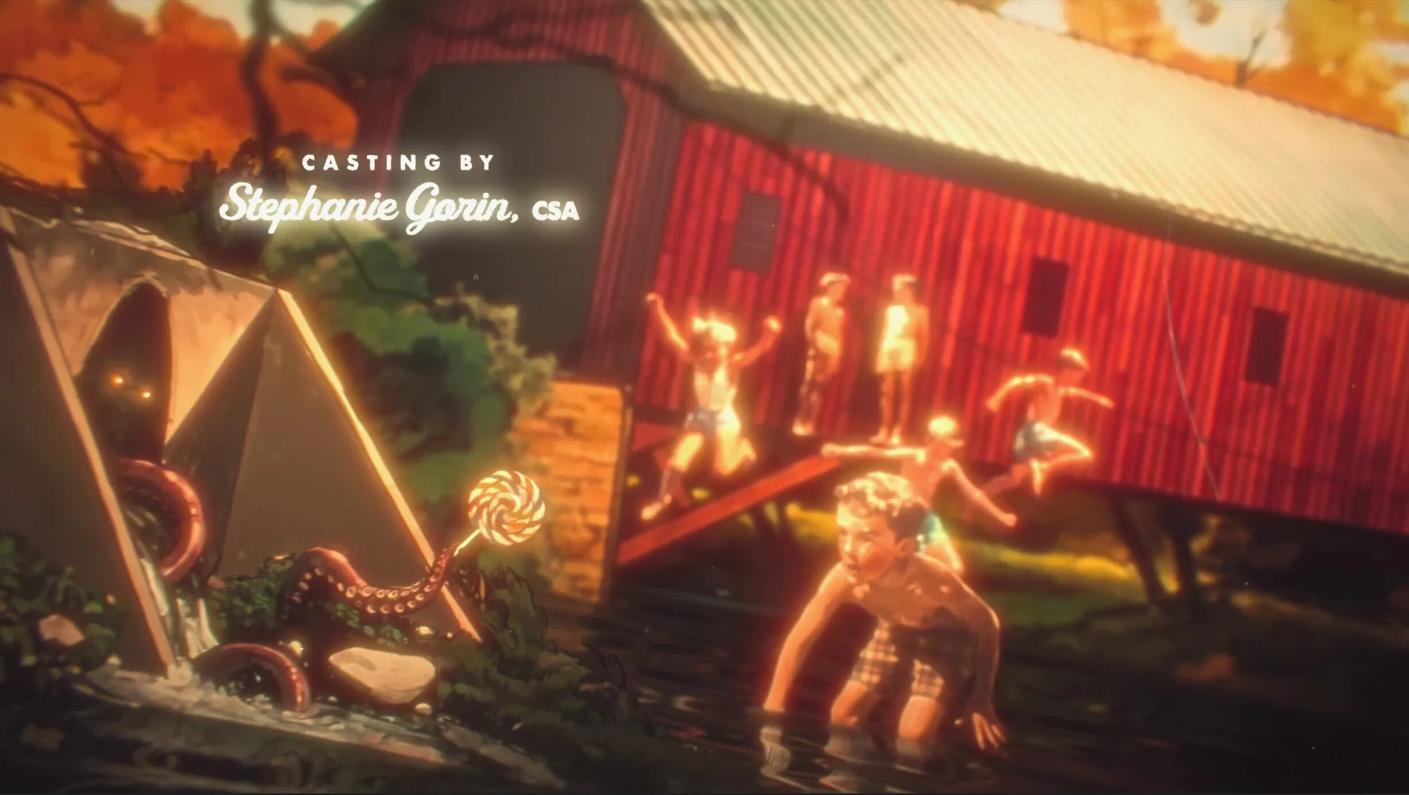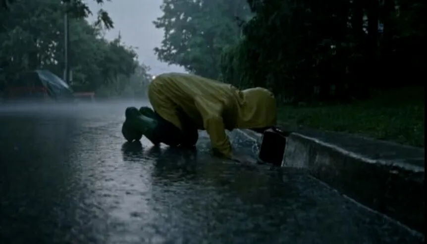 随着而镜头推行,一个小女孩趴在地上向道旁下水口中张望,这个场景致敬了正篇中乔治遭遇IT的情景,乔治的纸船流进下水口,下水道里的IT以小丑潘尼怀斯的形象引诱乔治将手臂伸进下水口中拿纸船,之后将乔治的手臂咬掉导致乔治死亡。