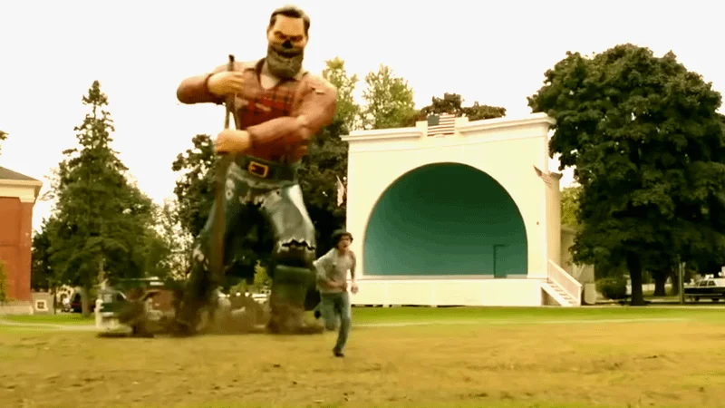首先是那个伐木工塑像,它名叫保罗·班杨,是美国民间传说中的伐木巨人,出生在缅因州,据描述他身高超过60英尺,伐木速度可达"一斧头砍倒整片森林"。作为虚构地的“德里镇”是以缅因州的班戈镇为原型,班戈镇里也有一尊保罗班杨的塑像,老金这属于就地取材。在电影和小说中这个班杨的塑像都作为小丑吓人的工具折腾了里奇。