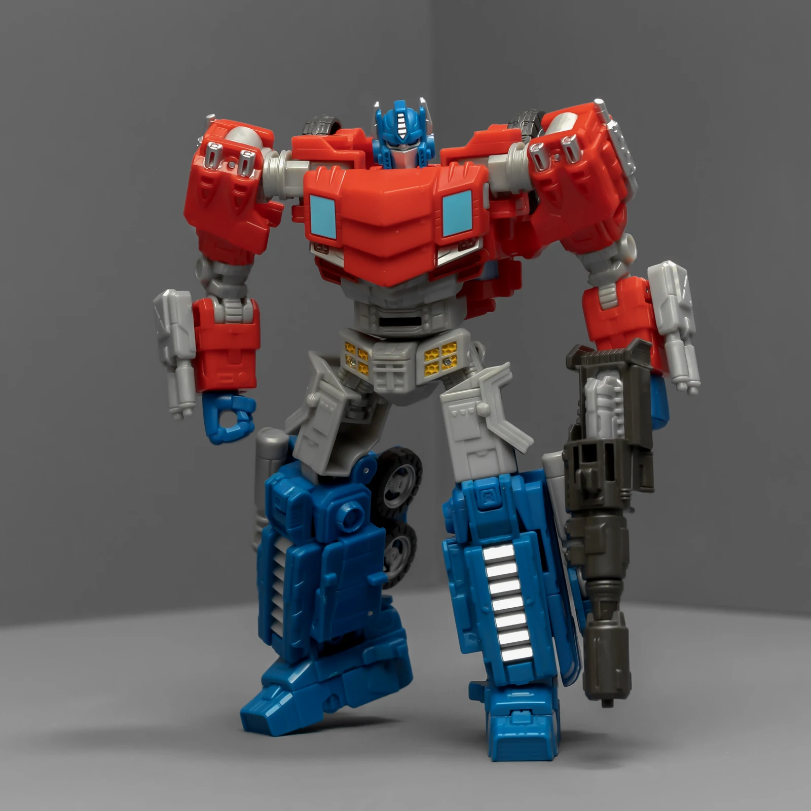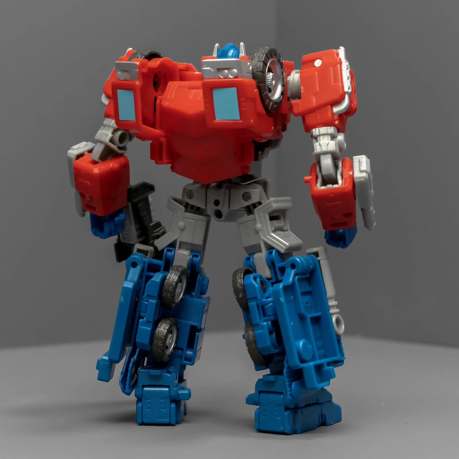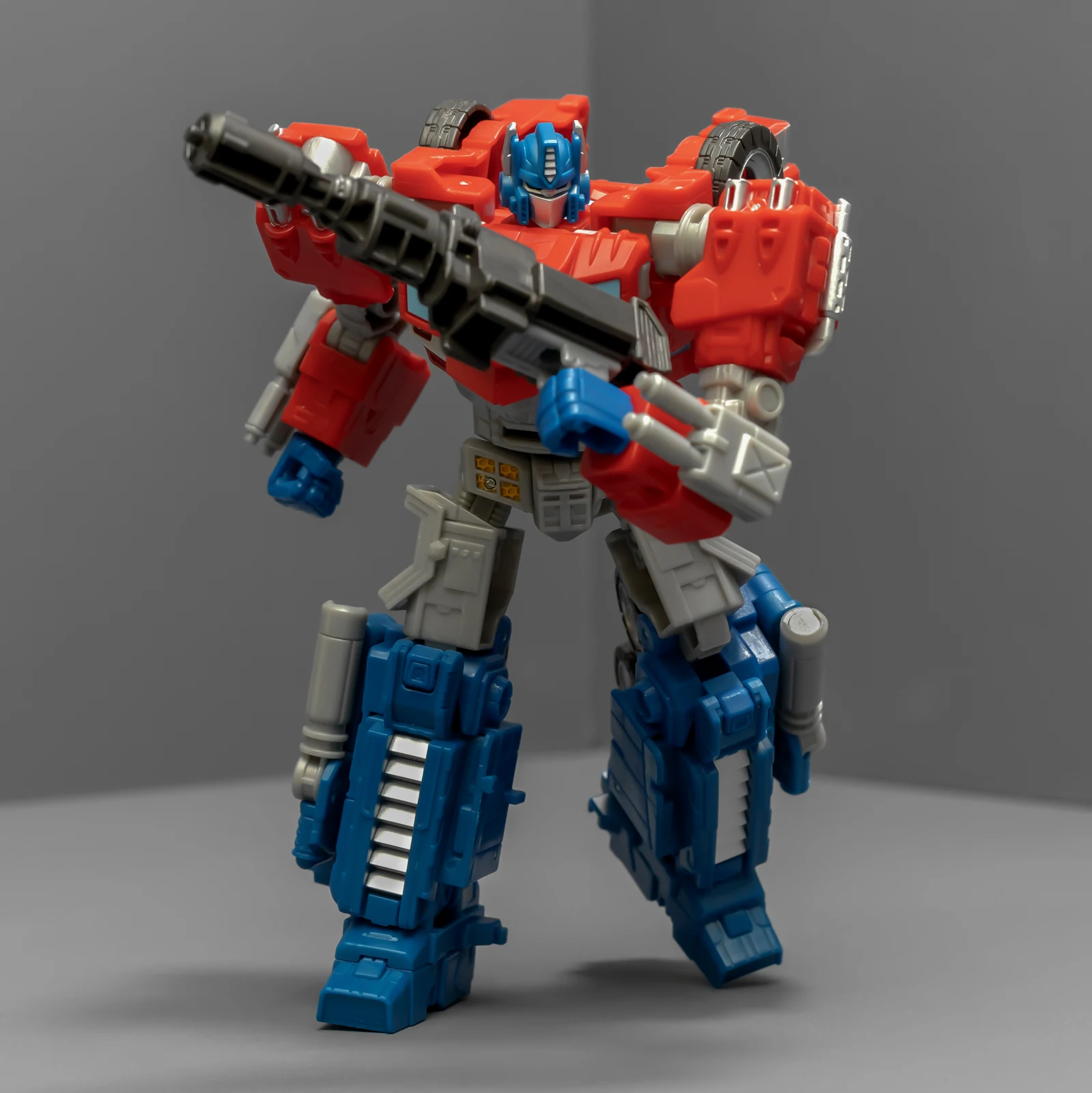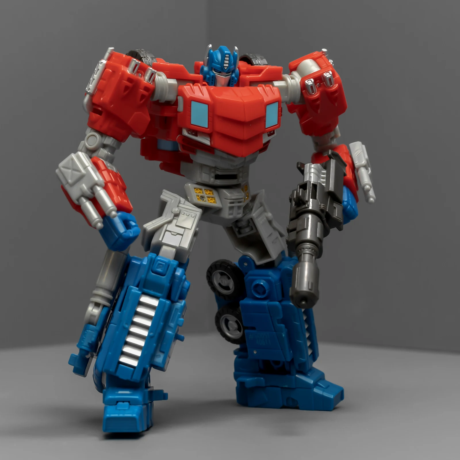 WFC擎天柱的身高比围城威震天要矮,为了让套装显得不奇怪,孩之宝还给这个奥利安做了增高术,把小腿换成了超长的版本,还保留了原来很好的接地关节——就是不肯把大腿偷胶填上。
