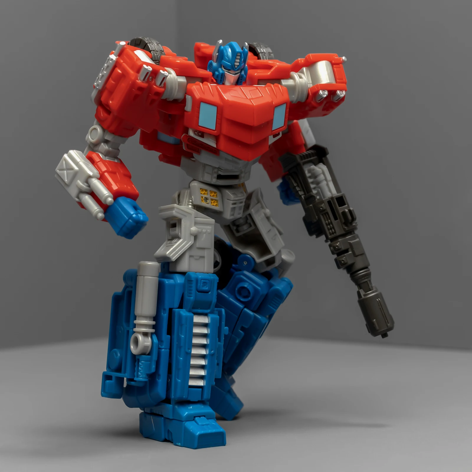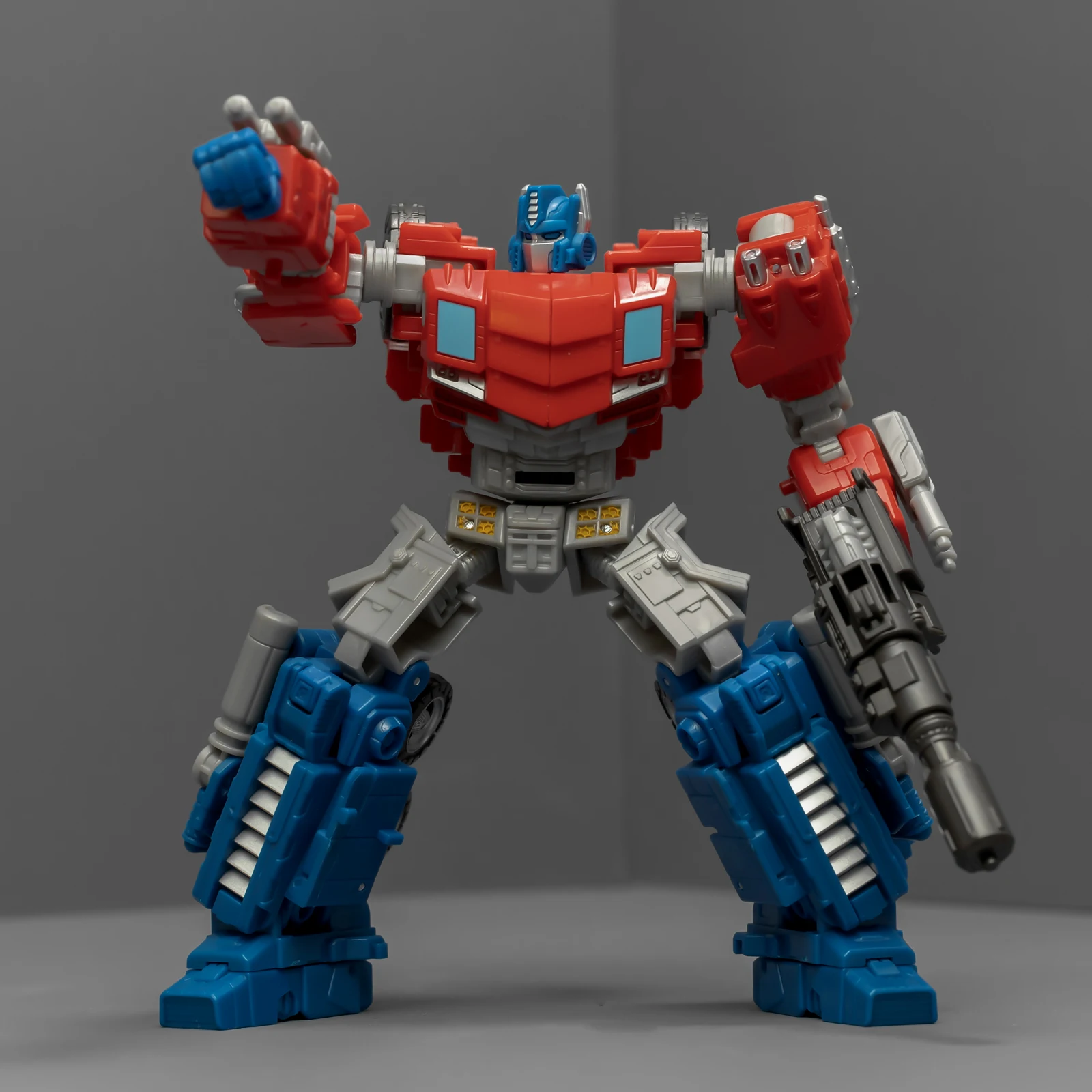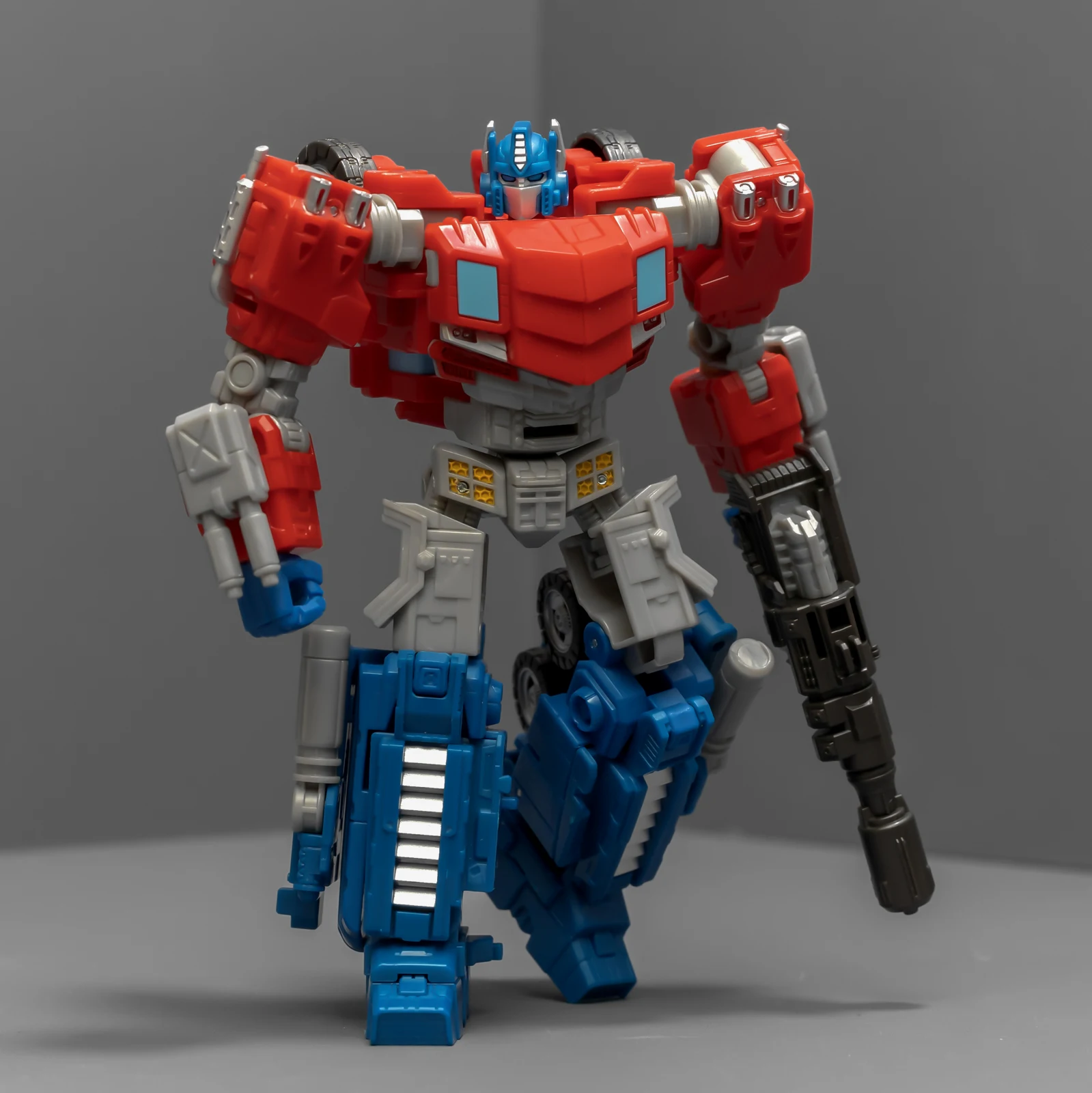 WFC擎天柱的身高比围城威震天要矮,为了让套装显得不奇怪,孩之宝还给这个奥利安做了增高术,把小腿换成了超长的版本,还保留了原来很好的接地关节——就是不肯把大腿偷胶填上。