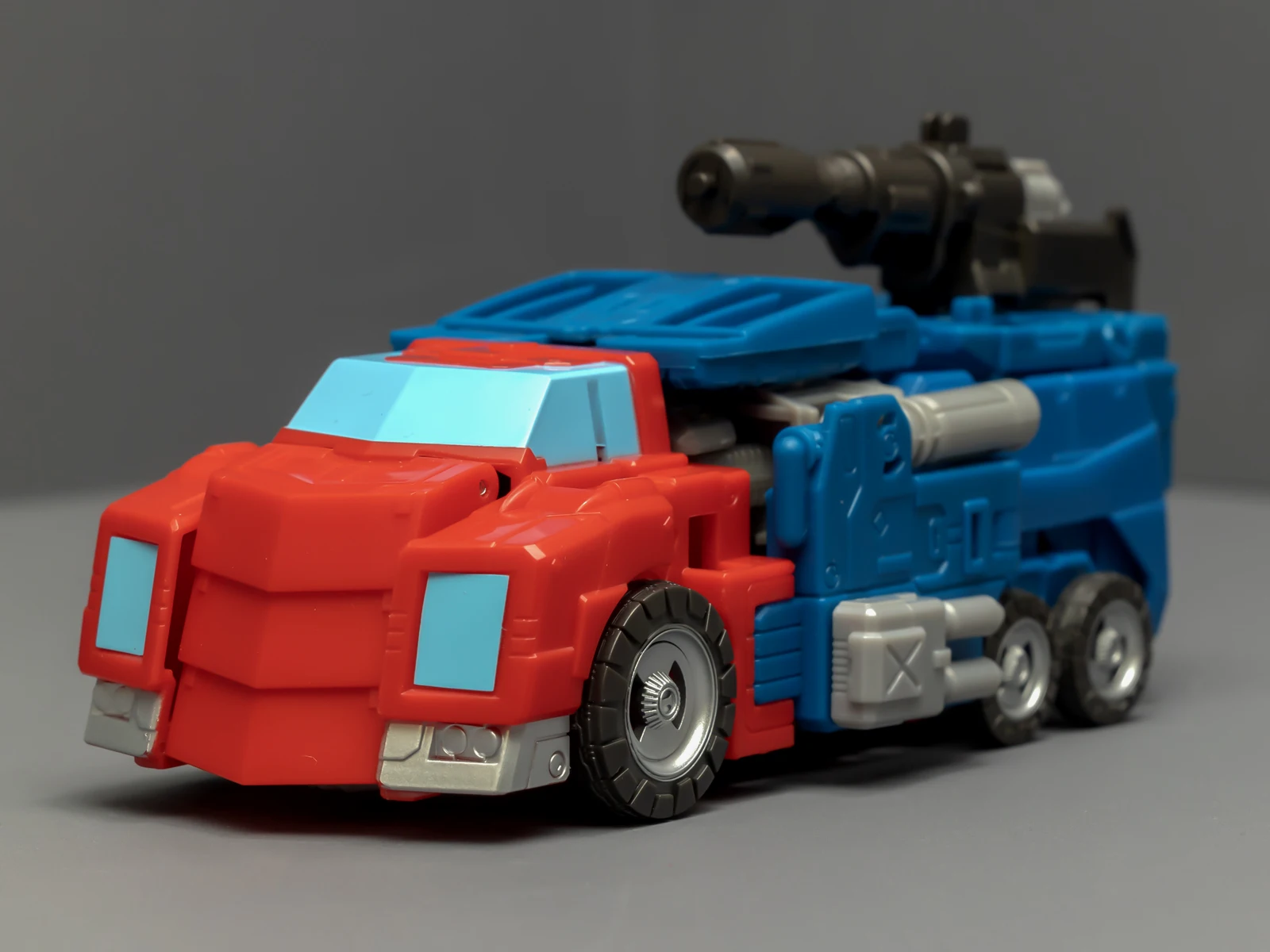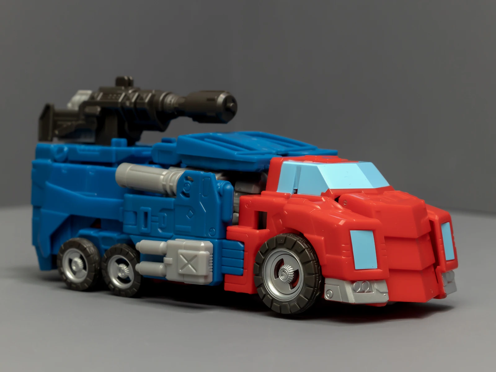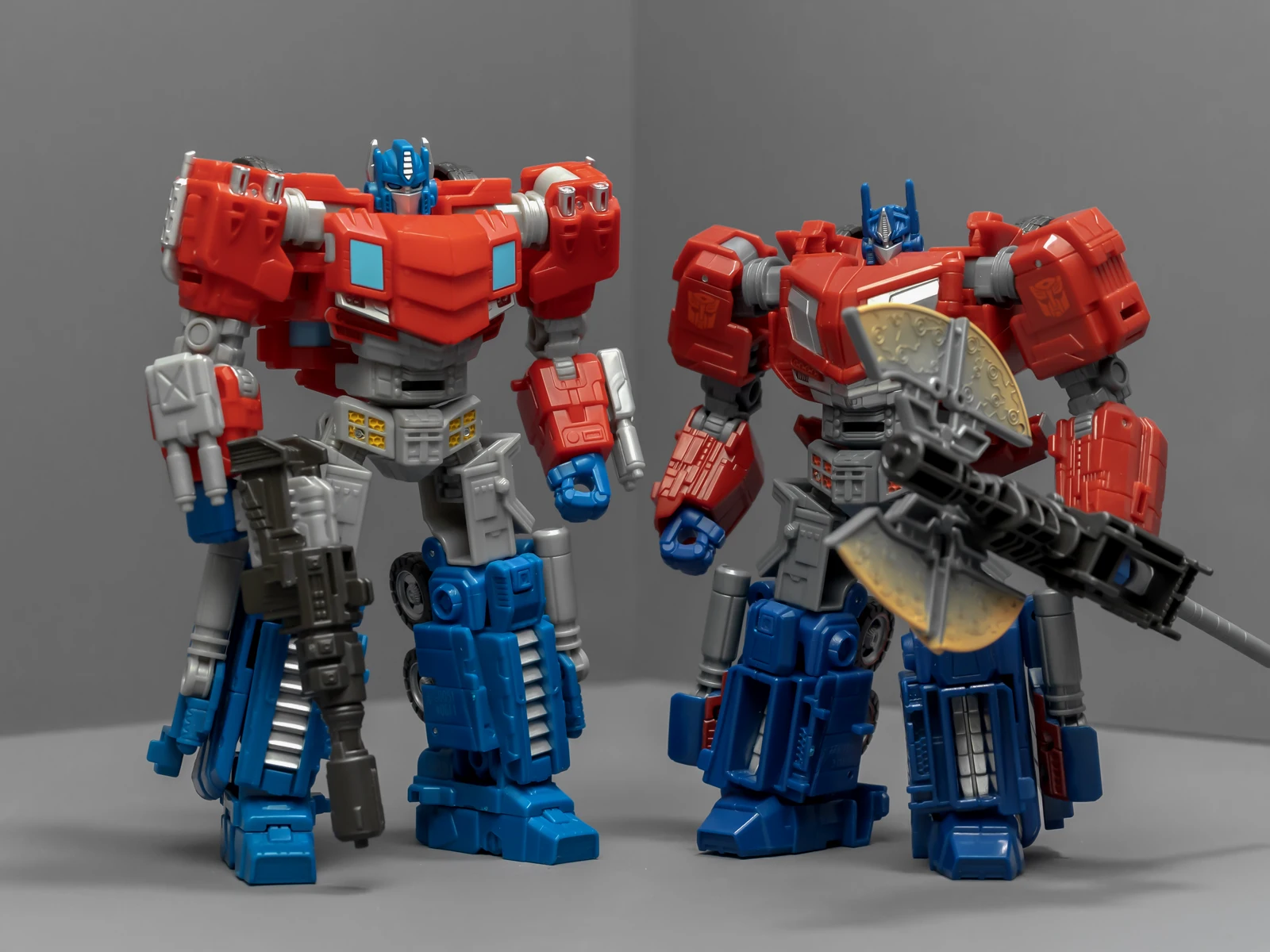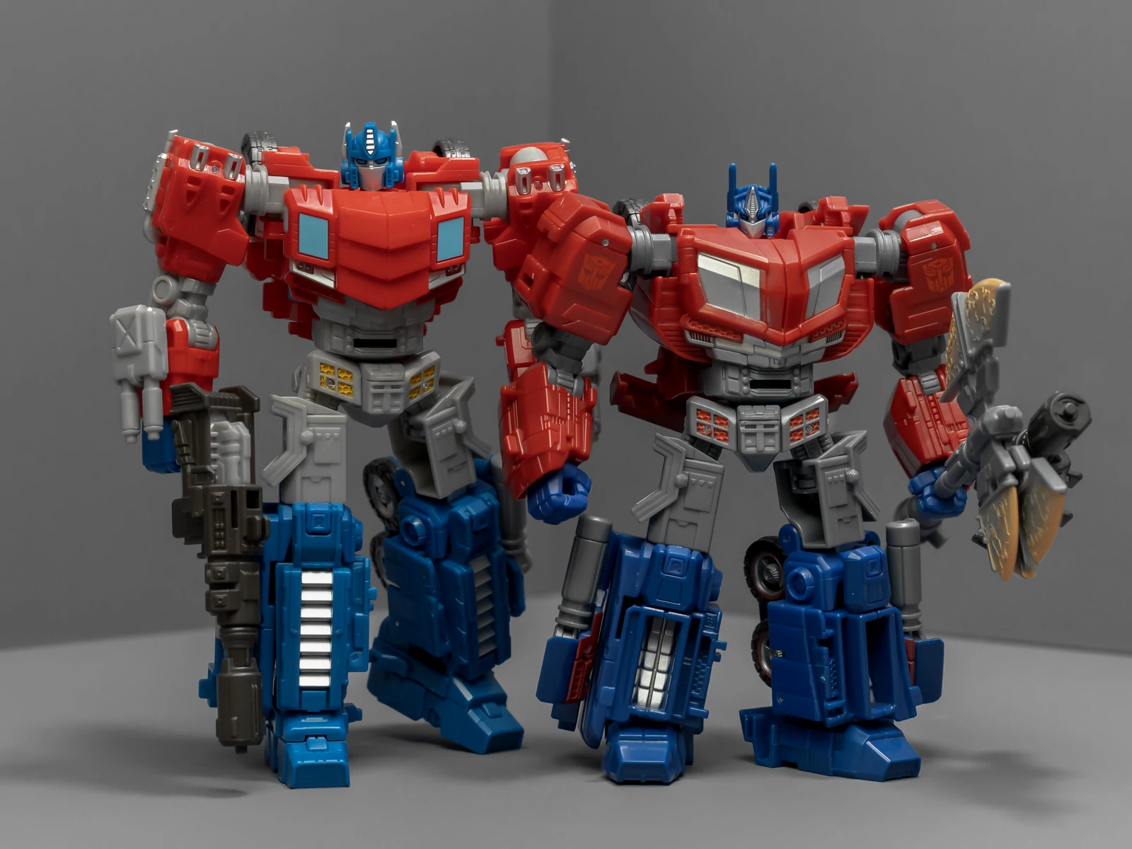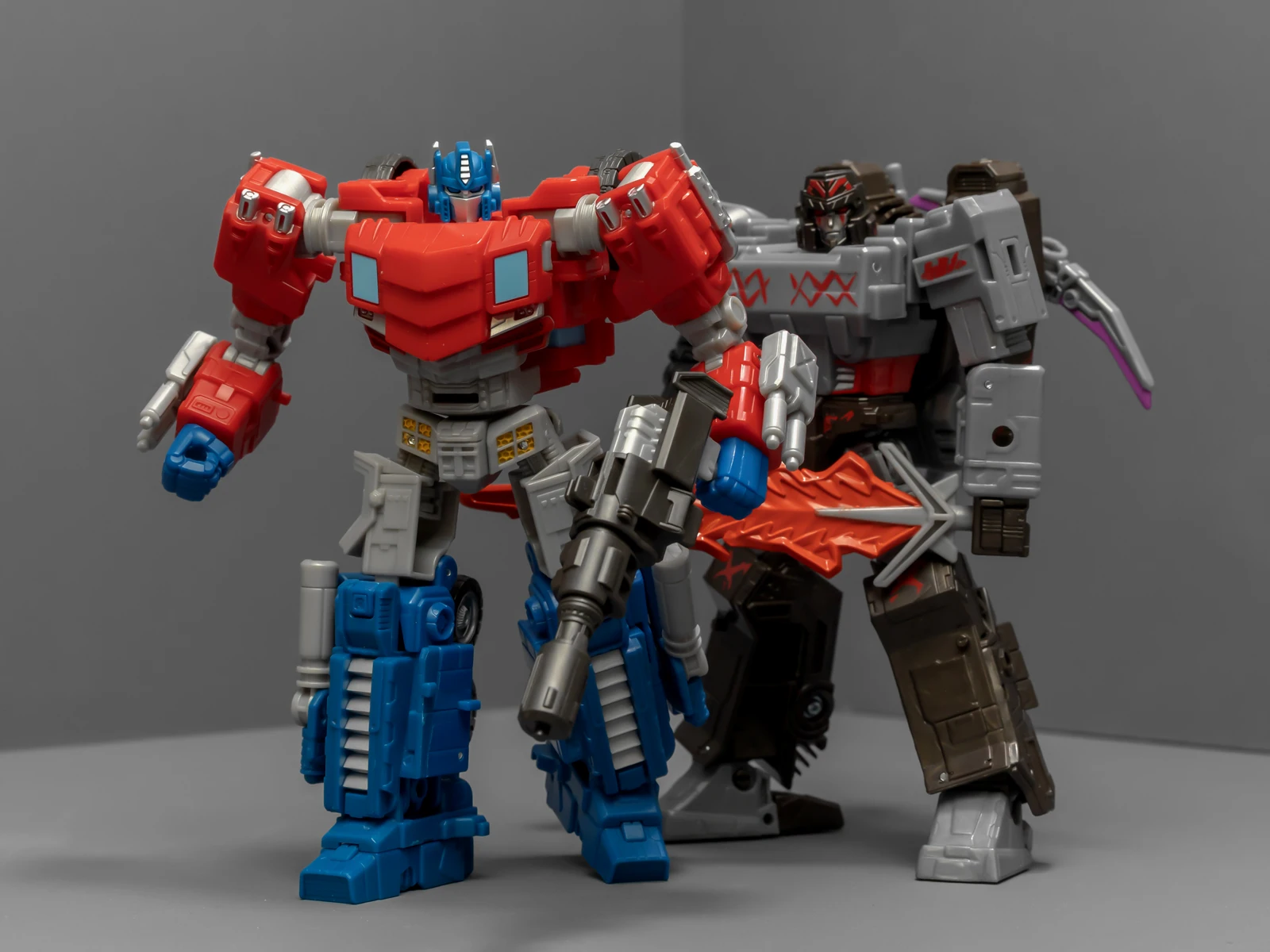 这两位其实不是同一系列的作品,设计时间、设计思路都有差异,可以站在一起,但比较勉强,画风割裂感挺严重的。和奥利安比起来,威震天简直是一坨工业垃圾,车型人形都拉垮地让人反胃,这不是矿工,是垃圾工。就连本该比较出彩的矿工工具,都很多余、不知所谓。为了能再现威震天的融合炮配件形态,我收了一个15块的国产货,各方面都不比这只差。