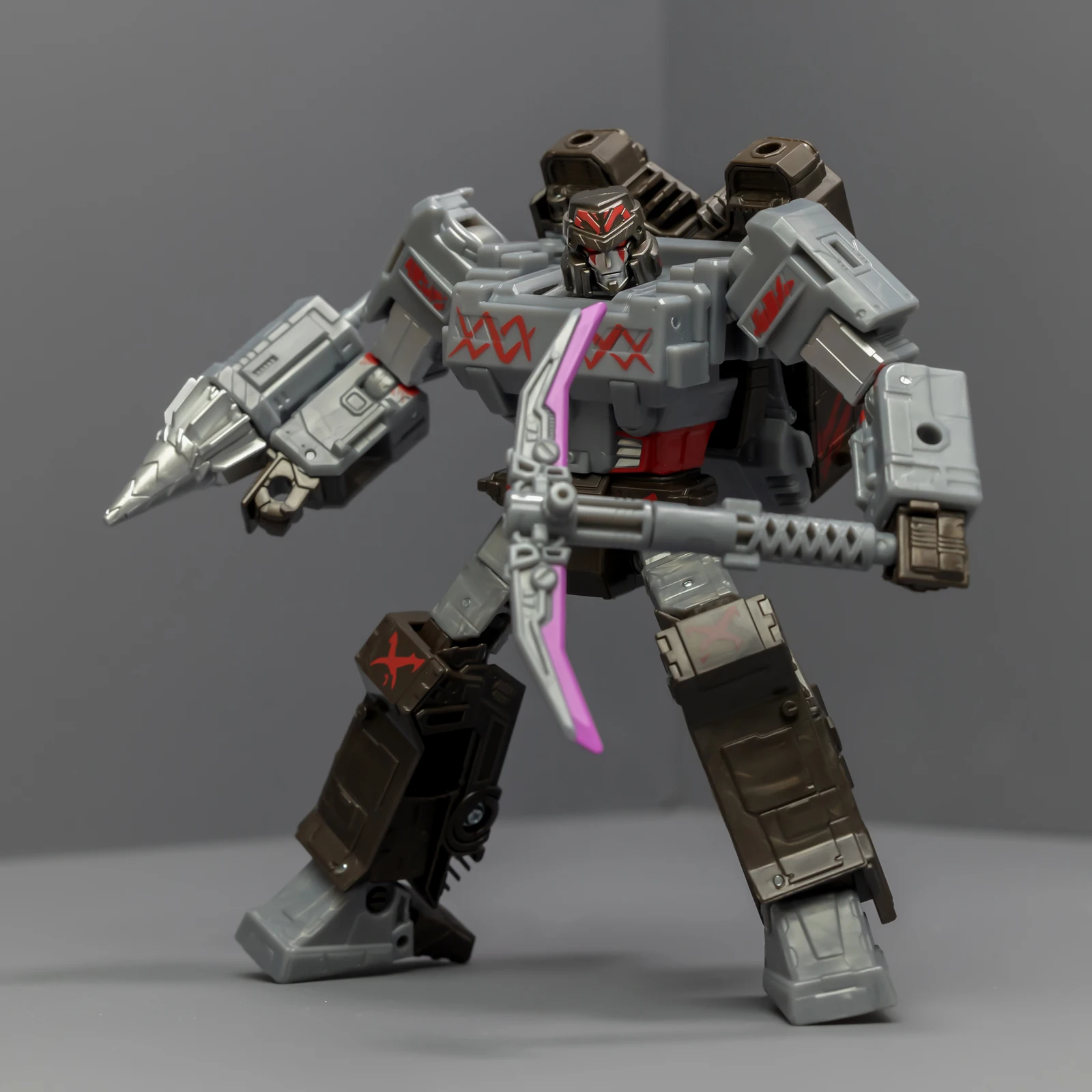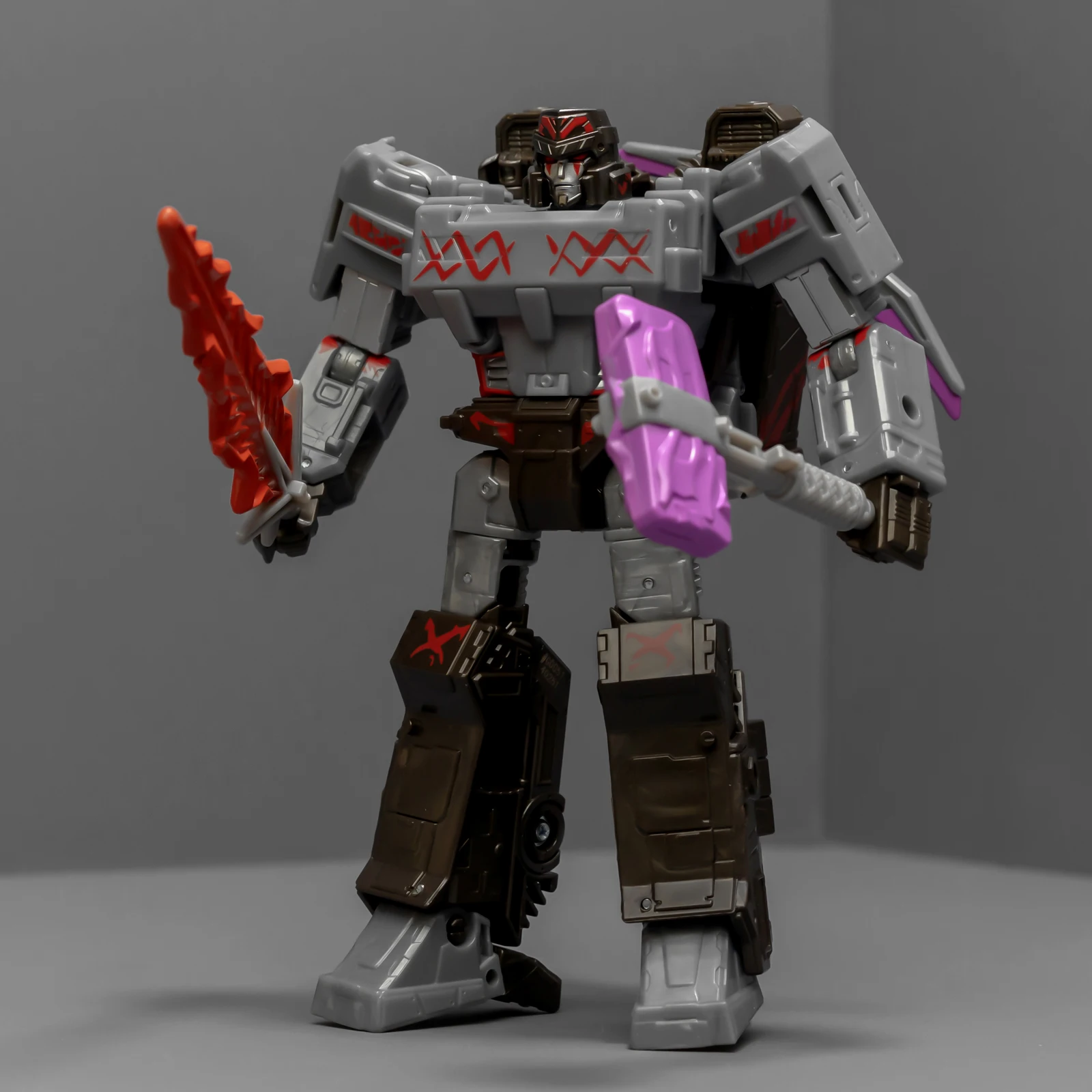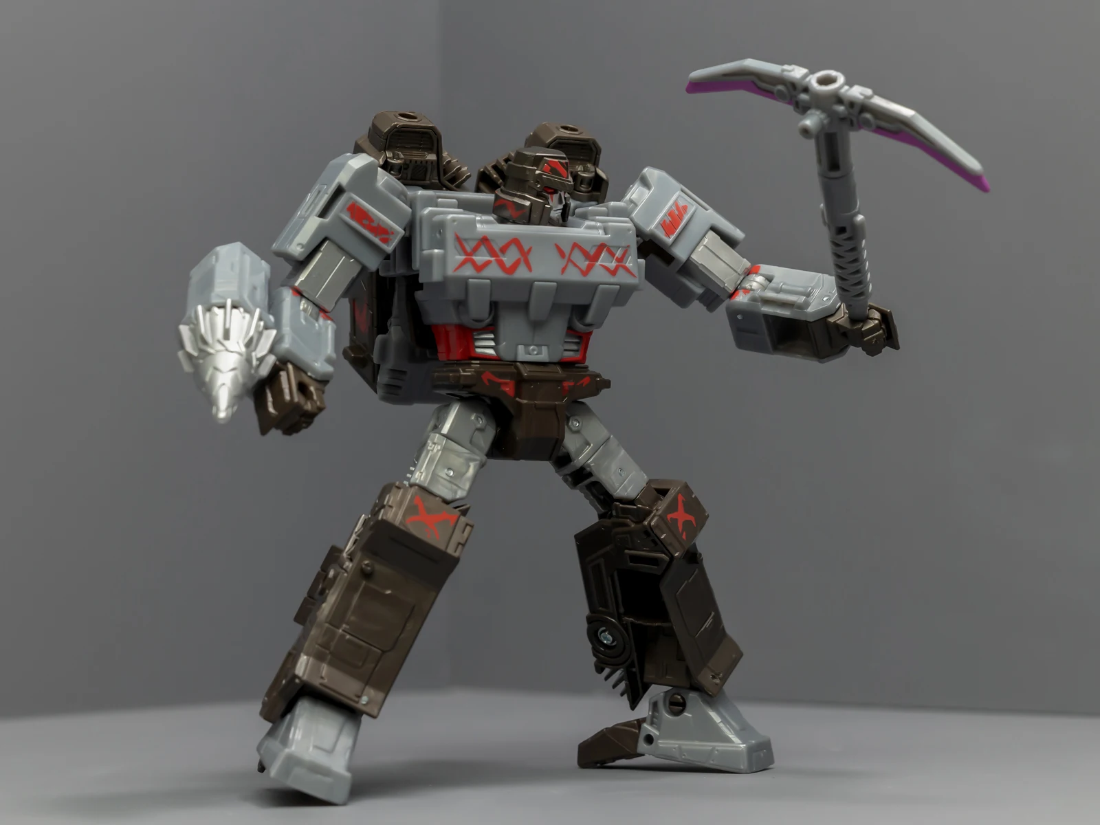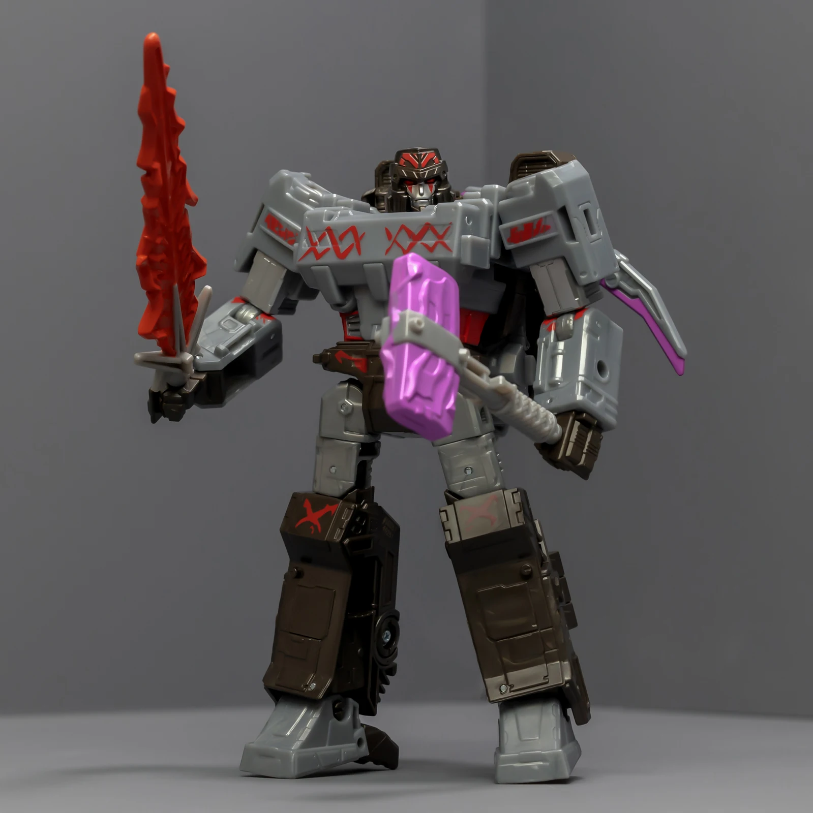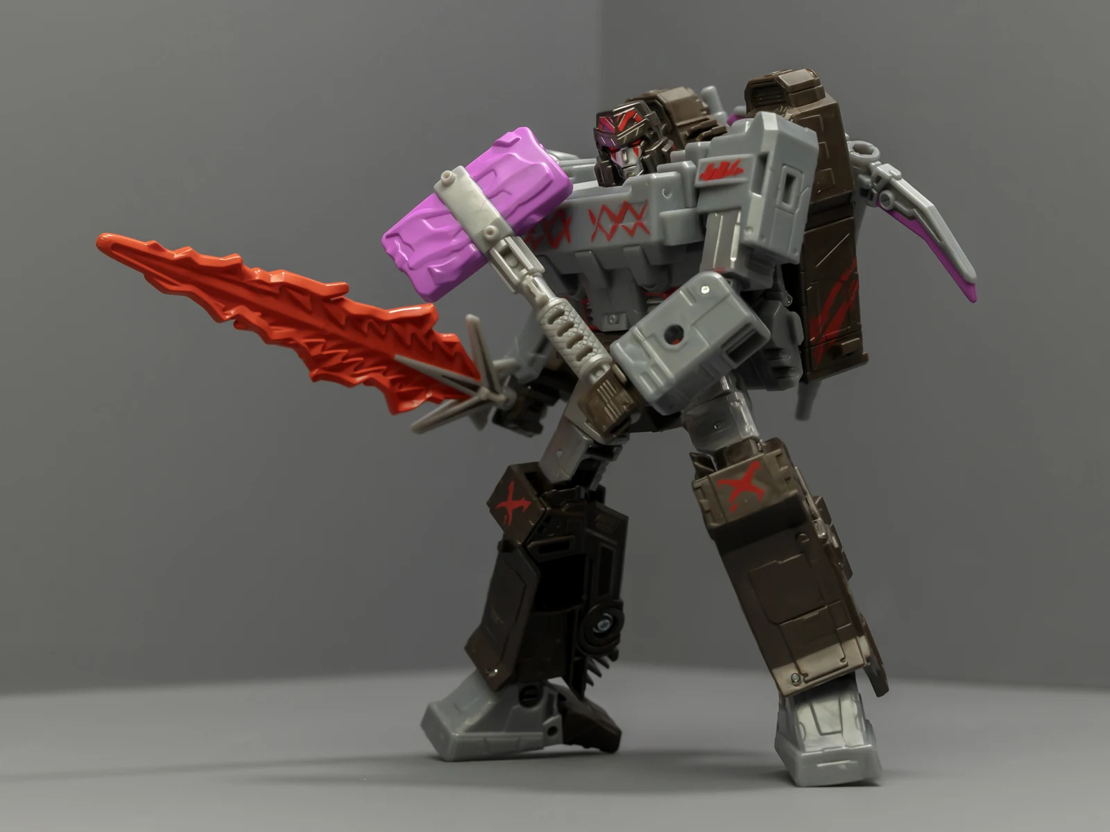 威震天上半身很帅,正邪气质相结合。下半身很拉垮,可动性不够,稳定性也不够,脚上有接地关节但跟没有没差别。威震天有矿工的设定,武器是锤子、矿工镐、电钻,但涂装采用了更加经典的配色,还带有一把火焰剑。这几件武器非常离谱,锤子居然是粉紫色的,矿工镐也有着粉紫色的刃面,设计师你是色盲吗?这颜色看着跟没上好色的贴图错误似的,完全没有矿坑里的那种重工业油污感,反而像是什么魔法少女的道具,拿在老威手里违和感爆棚。