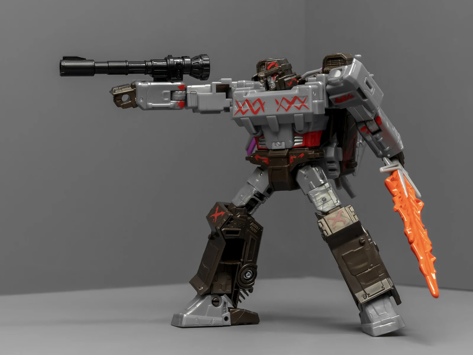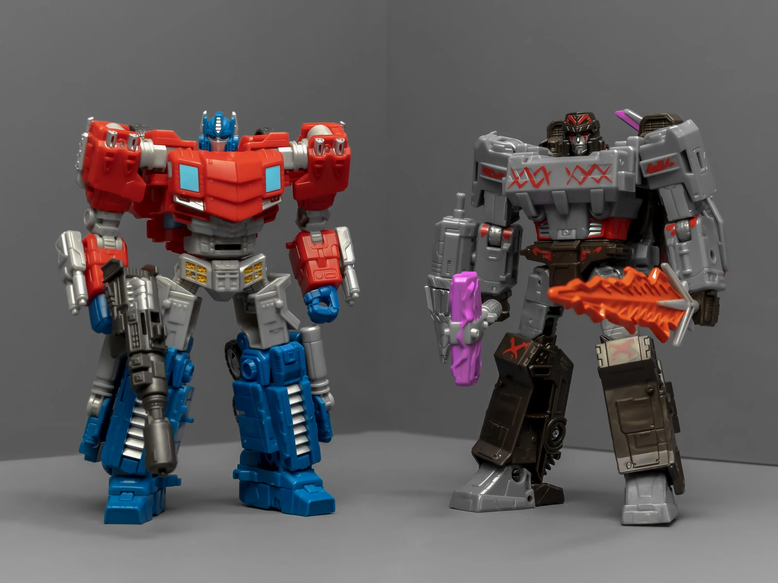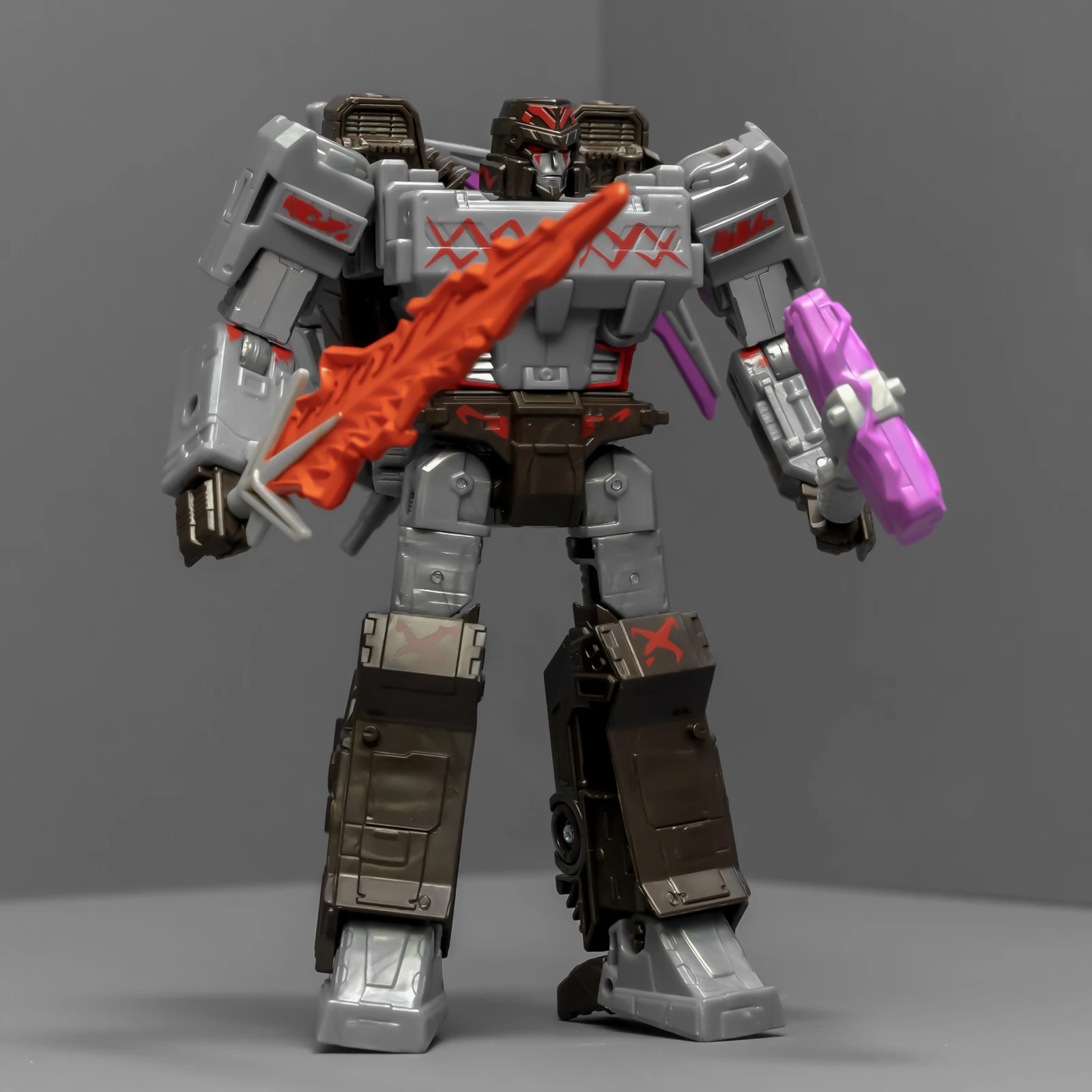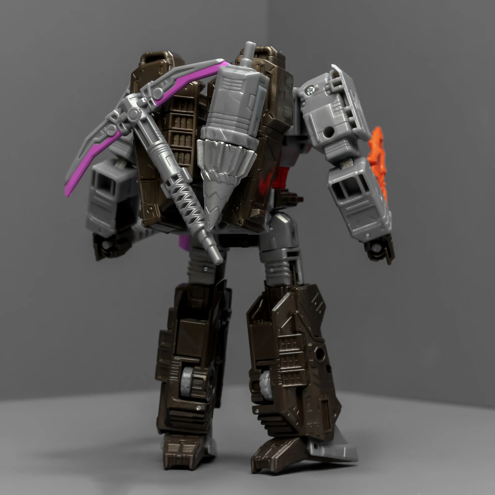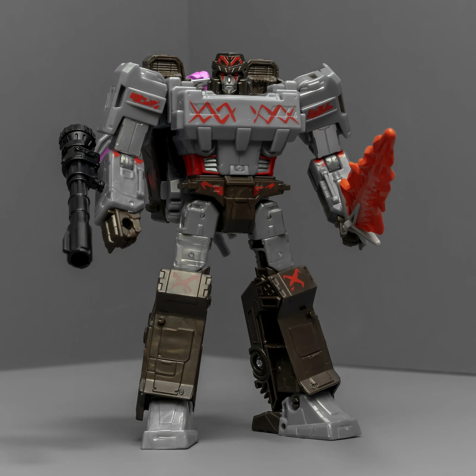威震天上半身很帅,正邪气质相结合。下半身很拉垮,可动性不够,稳定性也不够,脚上有接地关节但跟没有没差别。威震天有矿工的设定,武器是锤子、矿工镐、电钻,但涂装采用了更加经典的配色,还带有一把火焰剑。这几件武器非常离谱,锤子居然是粉紫色的,矿工镐也有着粉紫色的刃面,设计师你是色盲吗?这颜色看着跟没上好色的贴图错误似的,完全没有矿坑里的那种重工业油污感,反而像是什么魔法少女的道具,拿在老威手里违和感爆棚。