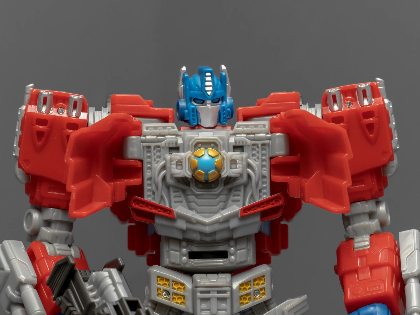 奥利安是SS系列的WFC重制版擎天柱改模重涂作品,所以他有个古怪的超宽肩膀,一点也不像一个年轻的警员,倒像是个刚从健身房撸铁出来的猛男,不过考虑到他后来能当大哥,壮点也能理解。这套下半身的接地性倒是很好,玩起来比老威舒服多了。有趣的是WFC擎天柱胸口的能源宝也保留了下来,但是这位是奥利安,难道能源宝是从娘胎里带出来的吗?其实你是宝玉哥哥?