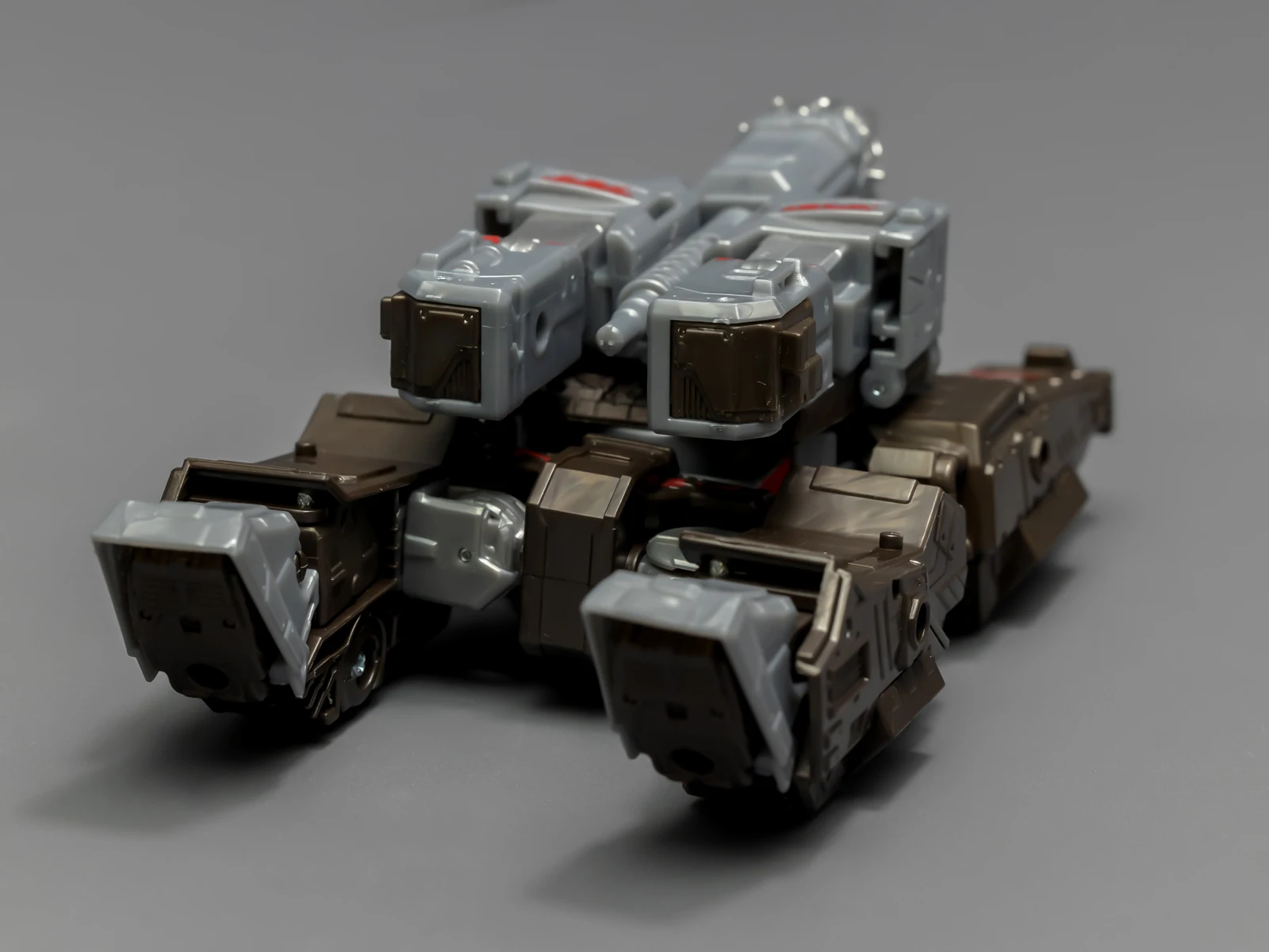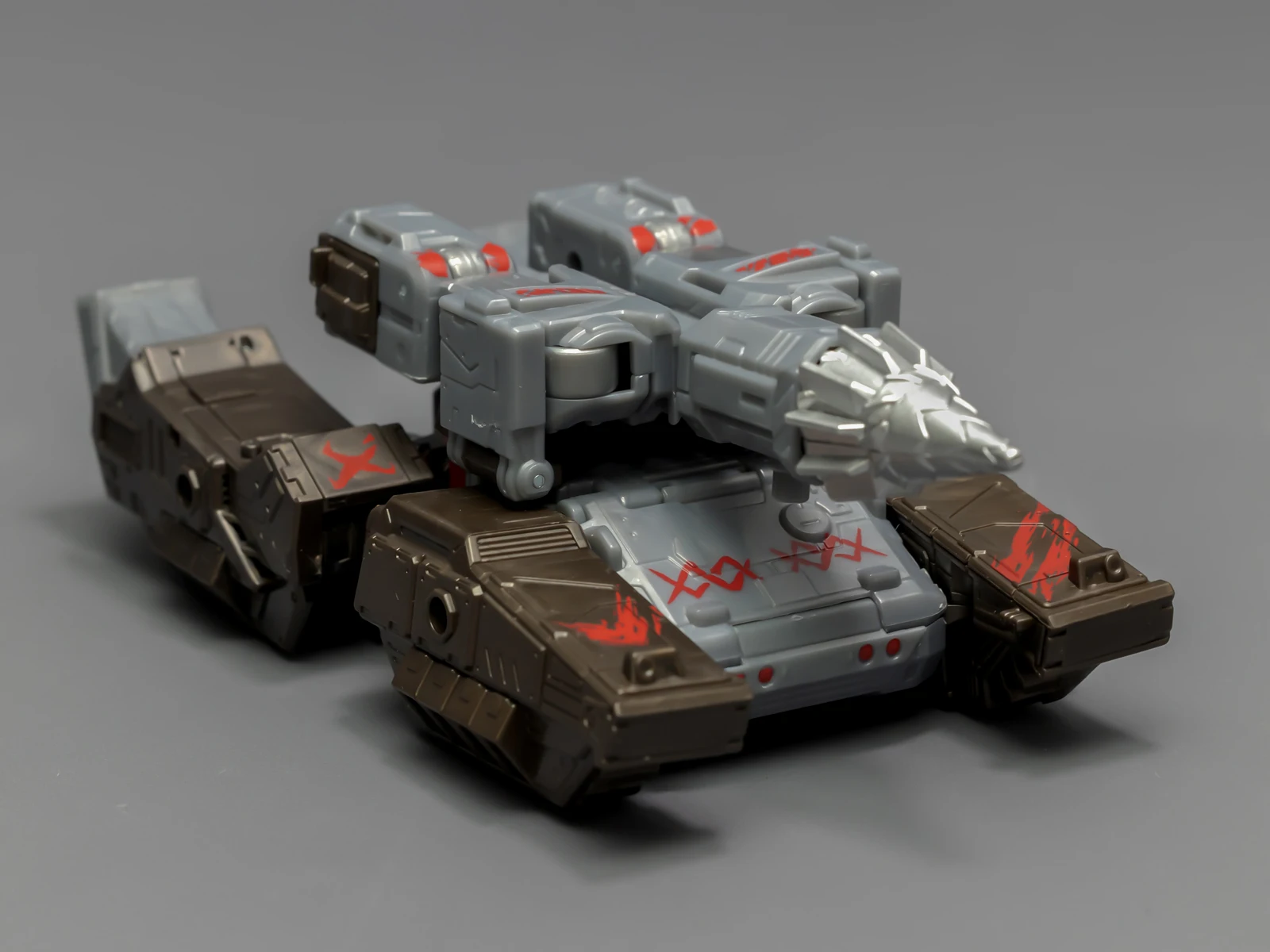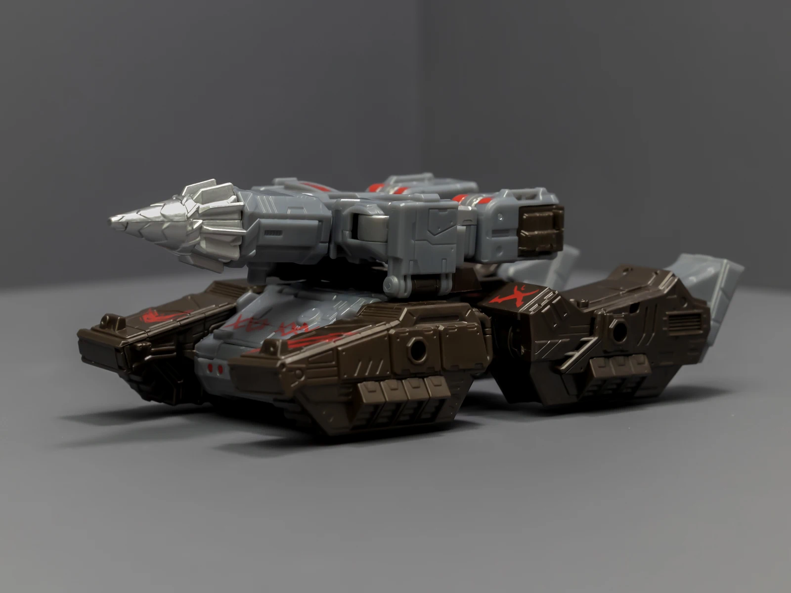 这个威震天来自围城系列威震天的重涂改模,除了上述人形问题,坦克形态也很差,整体松散,外观线条诡异,像是两条超长的腿装成履带夹着一个炮台。不知道这个模具有什么好,让孩之宝多次反复重涂、重制。要不是为了奥利安,我肯定看都不会看这只威震天。